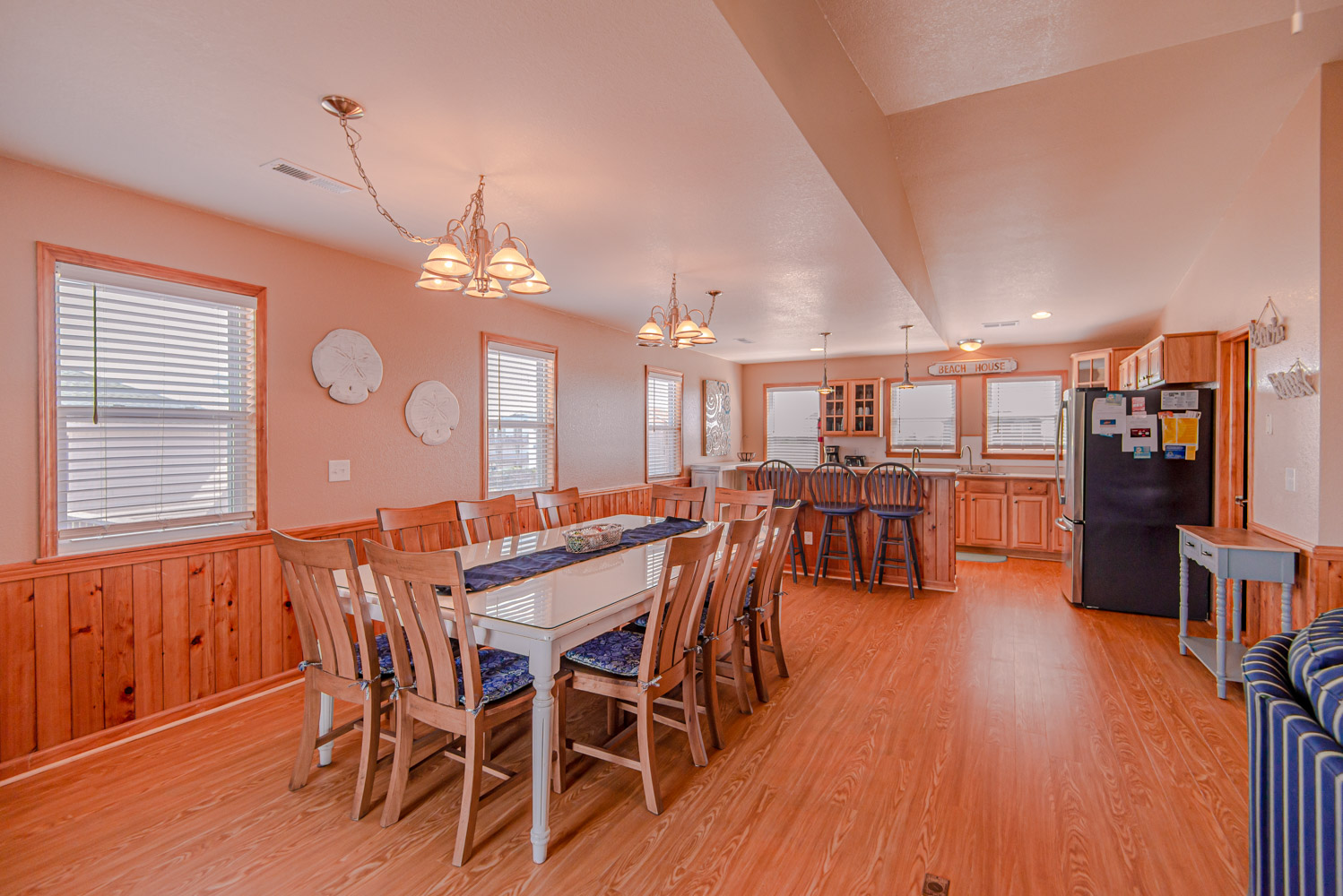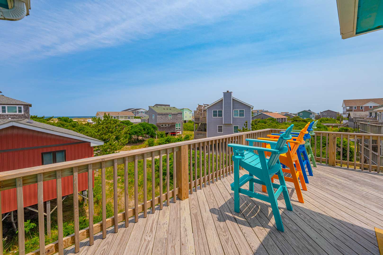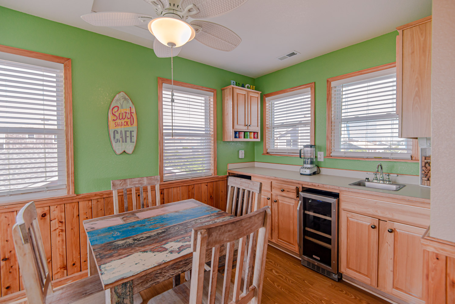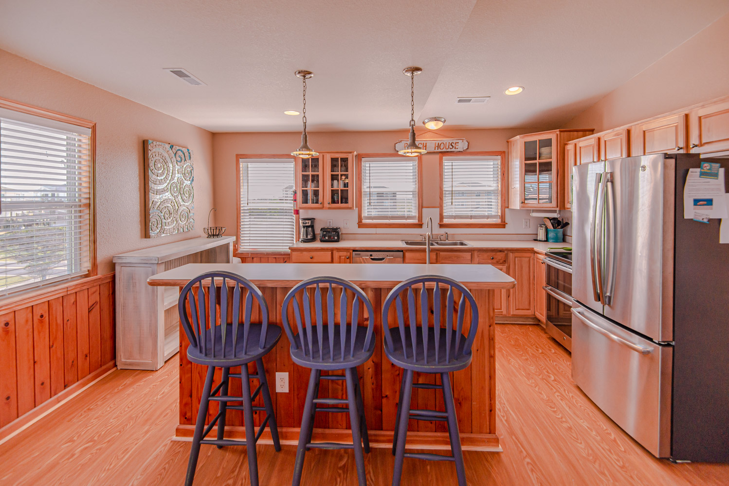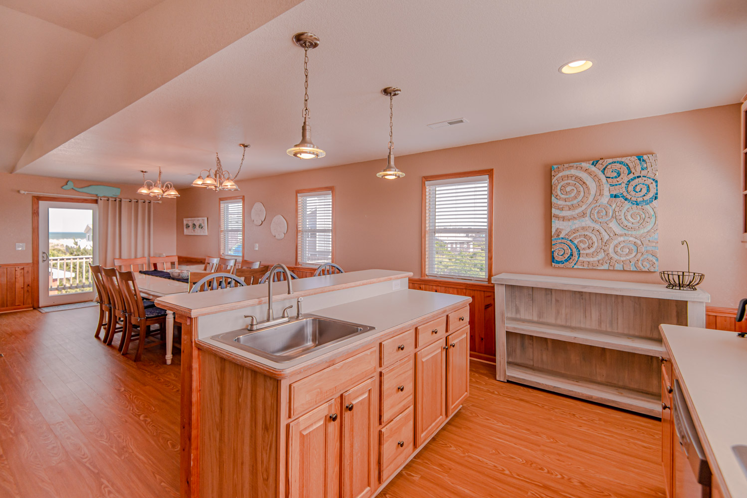 Top Level: Spacious Living Area, TV, Fully Equipped Kitchen Area w/Bar Seating for Three (3), Dining Area w/Seating for Ten (10), Breakfast Nook w/Seating for Four (4), Bar Area w/Wine Cooler and Beverage Refrigerator, Half Bath, Private Suite w/King, TV, and Full Bath w/Walk-in Tiled Shower, and Sun Deck w/Deck Furniture and Ocean Views.