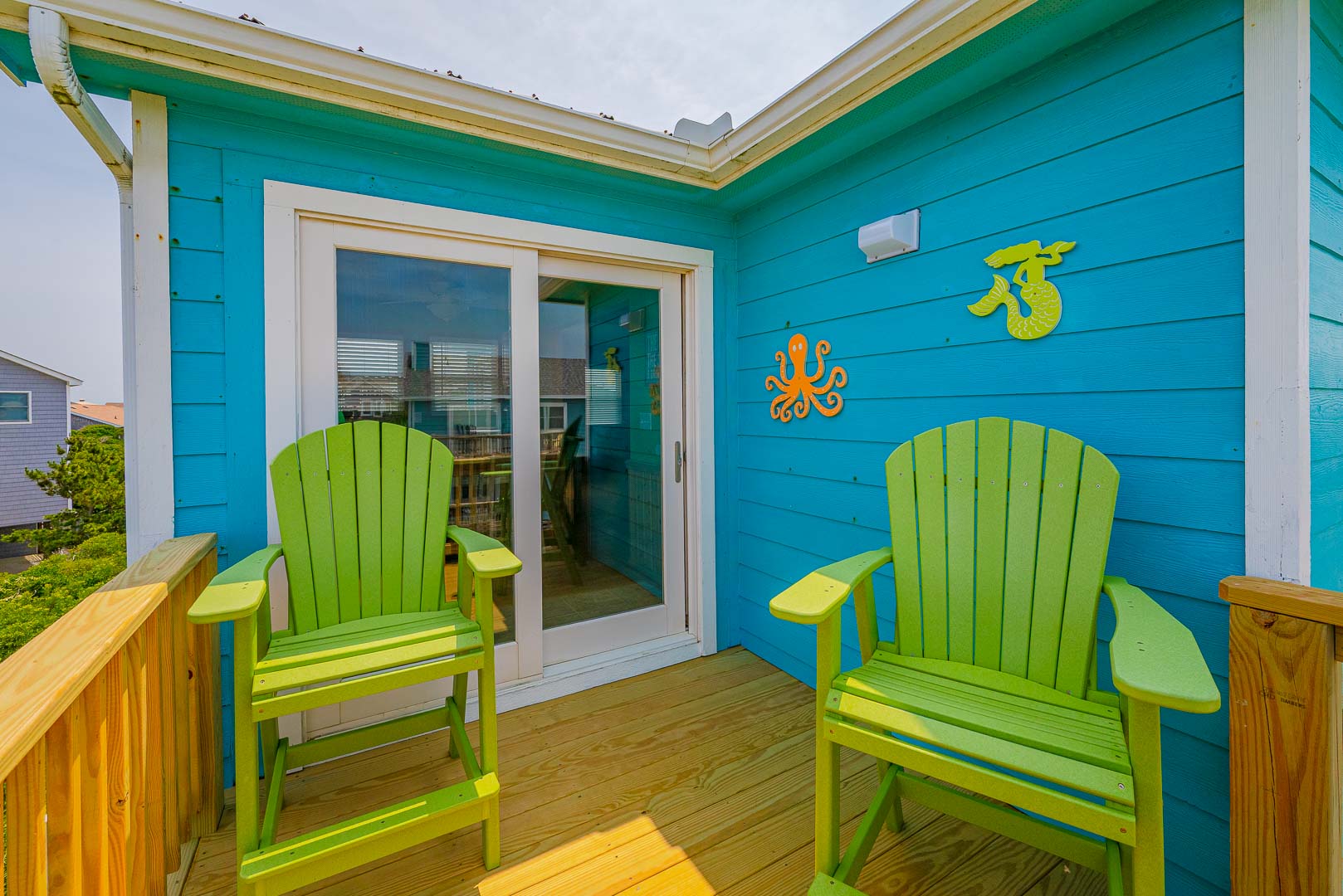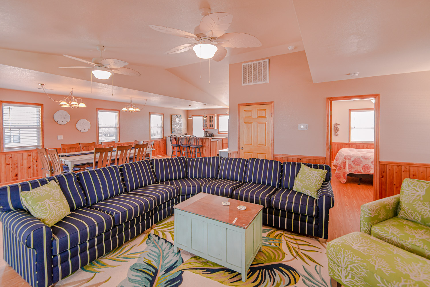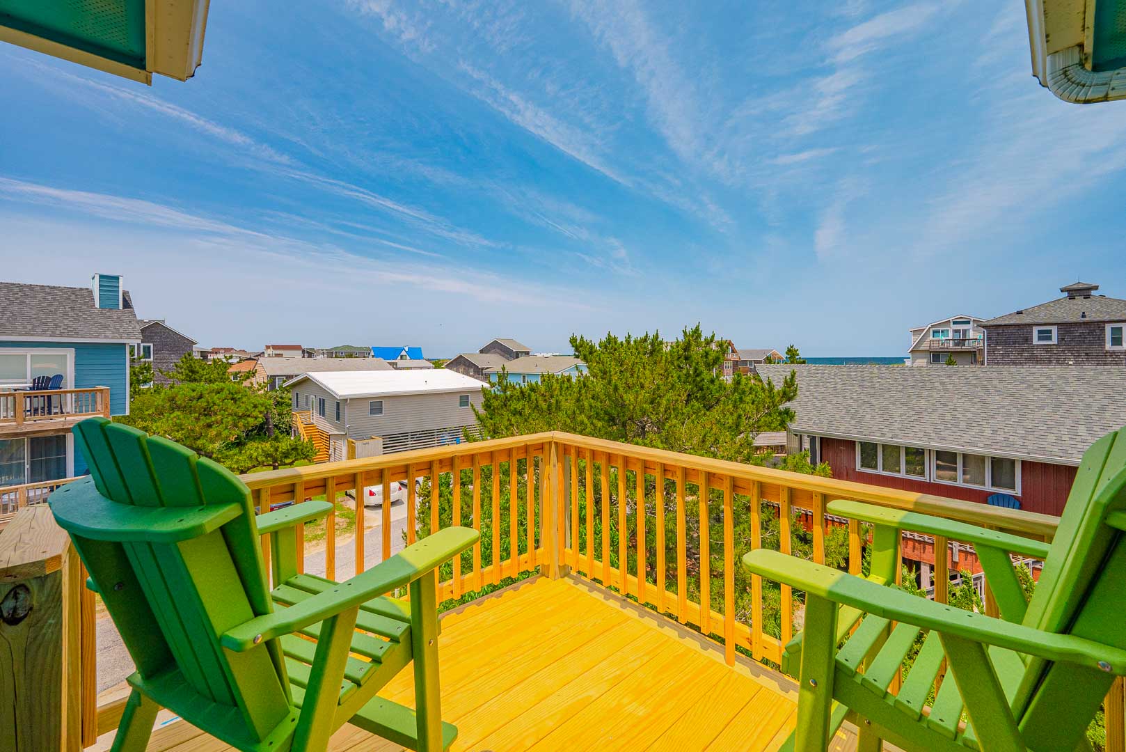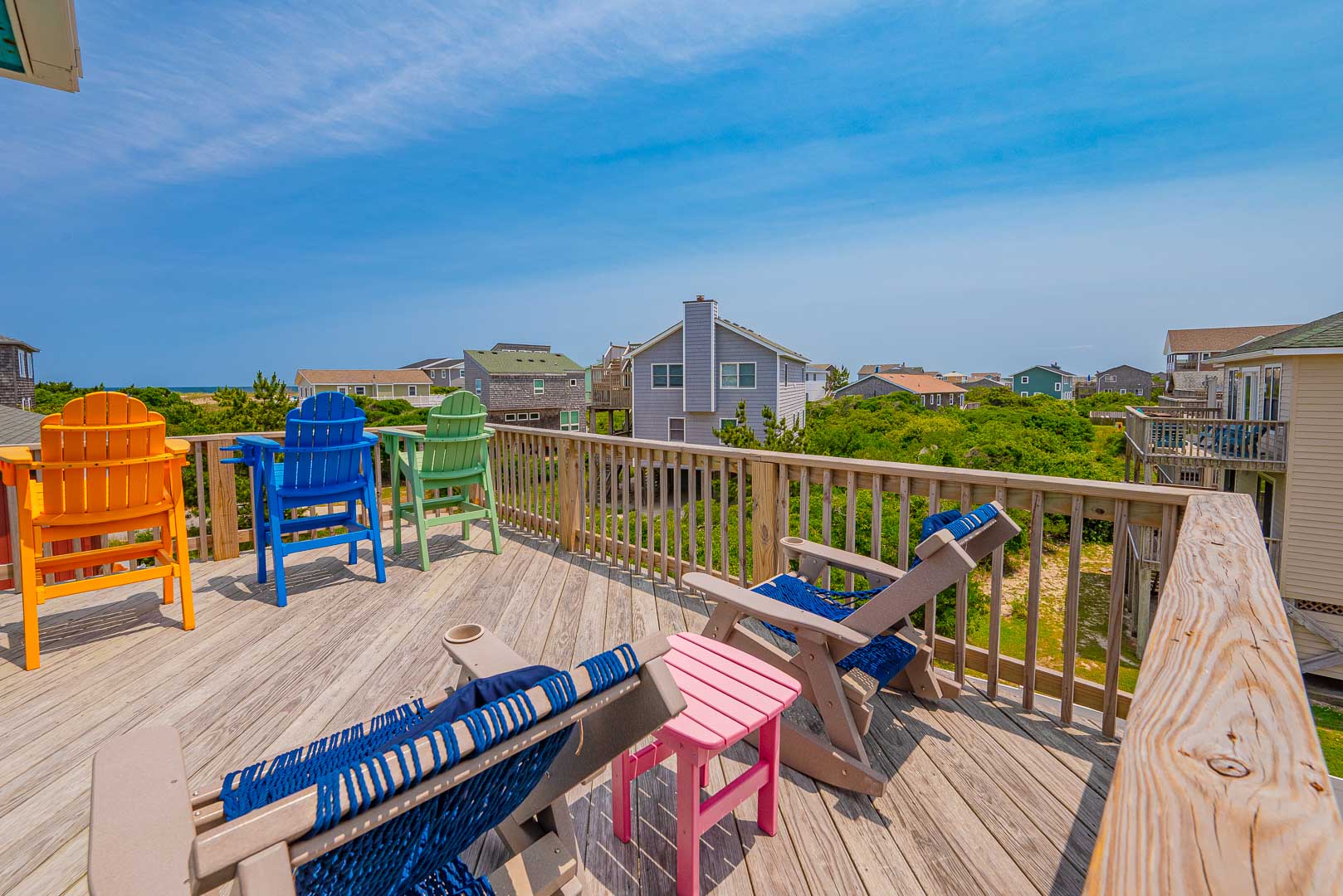 Top Level: Spacious Living Area, TV, Fully Equipped Kitchen Area w/Bar Seating for Three (3), Dining Area w/Seating for Ten (10), Breakfast Nook w/Seating for Four (4), Bar Area w/Wine Cooler and Beverage Refrigerator, Half Bath, Private Suite w/King, TV, and Full Bath w/Walk-in Tiled Shower, and Sun Deck w/Deck Furniture and Ocean Views.