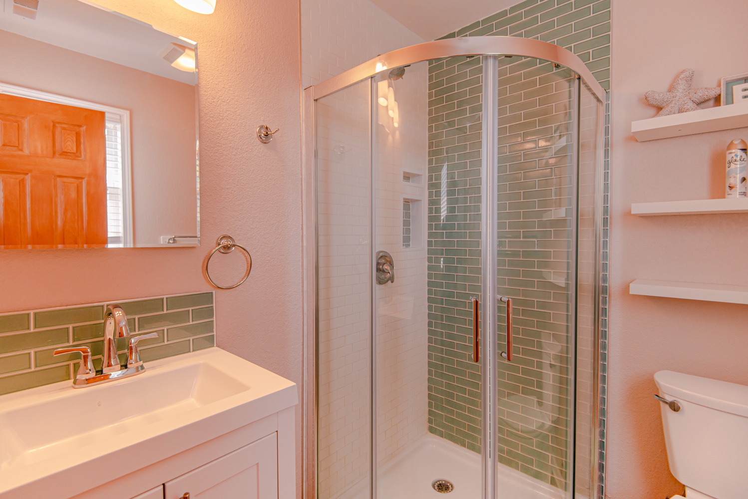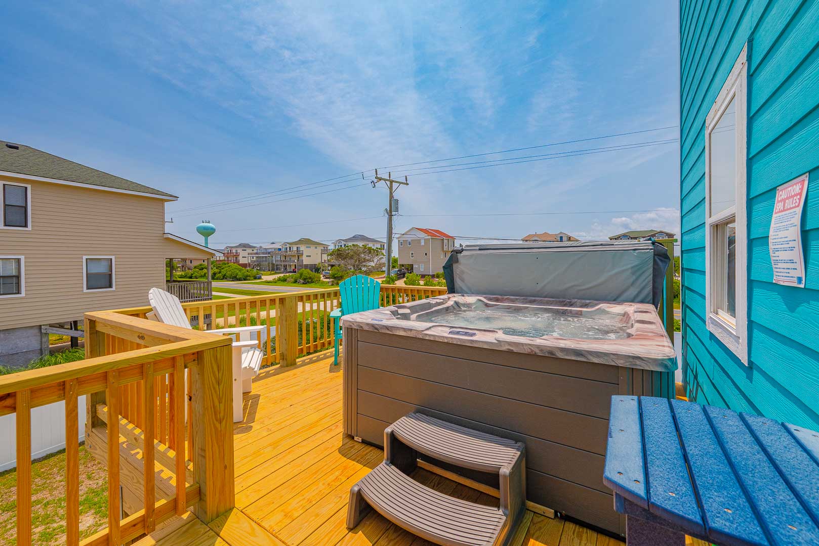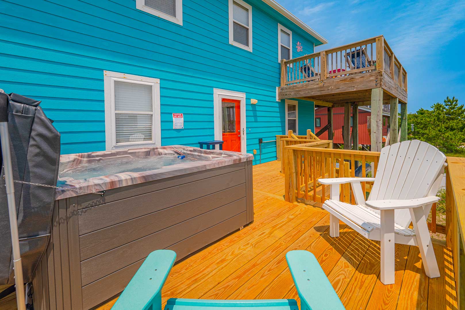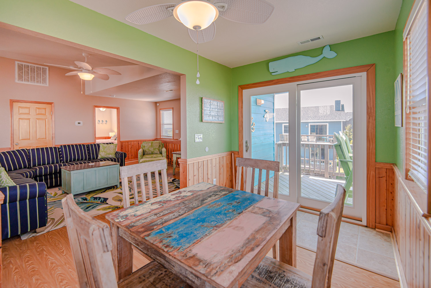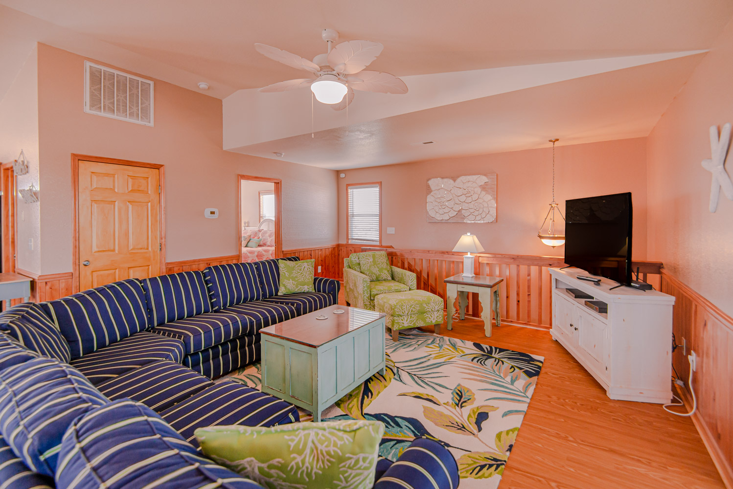 Top Level: Spacious Living Area, TV, Fully Equipped Kitchen Area w/Bar Seating for Three (3), Dining Area w/Seating for Ten (10), Breakfast Nook w/Seating for Four (4), Bar Area w/Wine Cooler and Beverage Refrigerator, Half Bath, Private Suite w/King, TV, and Full Bath w/Walk-in Tiled Shower, and Sun Deck w/Deck Furniture and Ocean Views.
