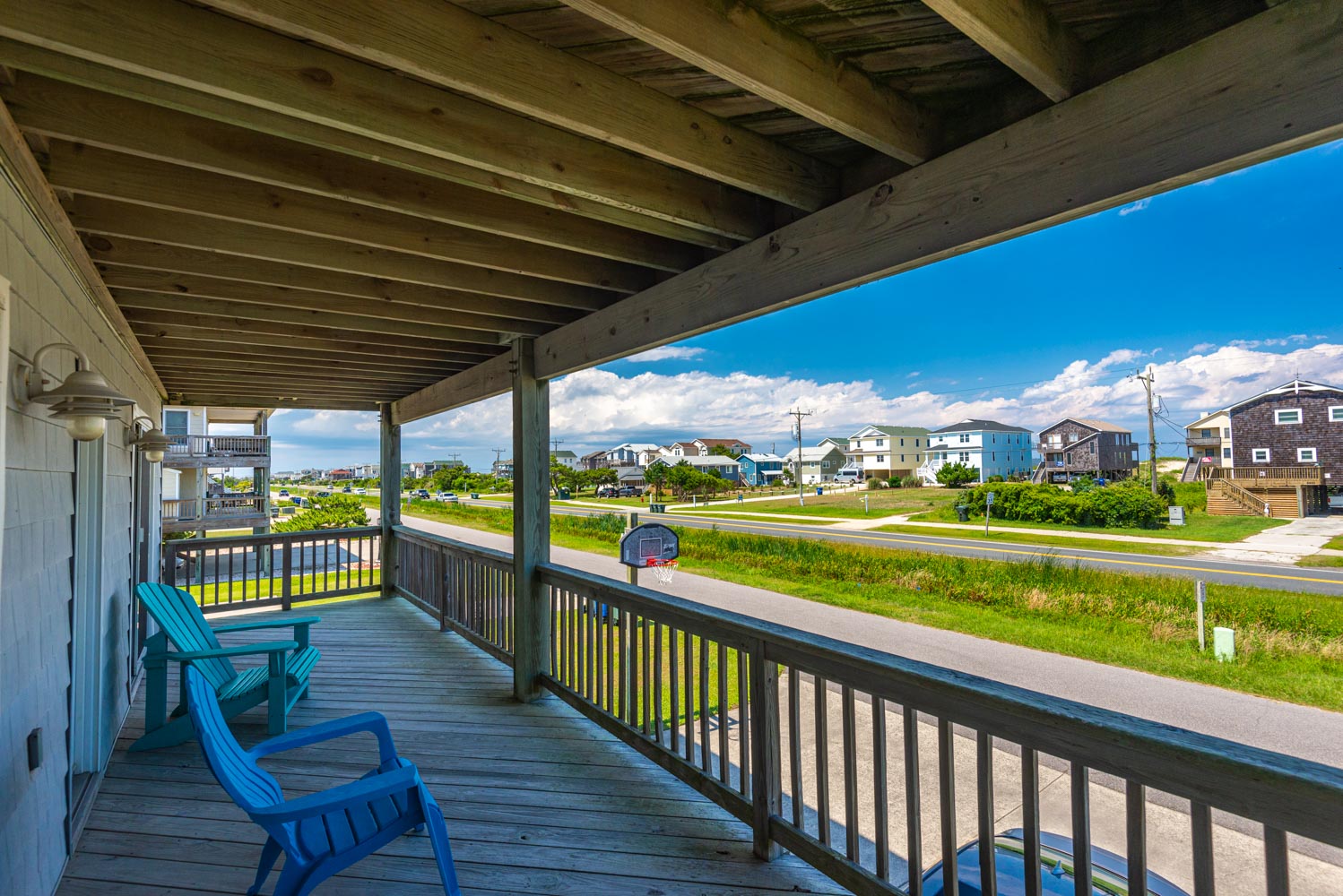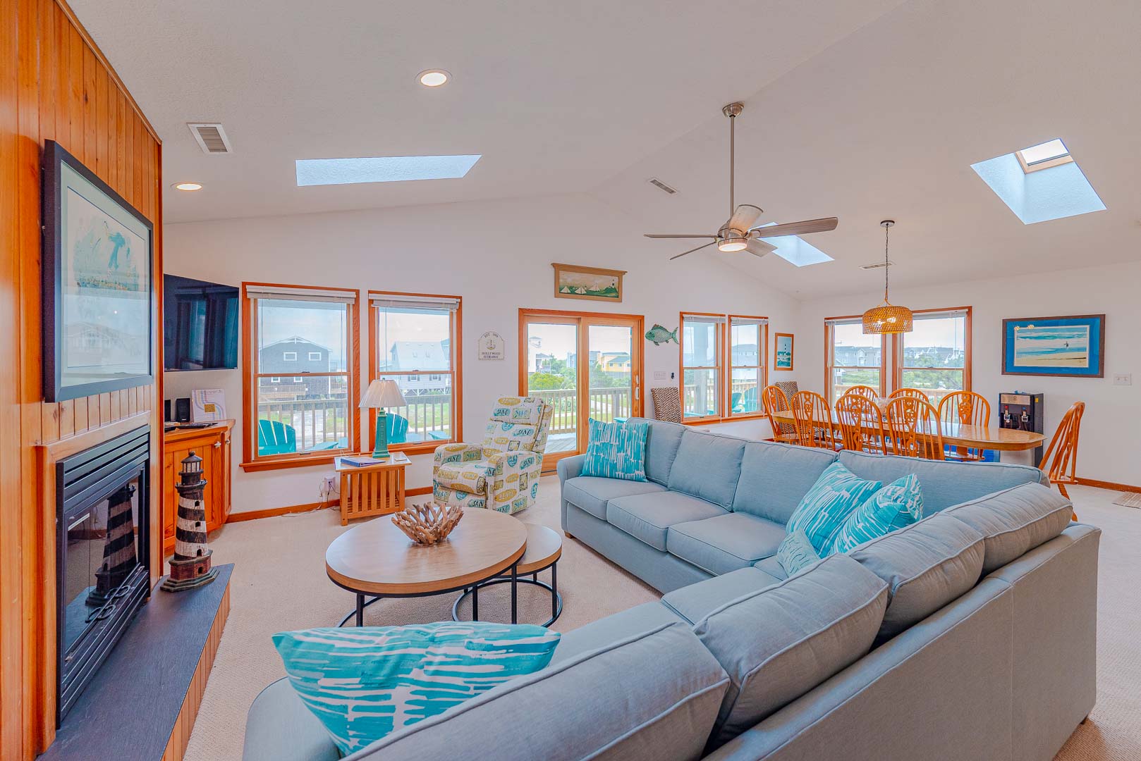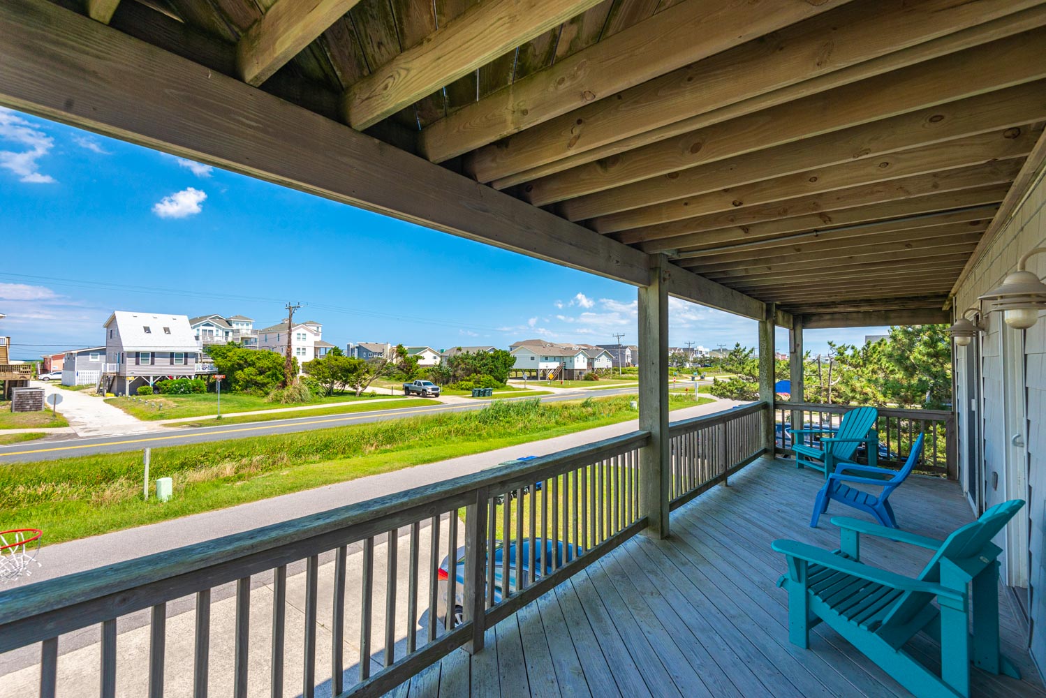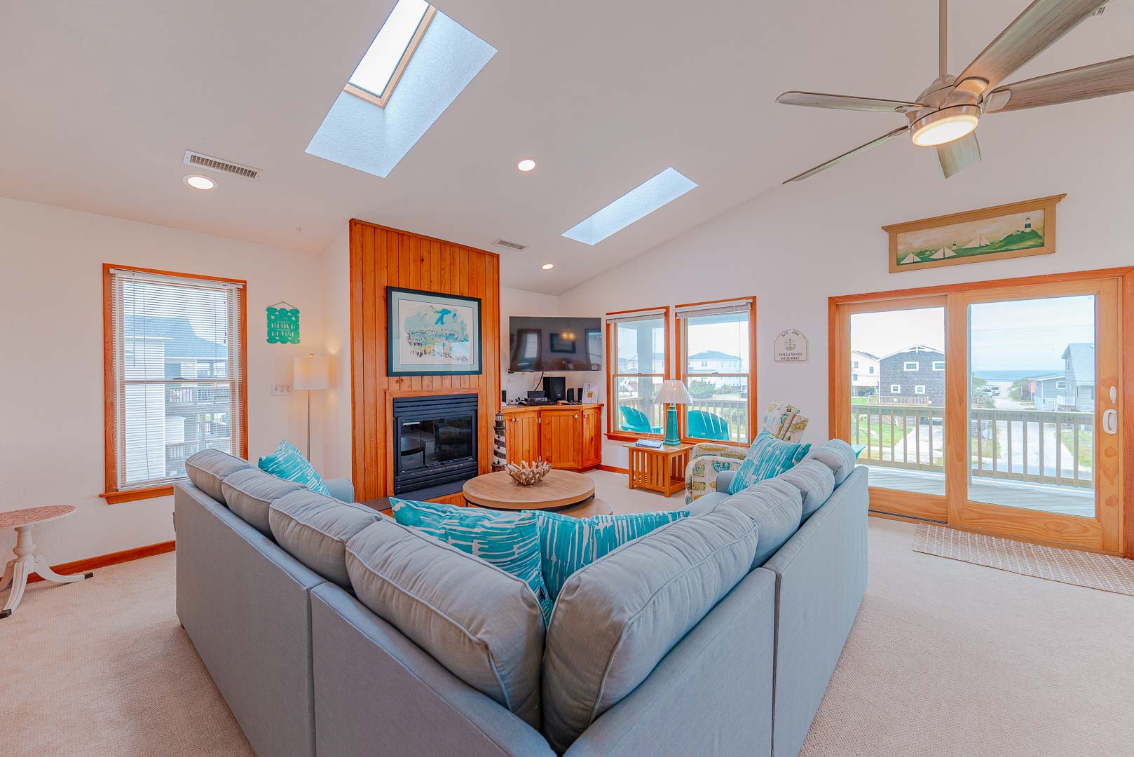 Top Level: Living/Dining/Kitchen Area, TV, Gas Fireplace, Ocean to Sound Views, Full Bath, 2 Private Suites w/Kings, TVs, Full Baths w/Tub/Shower; Covered Deck w/Deck Furniture and Ocean Views, and Sun Deck w/Deck Furniture and Sound Views.