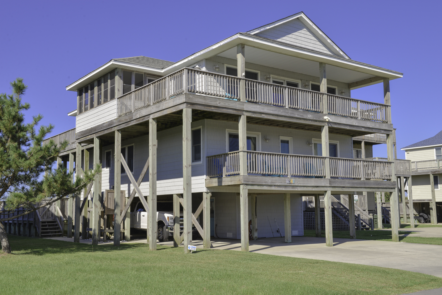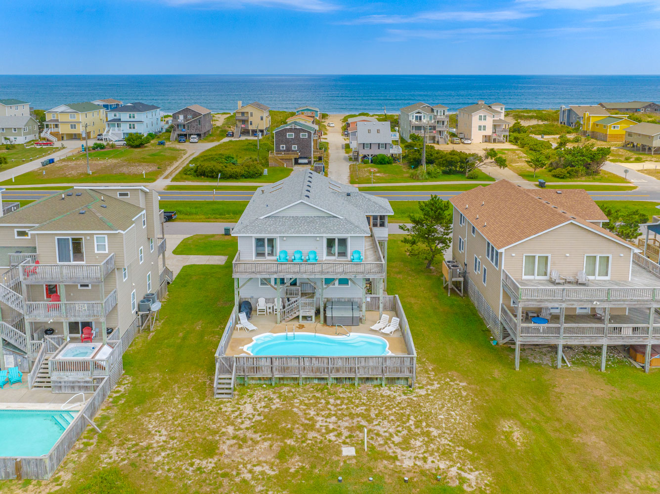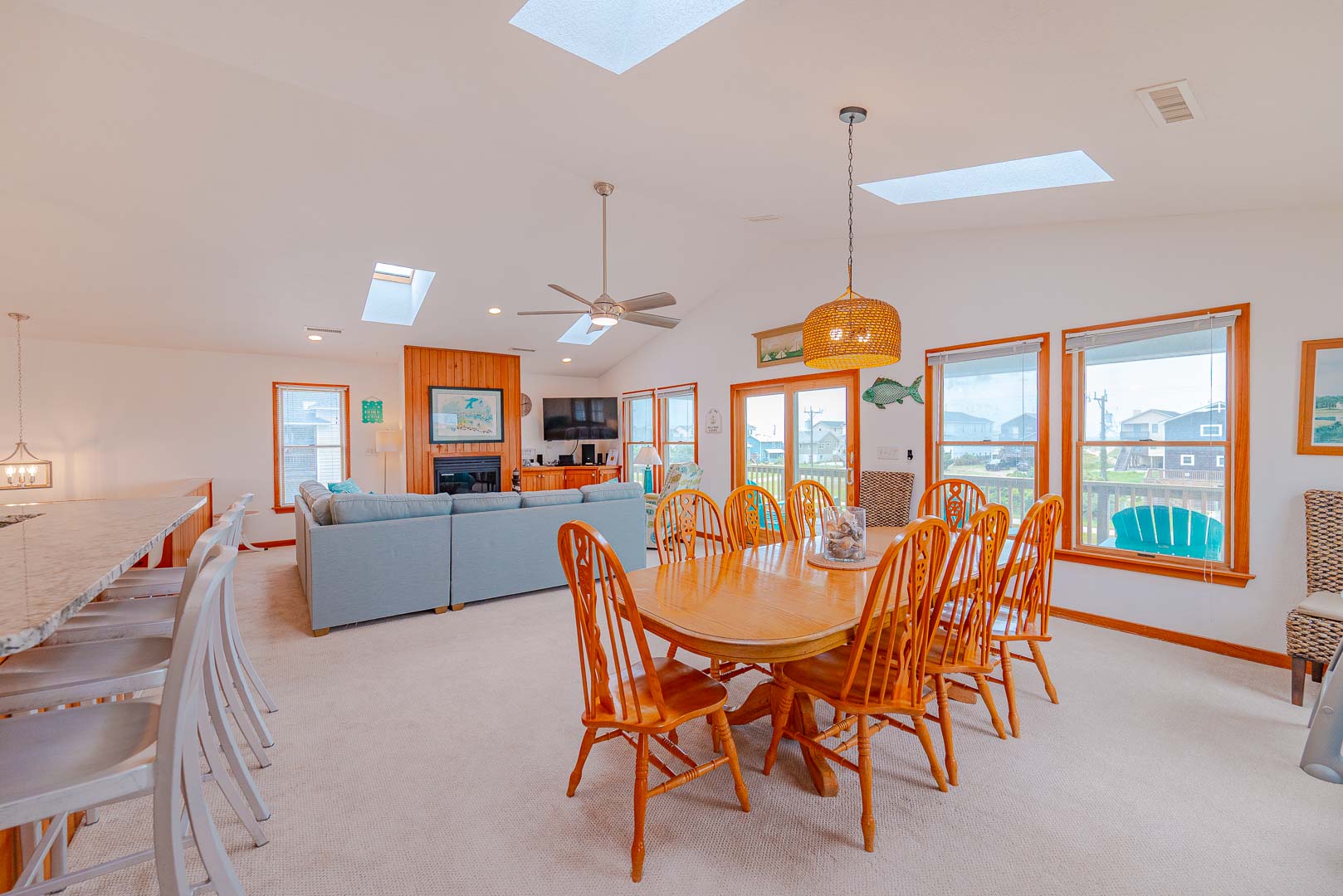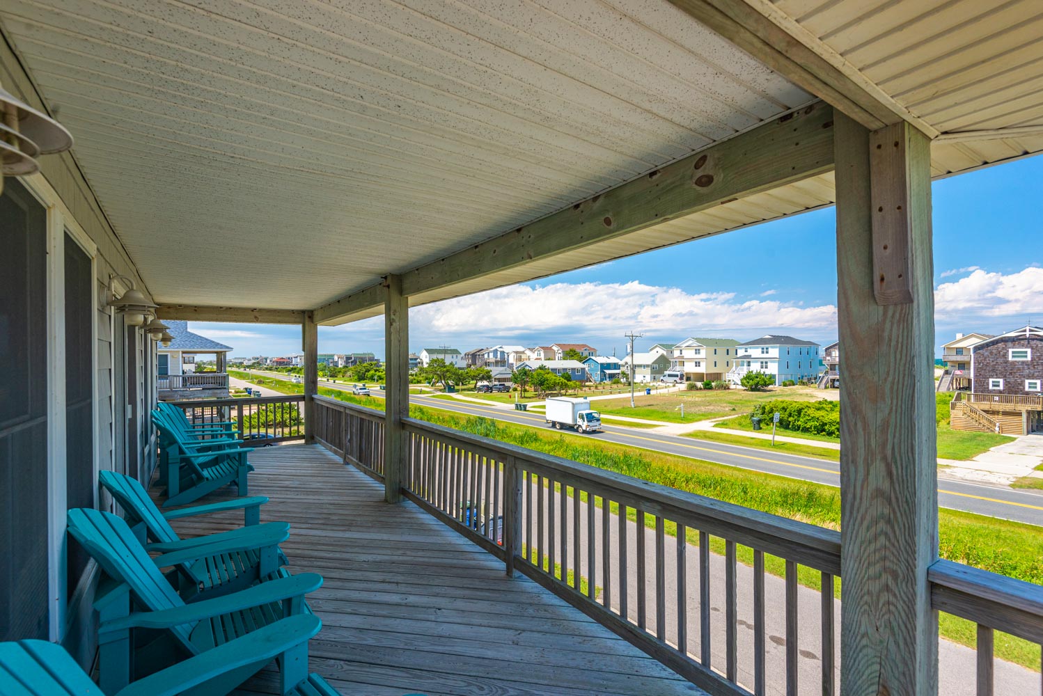 Top Level: Living/Dining/Kitchen Area, TV, Gas Fireplace, Ocean to Sound Views, Full Bath, 2 Private Suites w/Kings, TVs, Full Baths w/Tub/Shower; Covered Deck w/Deck Furniture and Ocean Views, and Sun Deck w/Deck Furniture and Sound Views.
