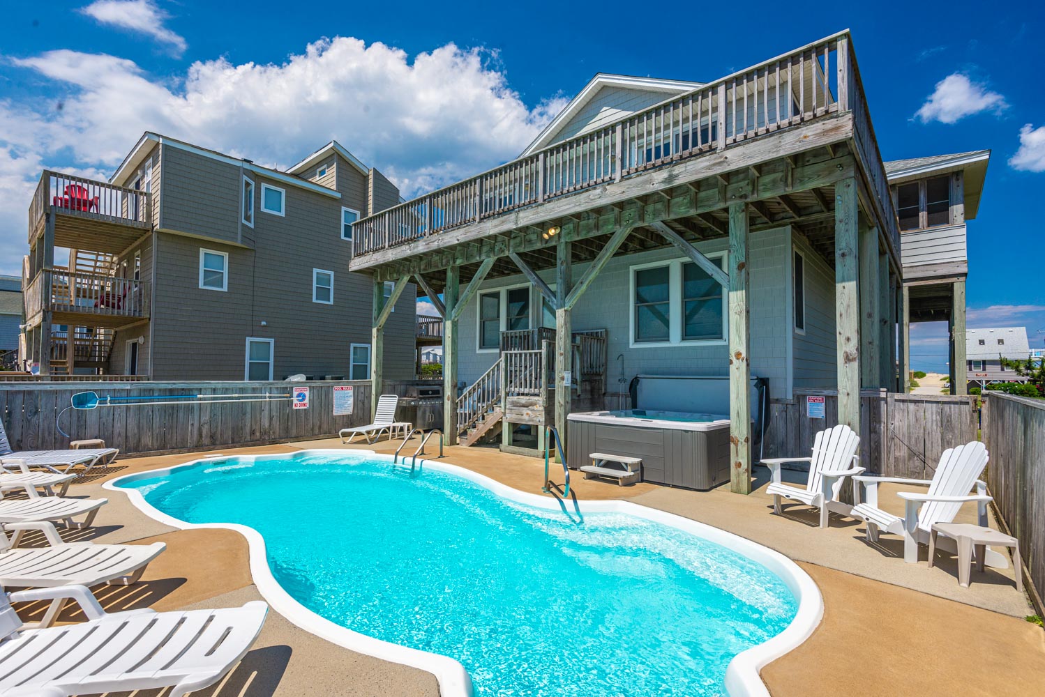 Ground Level: Parking for 5 Cars, Covered Entry, Private 13x29 Swimming Pool - Open Seasonally, Hot Tub, Enclosed Outside Shower, Open Shower by Pool, Picnic Table, and Gas Grill.