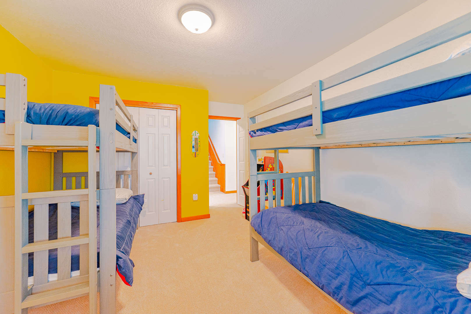Mid Level: Den, TV, Table w/Seating for 4, Wet Bar, Full Size Refrigerator, Hall Half Bath, 4 Bedrooms (Private Suite w/Queen, TV, Full Bath w/Tub; Private Suite w/Queen, Full Bath; 1 w/2 Singles, Jack-n-Jill Full Bath, 1 w/2 Bunk Sets), Full Bath, Laundry Area, and Access to Covered Deck w/Steps to Private Swimming Pool and Hot Tub.