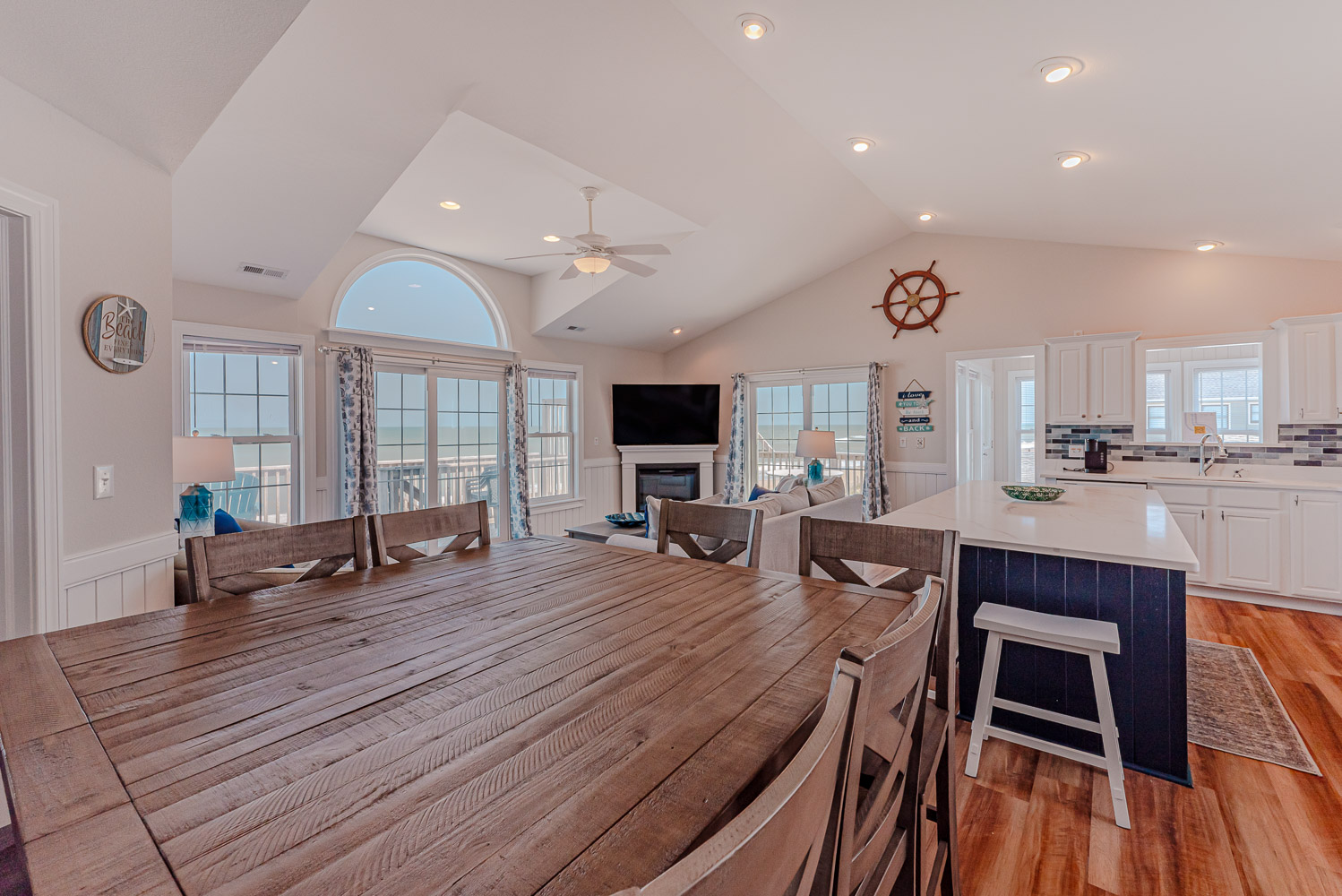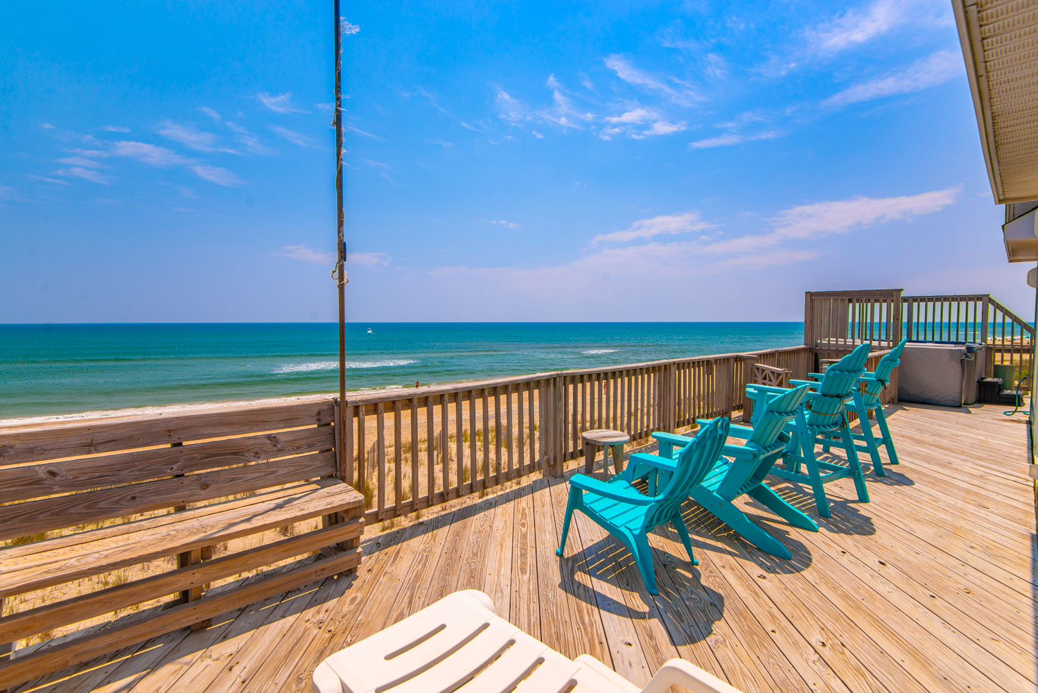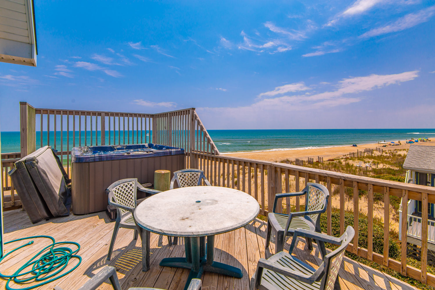Top Level: Living Area, TV, Kitchen Area, Island Bar w/Seating; Dining Area, Beautiful Ocean View, Half Bath, Private Suite w/King, 29 Inch TV, Full Bath w/Walk-In Shower; Sun Room w/Queen Sleep Sofa; and Sun Deck w/Hot Tub, Built-In Benches, and Deck Furniture.