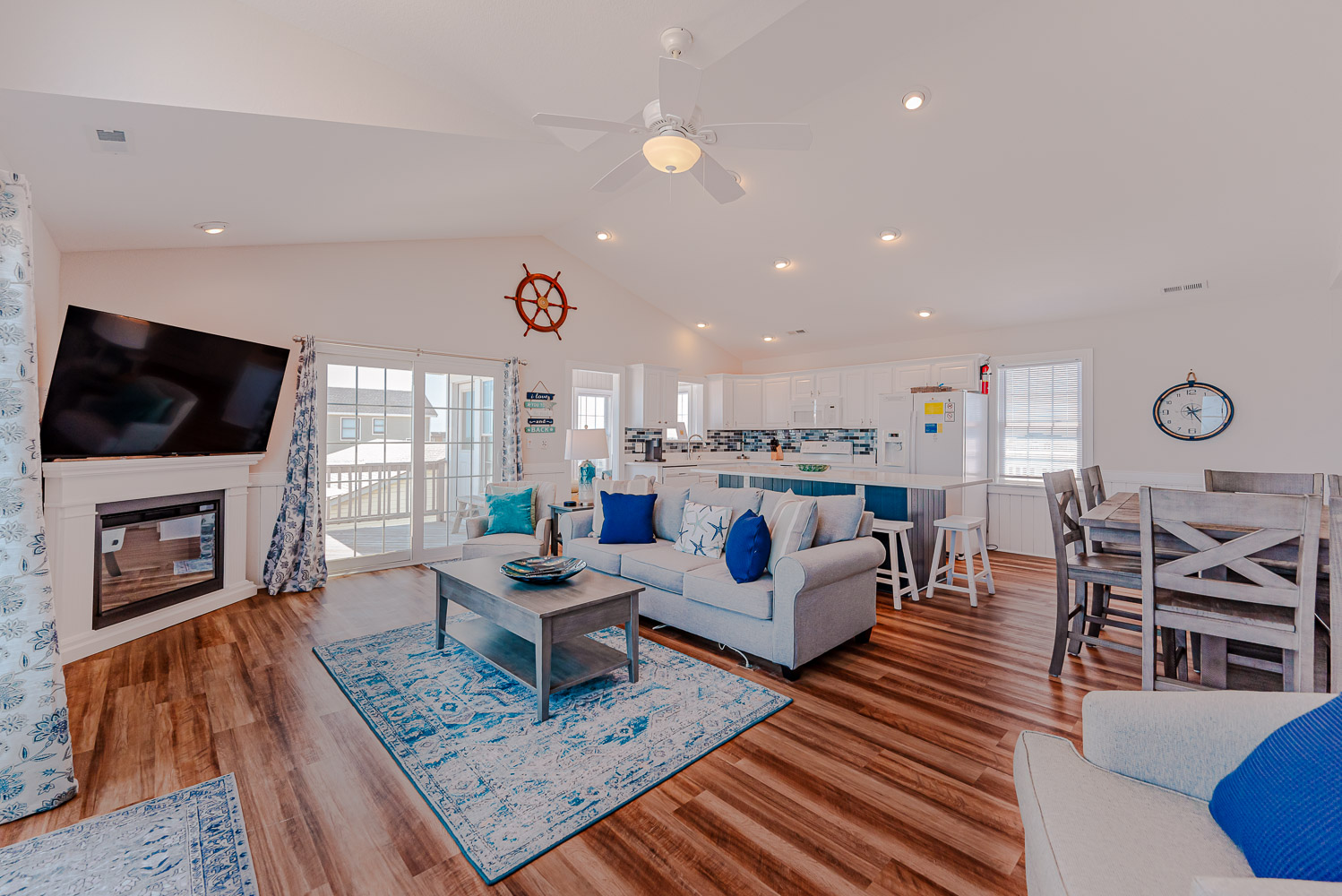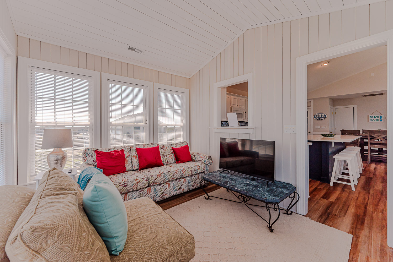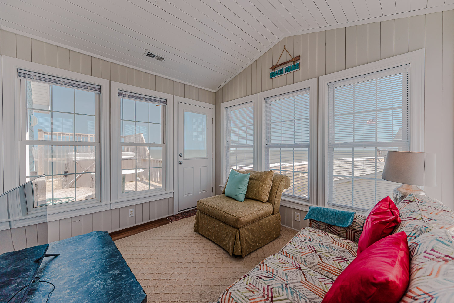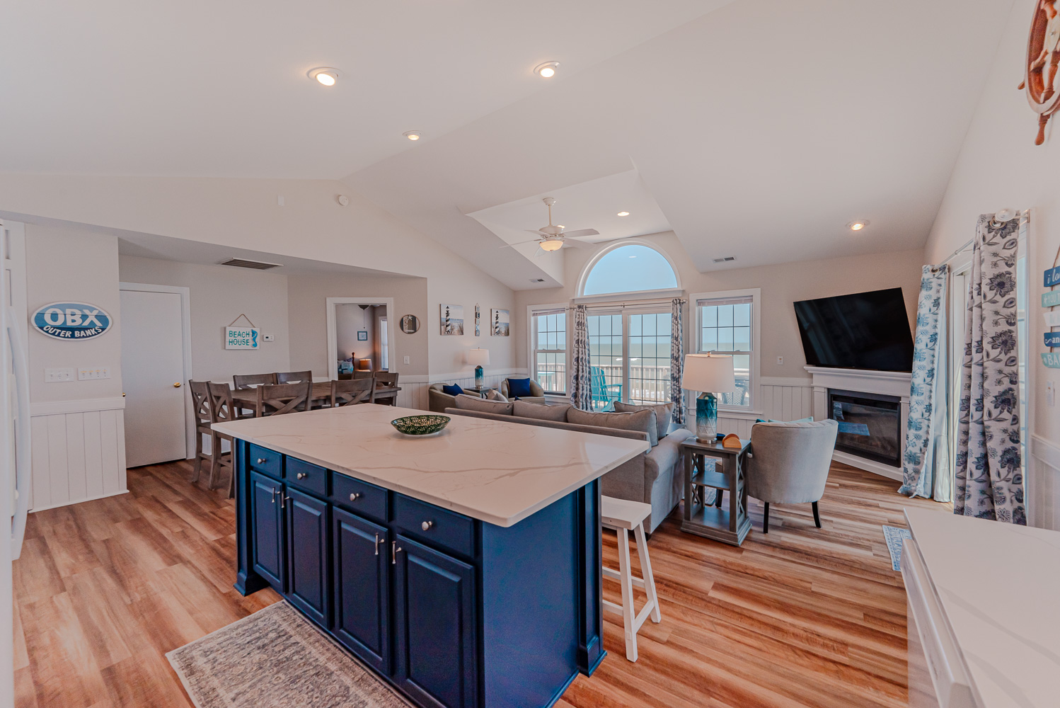 Top Level: Living Area, TV, Kitchen Area, Island Bar w/Seating; Dining Area, Beautiful Ocean View, Half Bath, Private Suite w/King, 29 Inch TV, Full Bath w/Walk-In Shower; Sun Room w/Queen Sleep Sofa; and Sun Deck w/Hot Tub, Built-In Benches, and Deck Furniture.