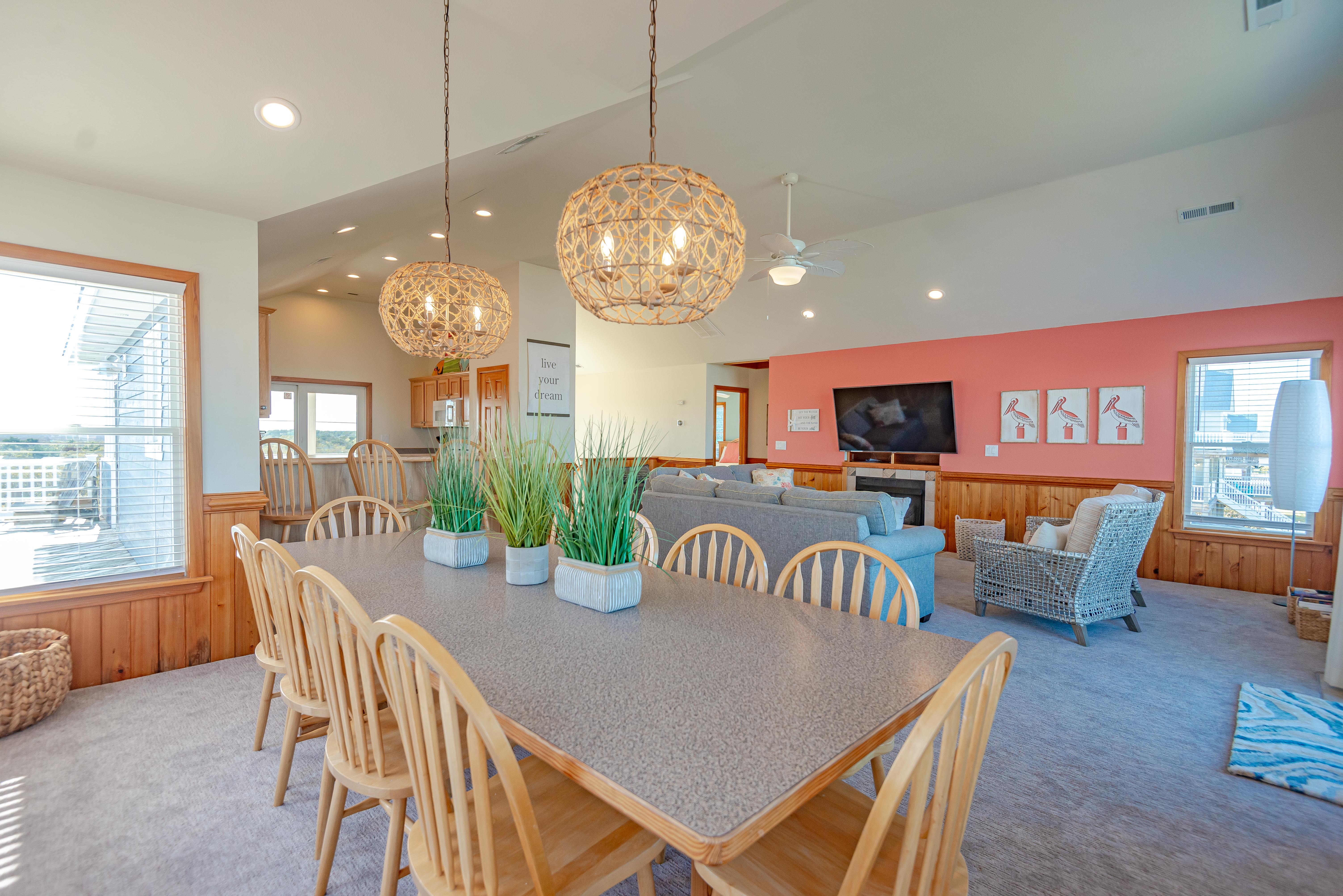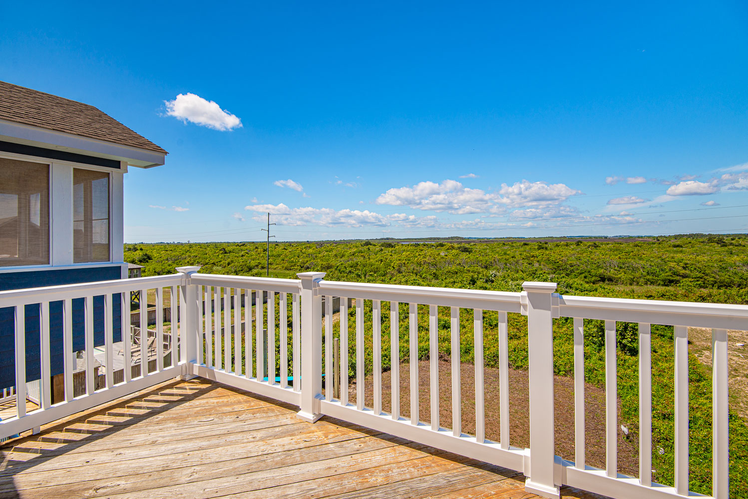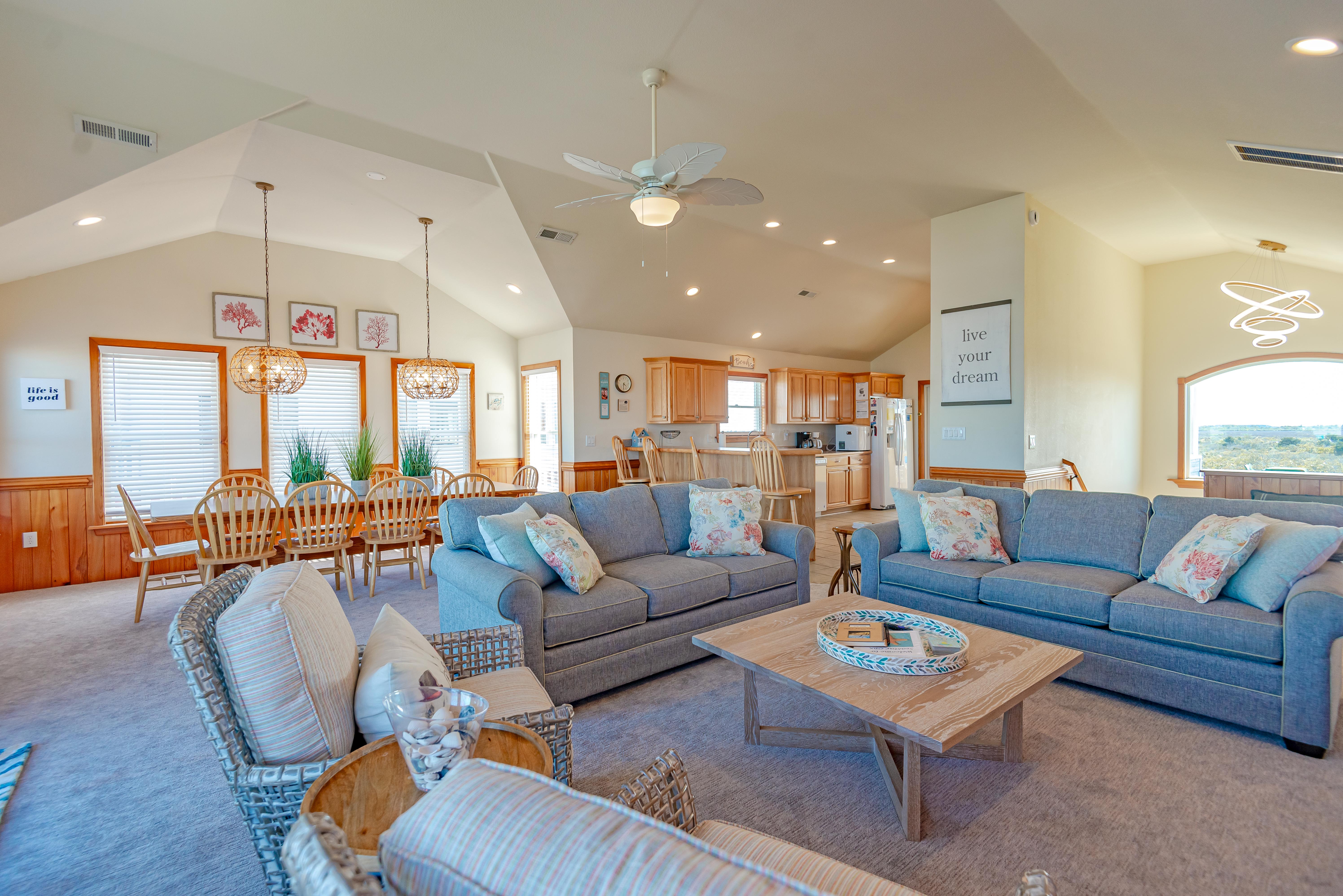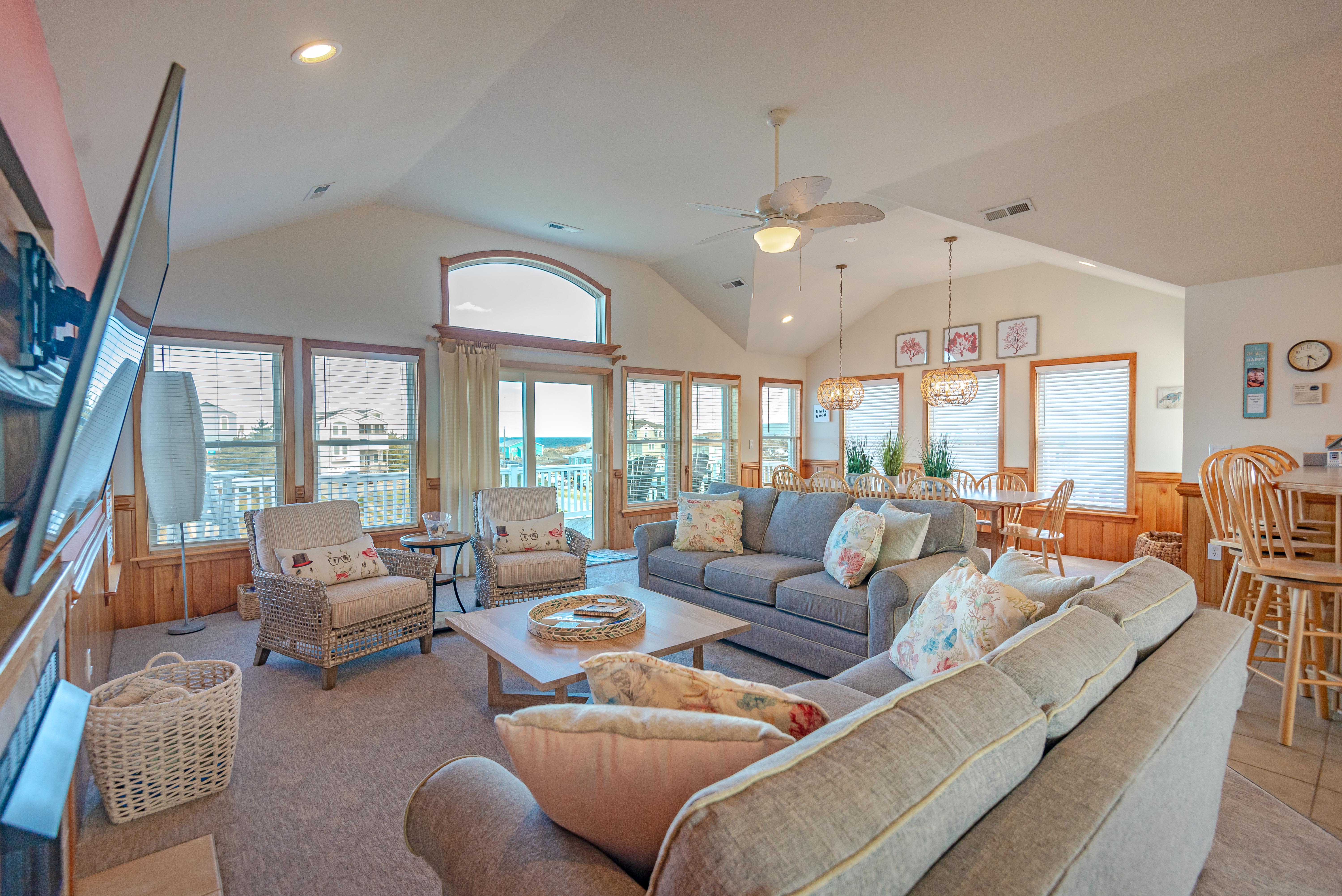Top Level: Spacious, Beautifully Decorated, Well-Equipped Living/Dining/Kitchen Area featuring Fabulous Ocean to Sound Views, 65 Inch Smart TV with Roku with Cable Access, Half Bath, Screened Porch, Large Wrap-Around Sun Deck, and Private Suite w/King, Flat Screen TV w/Roku with Cable Access, and Full Bath.