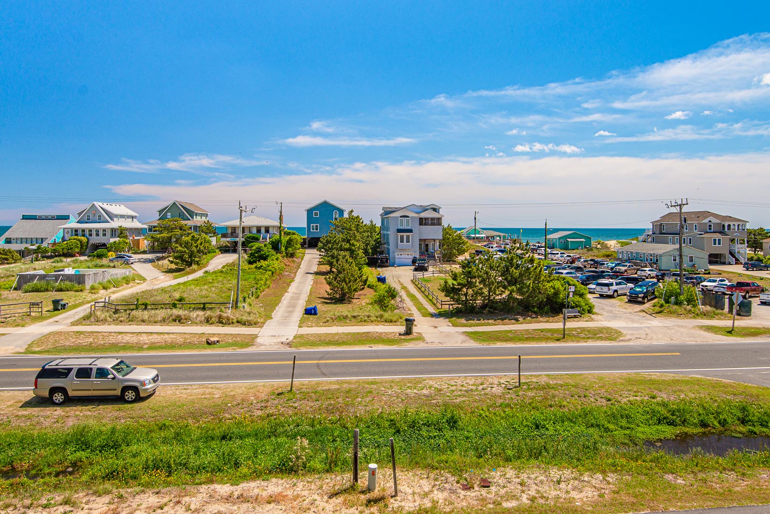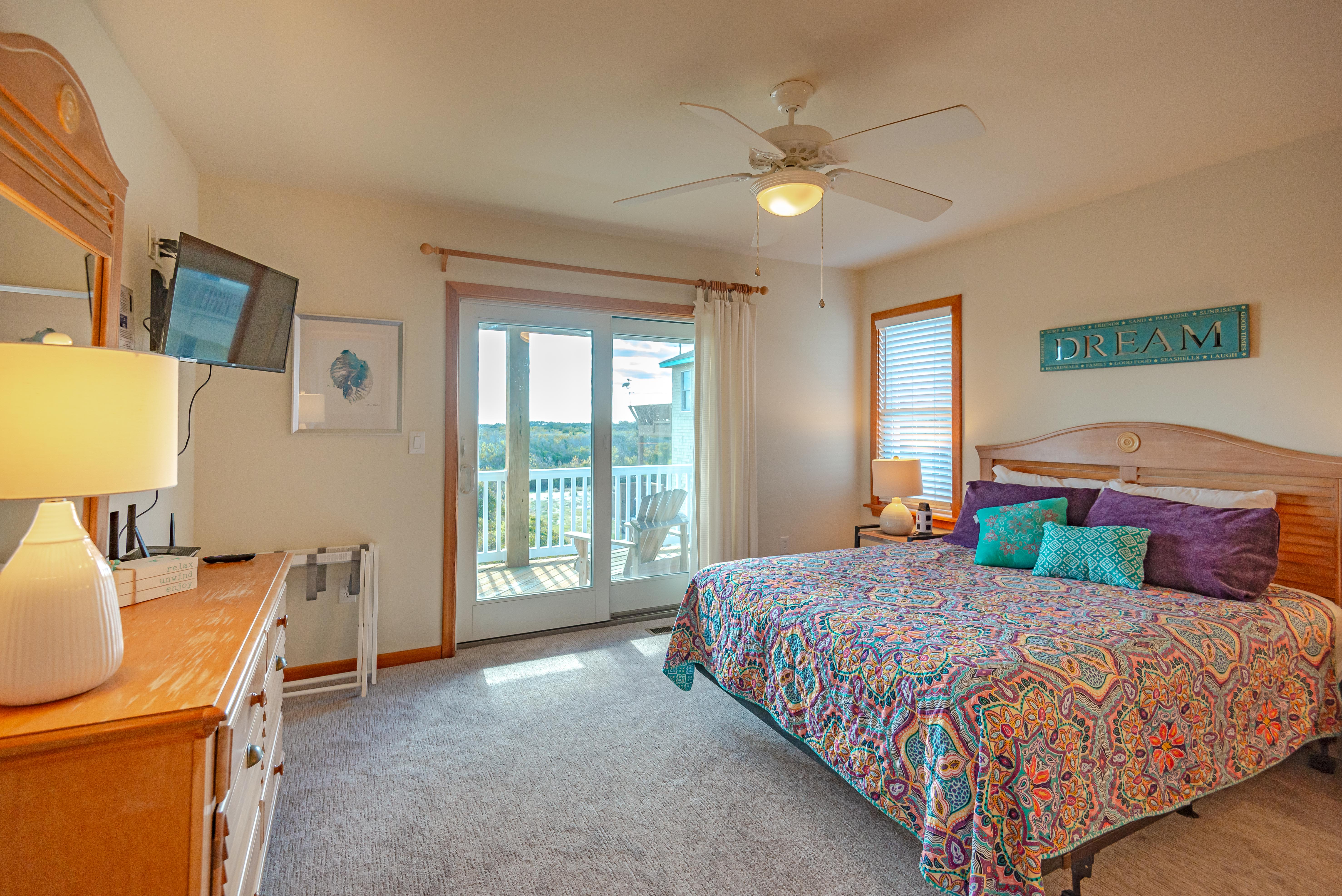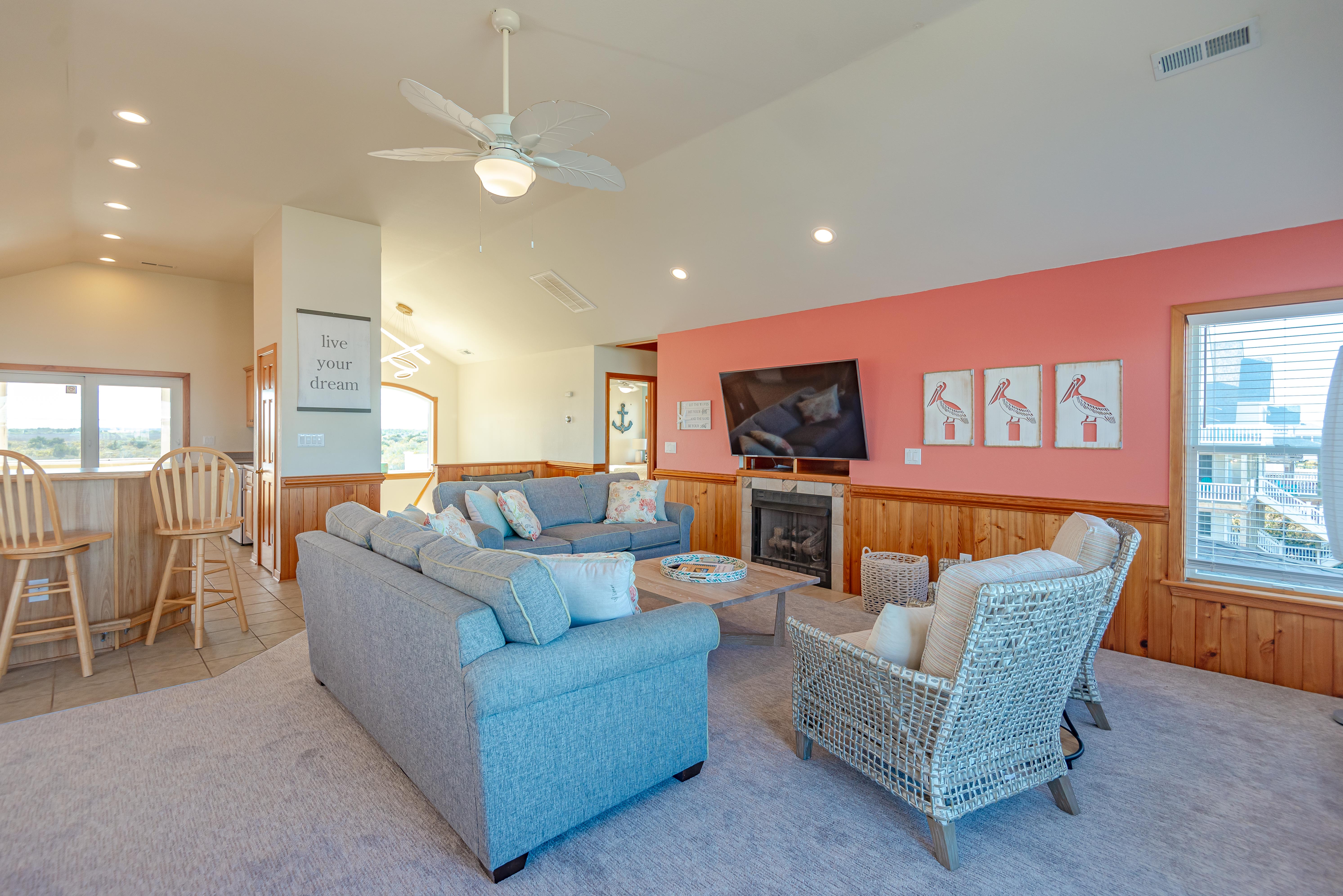 Top Level: Spacious, Beautifully Decorated, Well-Equipped Living/Dining/Kitchen Area featuring Fabulous Ocean to Sound Views, 65 Inch Smart TV with Roku with Cable Access, Half Bath, Screened Porch, Large Wrap-Around Sun Deck, and Private Suite w/King, Flat Screen TV w/Roku with Cable Access, and Full Bath.