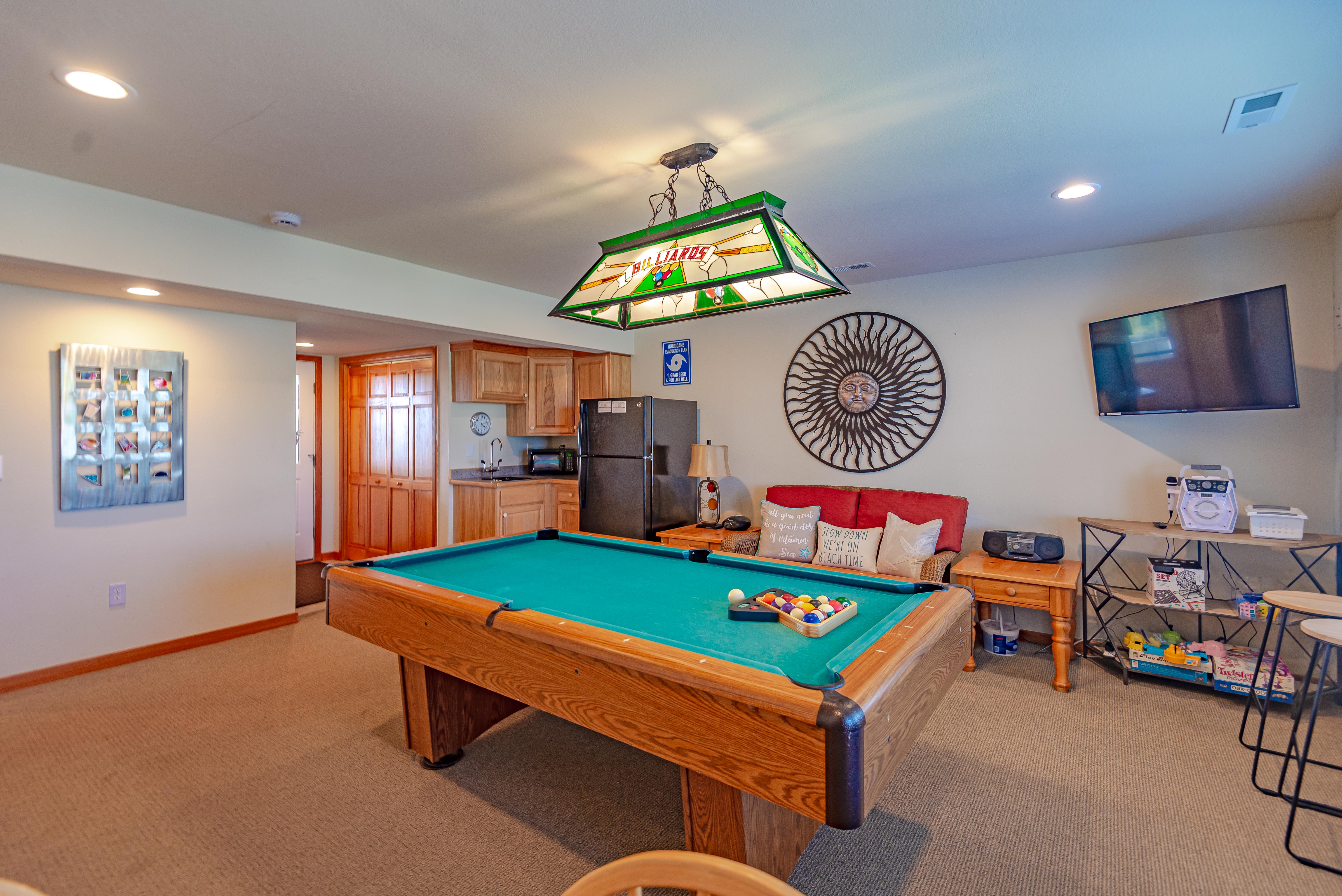 Ground Level: Ample Parking for 5 Cars, Entry to Home, Rec. Room w/Pool Table, Full Size Refrigerator, Wet Bar, Flat Screen TV w/Roku, Cable Access, Stereo, Bluetooth Karaoke Machine, Half Bath, Private Suite w/King, Flat Screen TV w/Roku with Cable Access, Full Bath; Screen Porch, Access to Patio Area, Private 14x32 Swimming Pool - Open Seasonally, Hot Tub, Enclosed Outside Shower, Picnic Table, and Gas Grill.