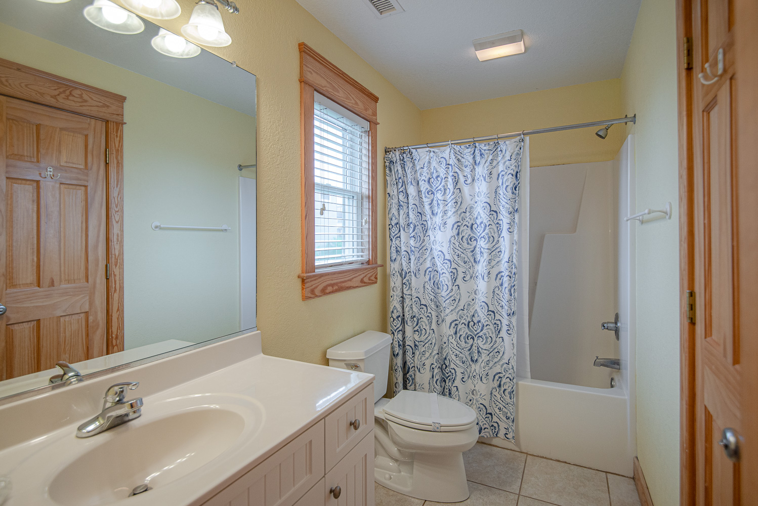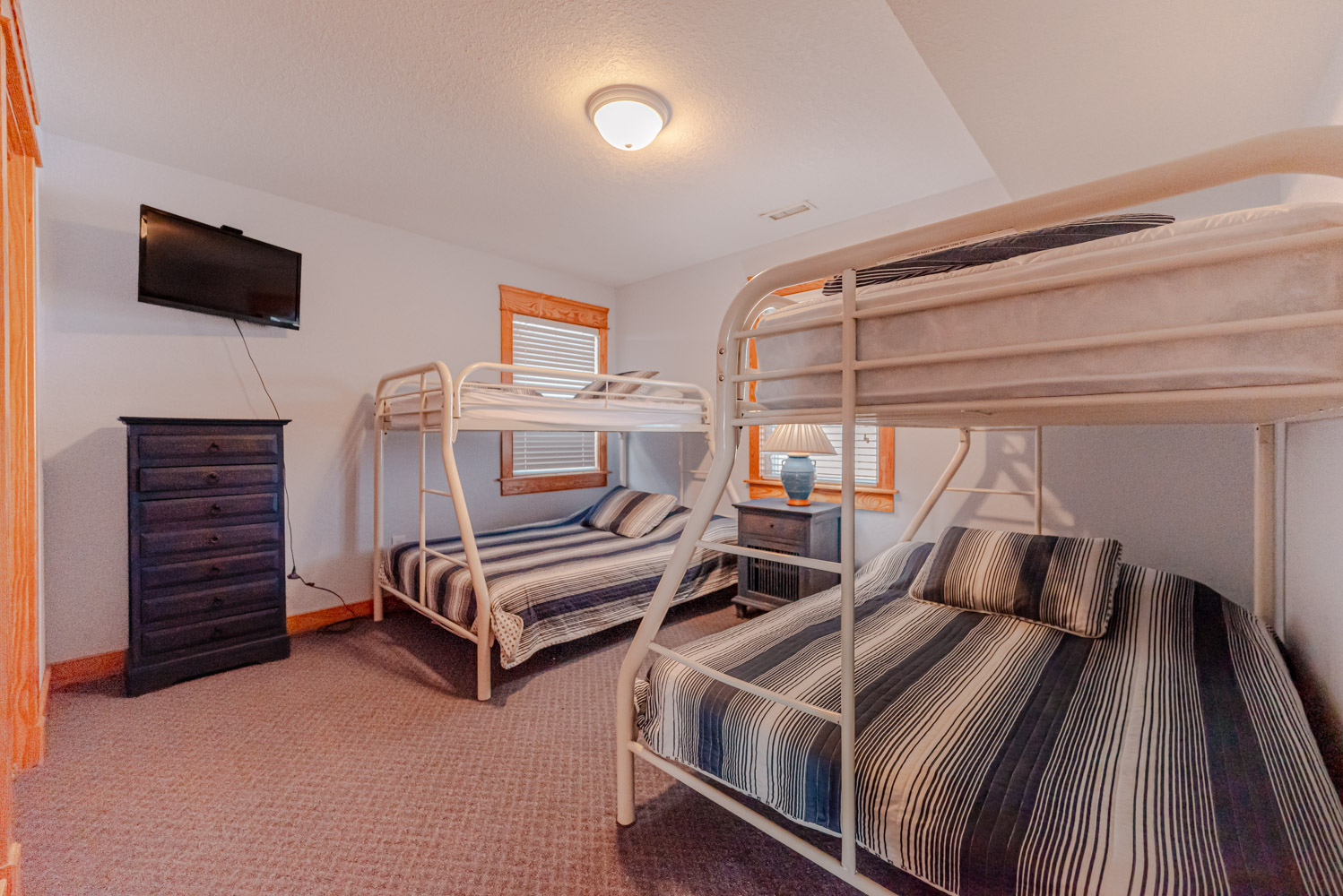 Mid Level 4 Bedrooms (Private Suite w/King, TV, Full Bath w/Tub/Shower; Private Suite w/King, TV, Full Bath w/Tub/Shower, 1 w/Queen, TV; 1 w/Duo Bunk, TV), Full Hall Bath w/Tub/Shower, Front Covered Deck w/Deck Furniture & Steps to Ground Level, & Back Covered Deck Overlooking Pool Area w/Deck Furniture.