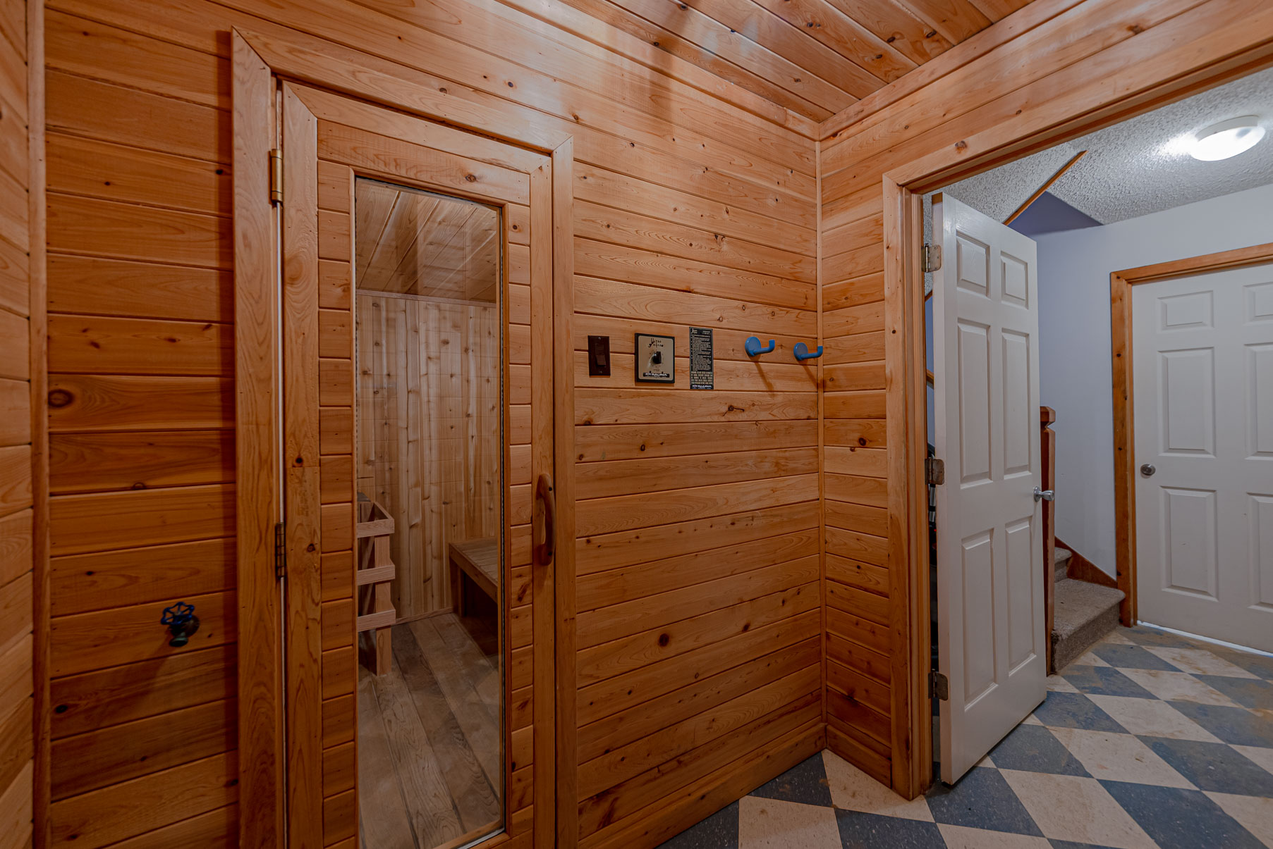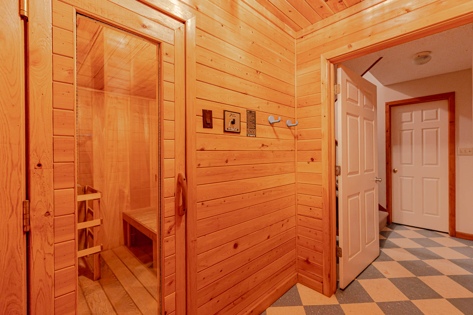Ground Level: Parking for 4 Cars, Covered Entry, Sauna, Enclosed Outside Shower, and Park Grill.