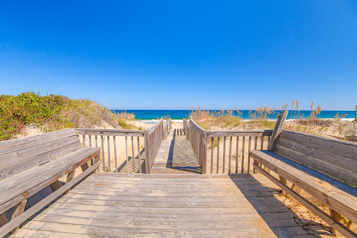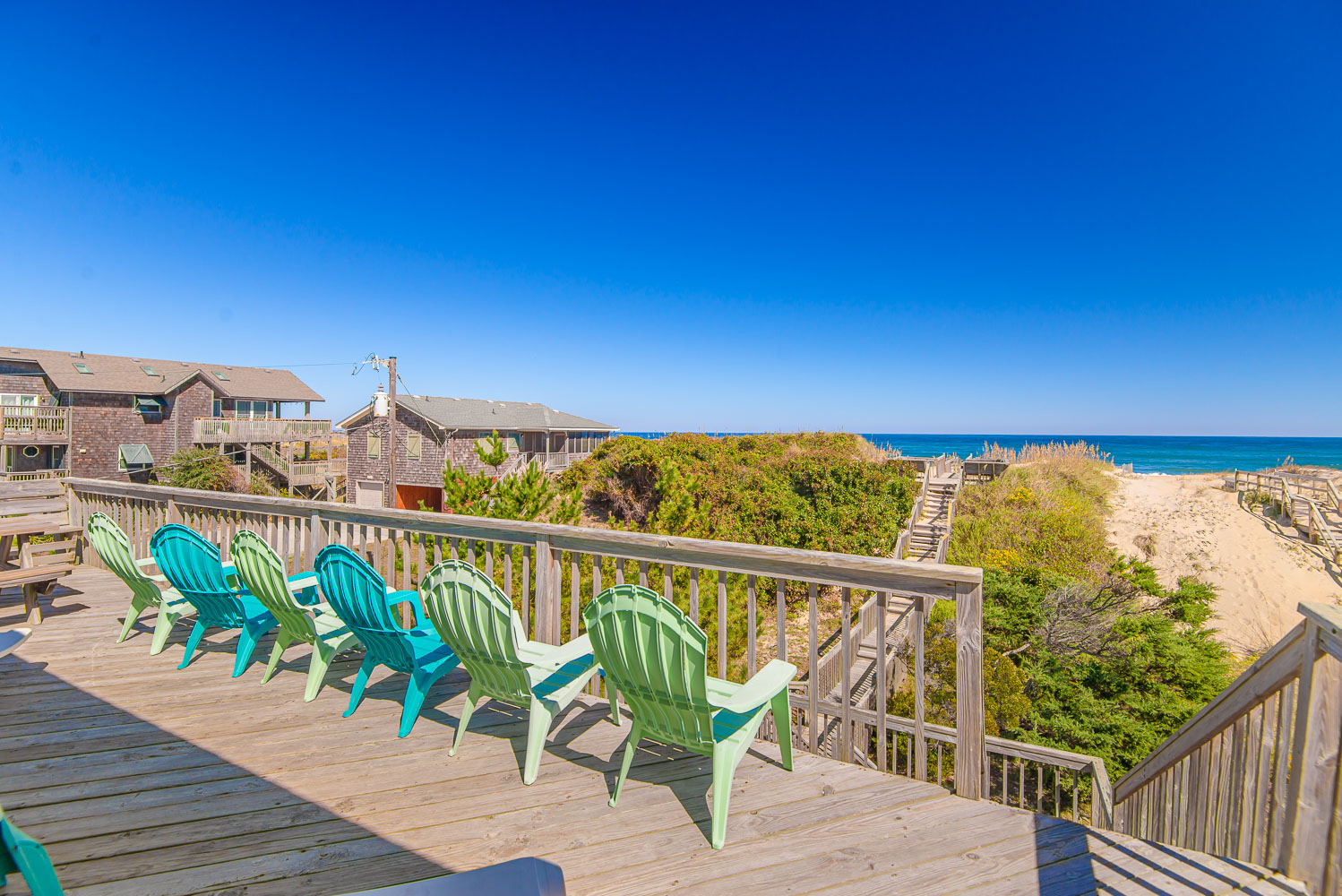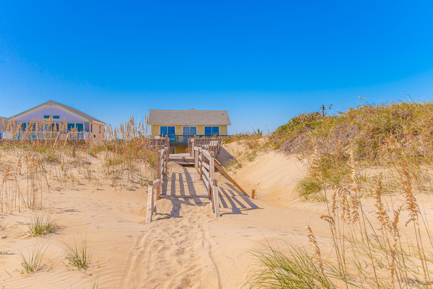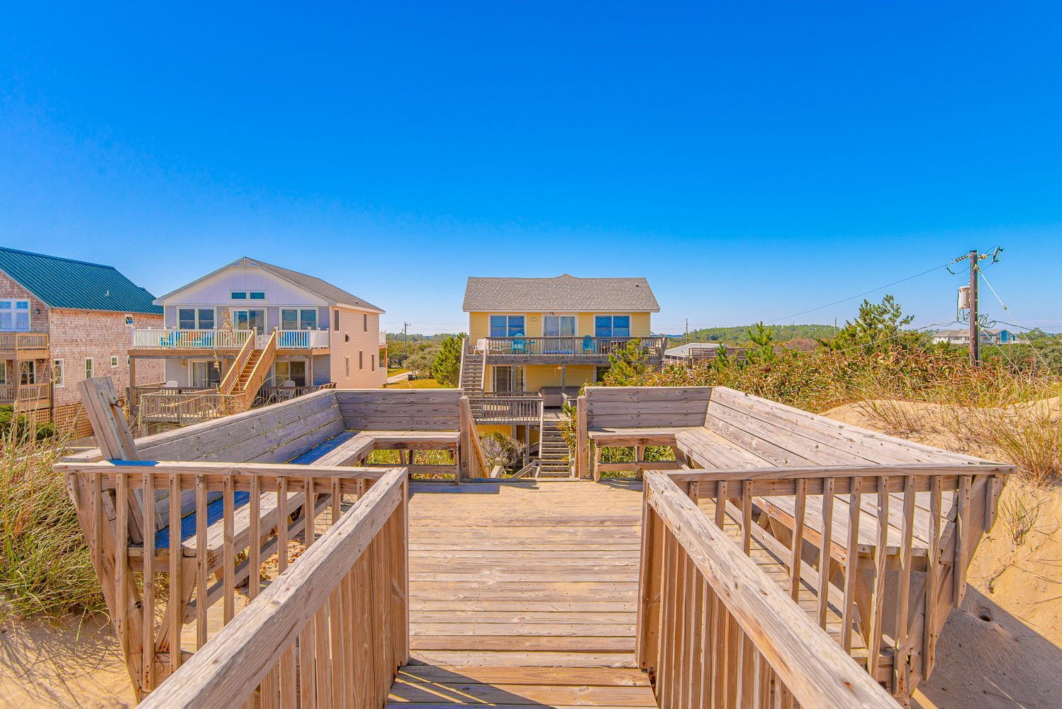 Mid Level: 5 Bedrooms (Private Suite w/Queen, TV, DVD, Full Bath w/Jacuzzi Tub, Walk-In Shower; 2 w/Queens; 1 w/Bunk Set; 1 w/2 Singles), 2 Full Hall Baths, Laundry Area, Covered Deck w/Deck Furniture, Oceanfront Covered Deck w/Hot Tub , & Walkway to Beach w/Dune Top Deck, Steps to Beach, & Ocean Views.