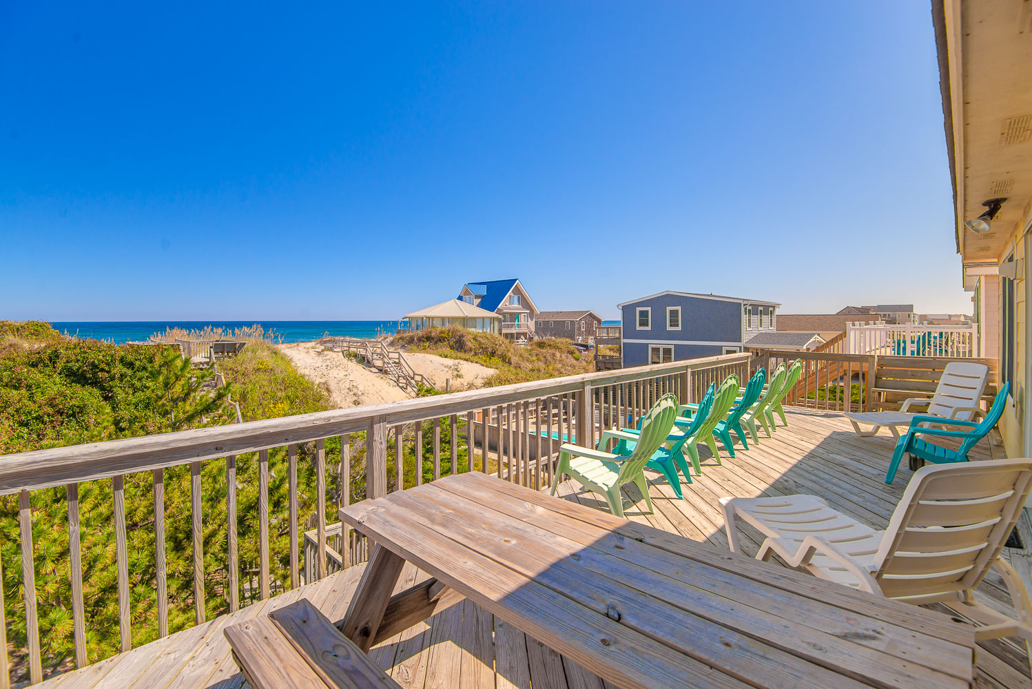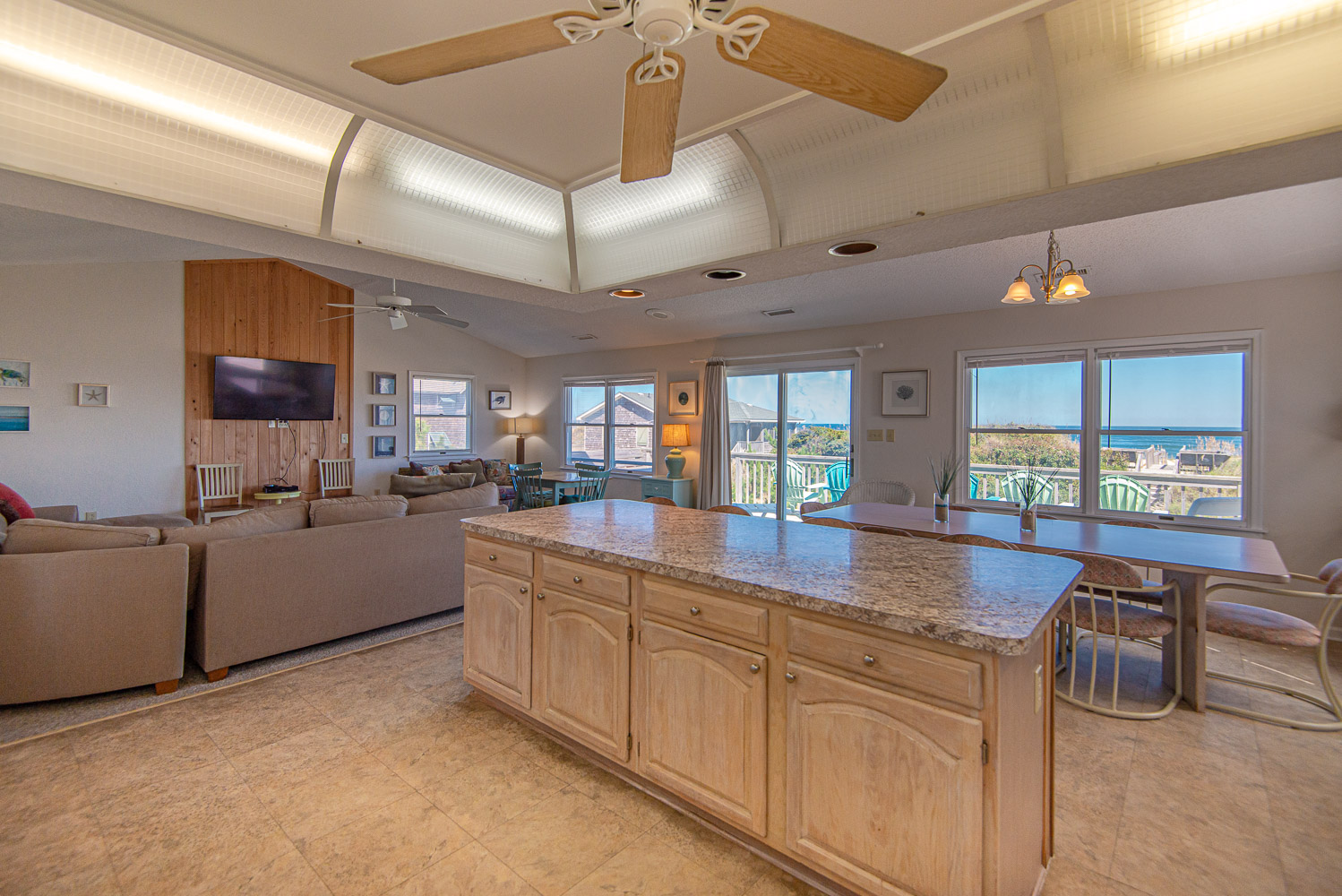 Top Level: Living Area, TV, Fully Equipped Kitchen w/Bar Seating for Four (4), Dining Area w/Seating for Eight (8), Private Suite w/King, TV, Full Bath; Sitting Area w/Queen Sleep Sofa; Front Covered Deck, & Oceanfront Sun Deck w/Access to Private Walkway to Beach w/Dune Top Deck w/Built-In Seating & Amazing Ocean Views.