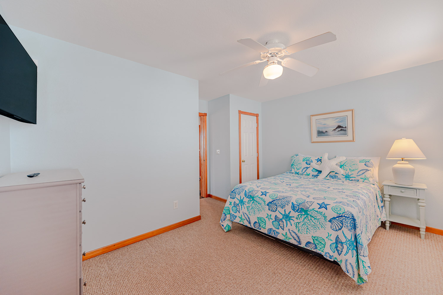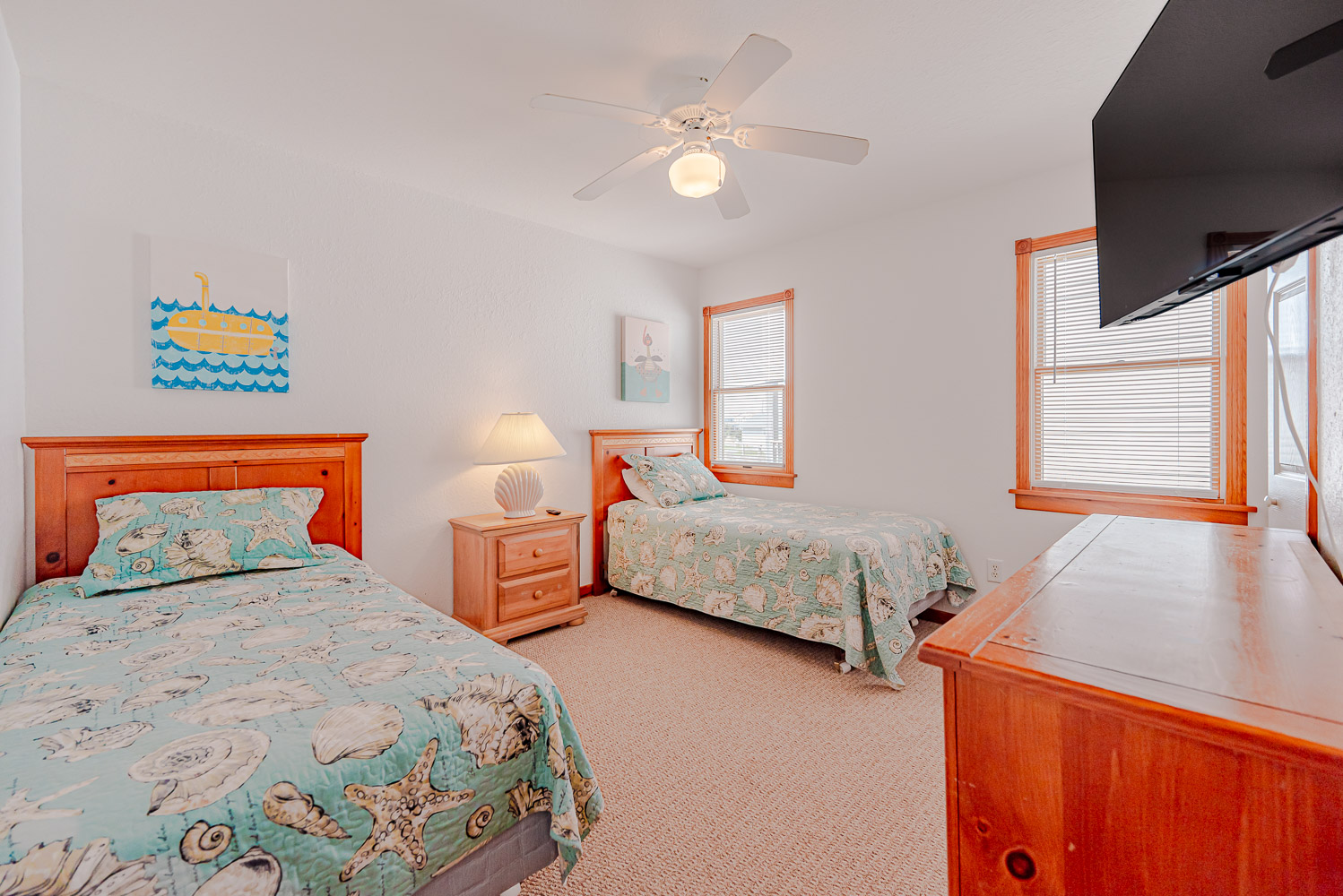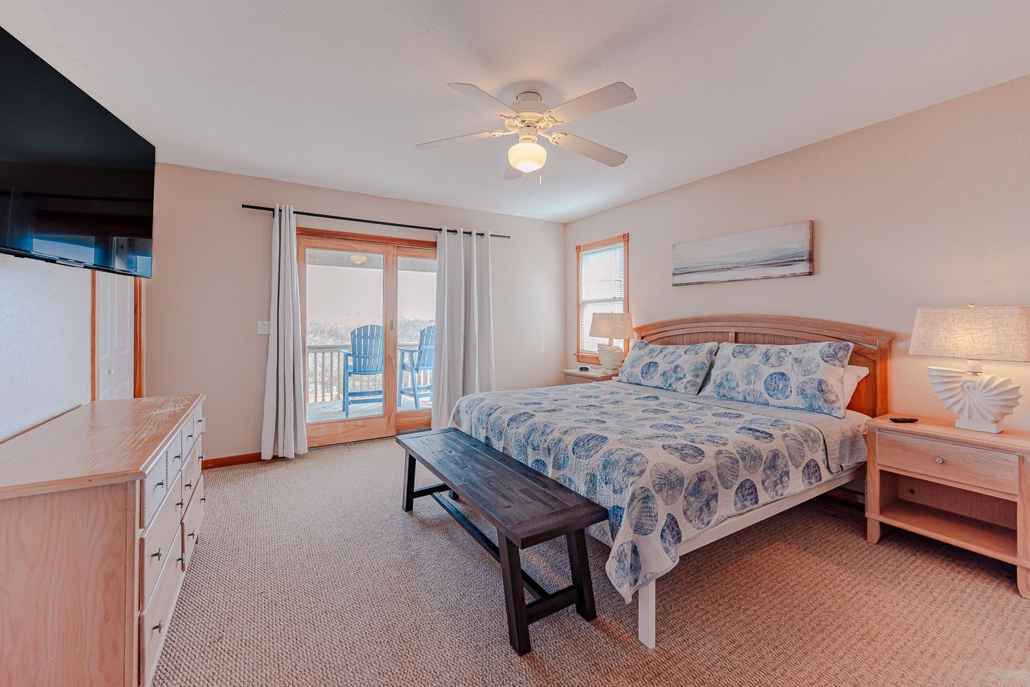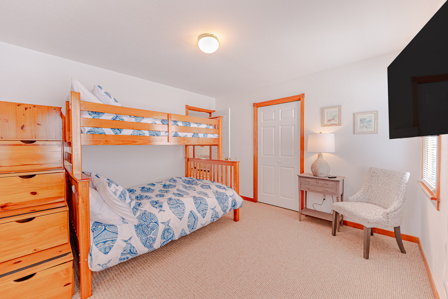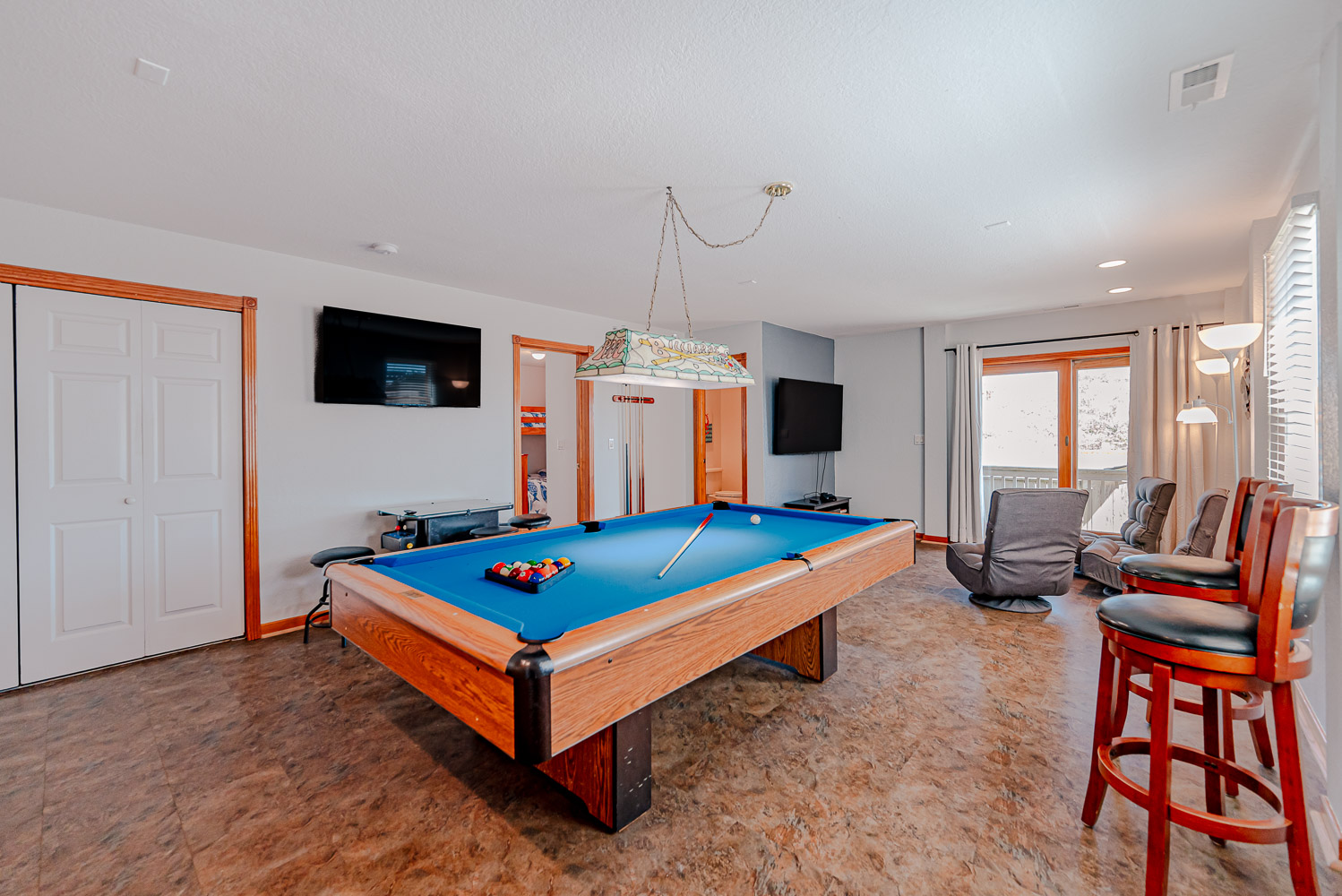 Mid Level: 5 Bedrooms (Private Suite w/King, TV, Full Bath; 1 w/King, TV; 1 w/Queen, TV; 1 w/Duo Bunk, TV; 1 w/2 Singles, TV), 2 Full Baths, and Covered Deck w/Hot Tub, Deck Furniture, and Steps to Pool.