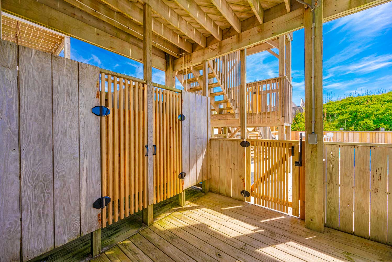 Ground Level: Parking for 6 Cars, Covered Entry, Rec. Room, Pool Table, Arcade Game Table, Xbox Game System (Dedicated TV), TV for Watching Games while Playing Pool, Wet Bar, Full Size Refrigerator, Full Bath, 2 Bedrooms (1 w/Queen, 1 w/Duo Bunk), Half Bath, Laundry Area, Commercial Ice Maker, Access to Private 12x30 Swimming Pool - Open Seasonally, Two (2) Enclosed Outside Showers, Gas Grill, and Private Walkway to Beach.