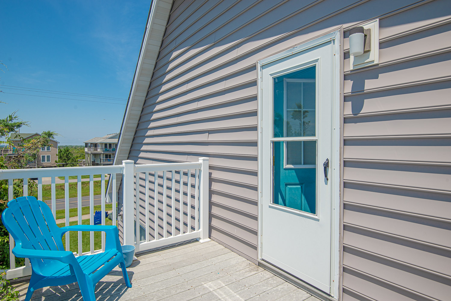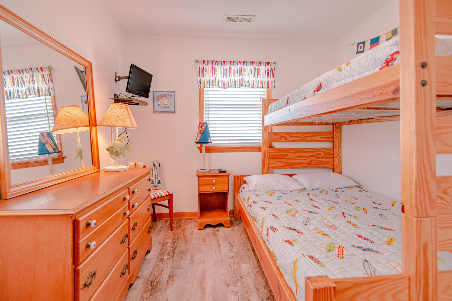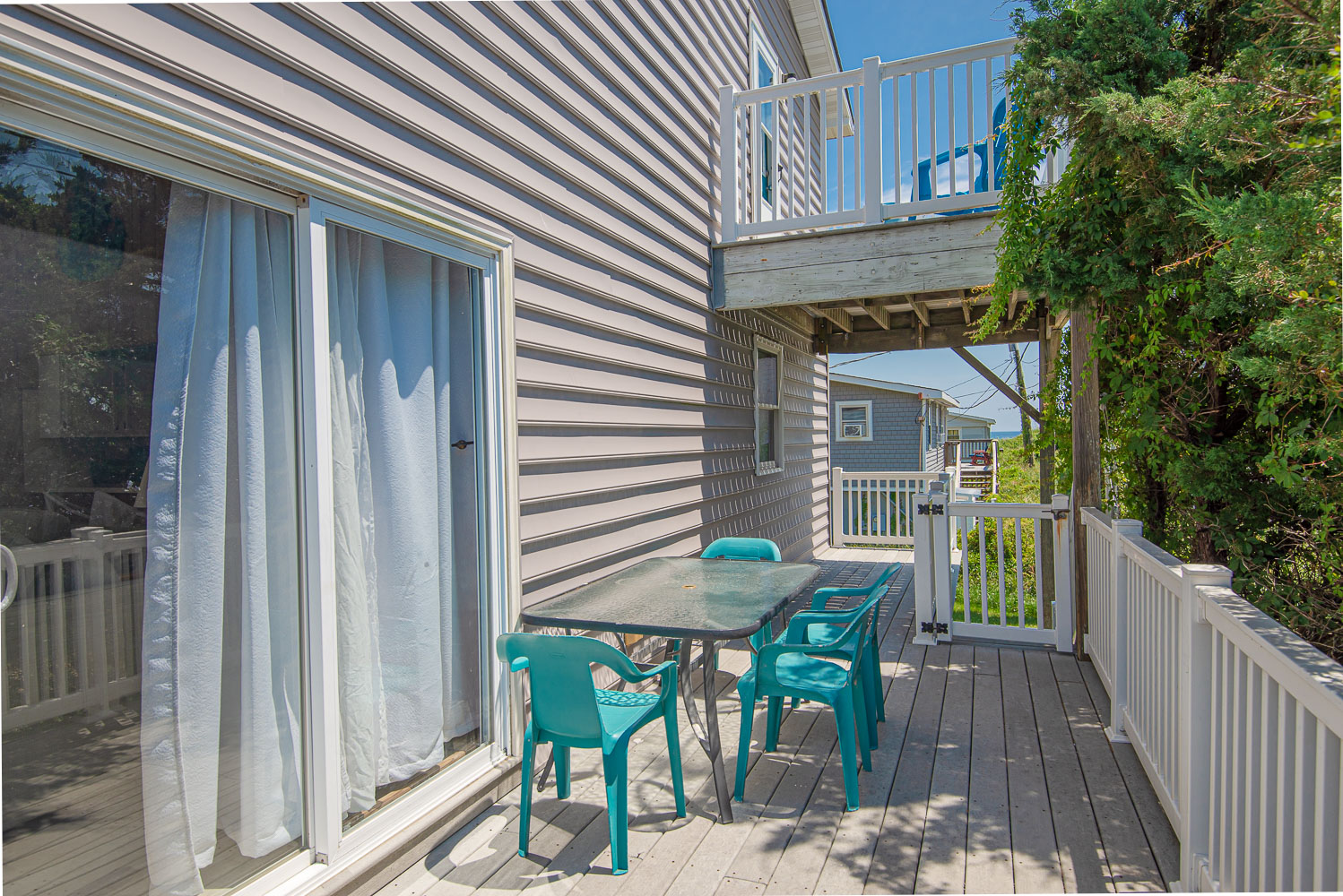 Top Level: 2 Bedrooms (1 w/Queen, TV; 1 w/Duo Bunk, TV), Full Hall Bath w/Tub/Shower, and Sun Deck w/Chairs.