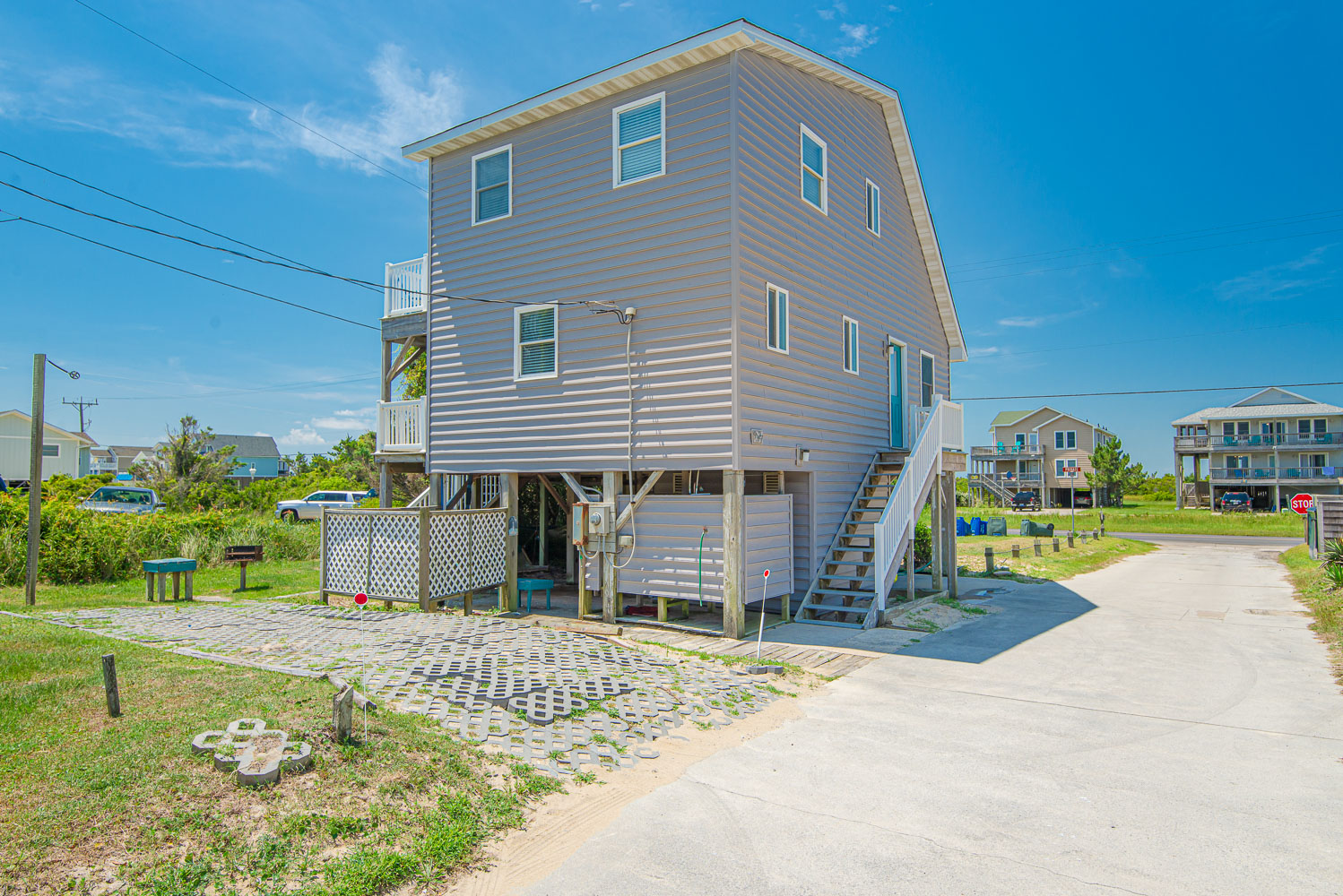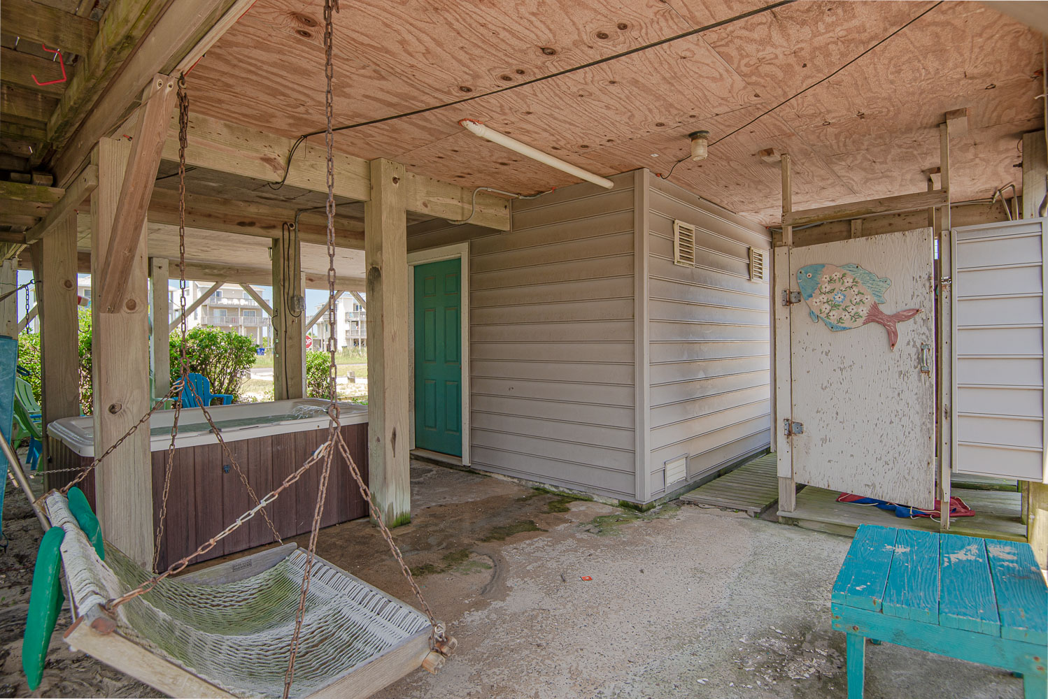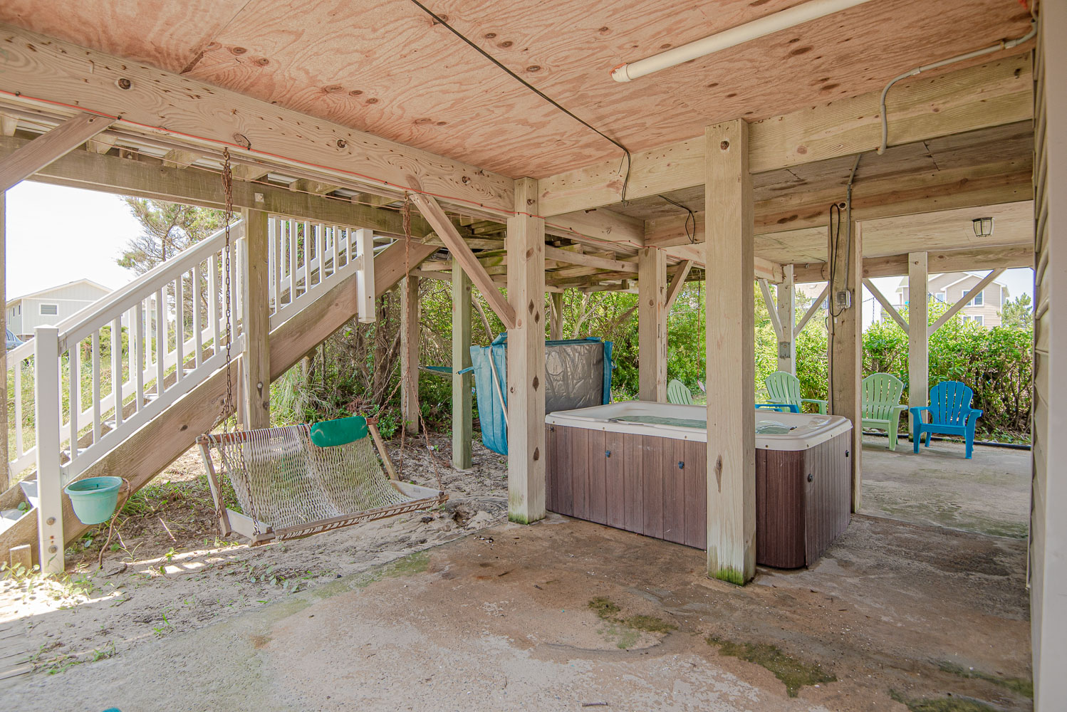 Ground Level: Parking for 2 Cars, Steps to Covered Entry, Covered Sitting Area, Hot Tub, Hammock Swing, Child Swings, Enclosed Outside Shower, and Charcoal Grill.