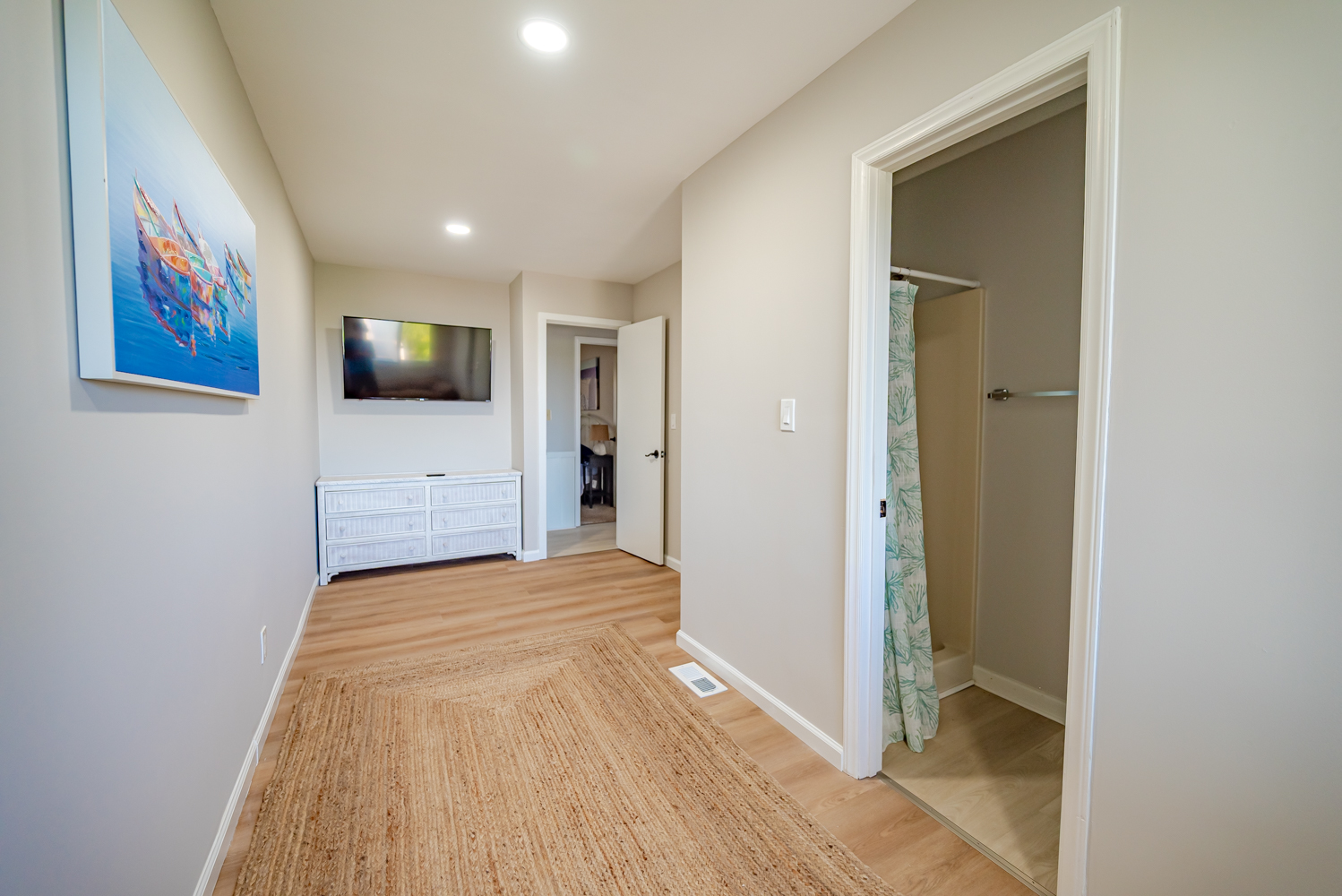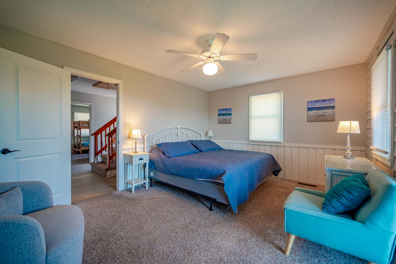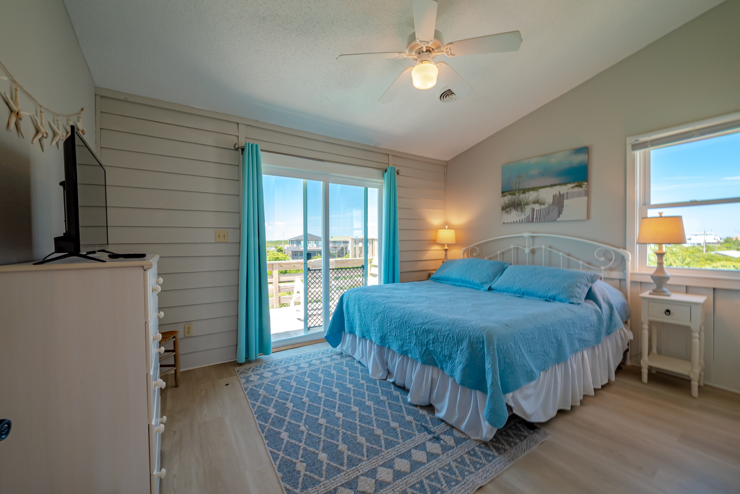 Mid Level: 3 Bedrooms (Private Suite w/King, TV, Full Bath w/Tub/Shower Access to Front Sun Deck; 1 w/2 Bunk Sets, 1 w/King), Full Hall Bath w/Tub/Shower, New TV Room, Laundry Area, and Access to Oceanfront Covered Deck w/Deck Furniture.