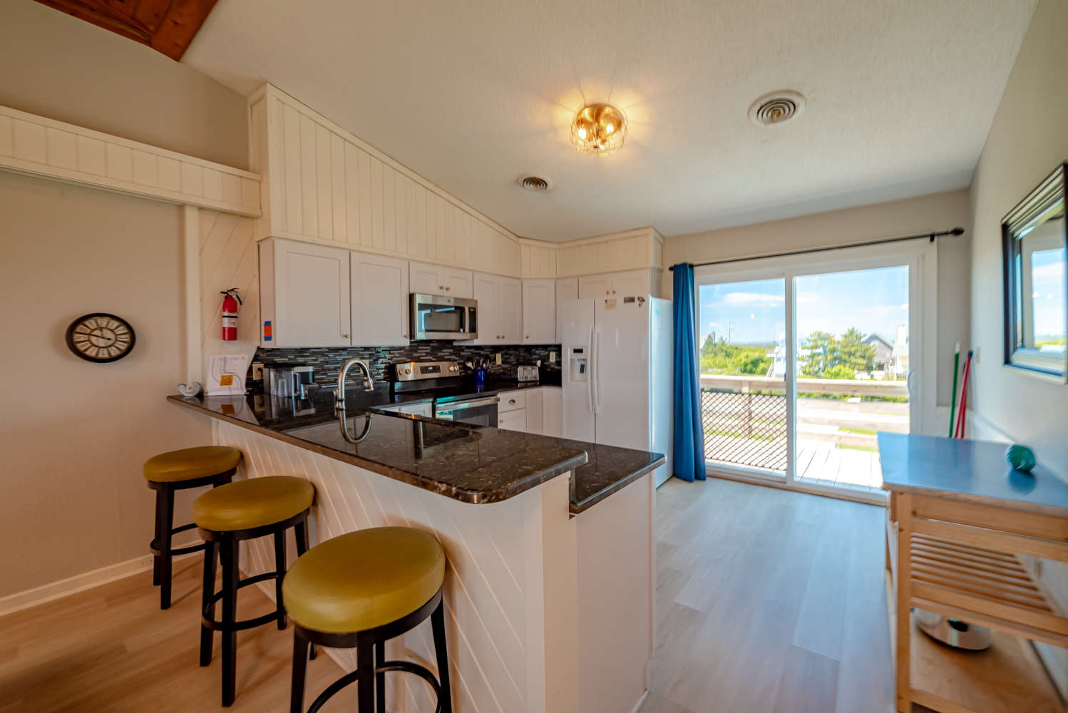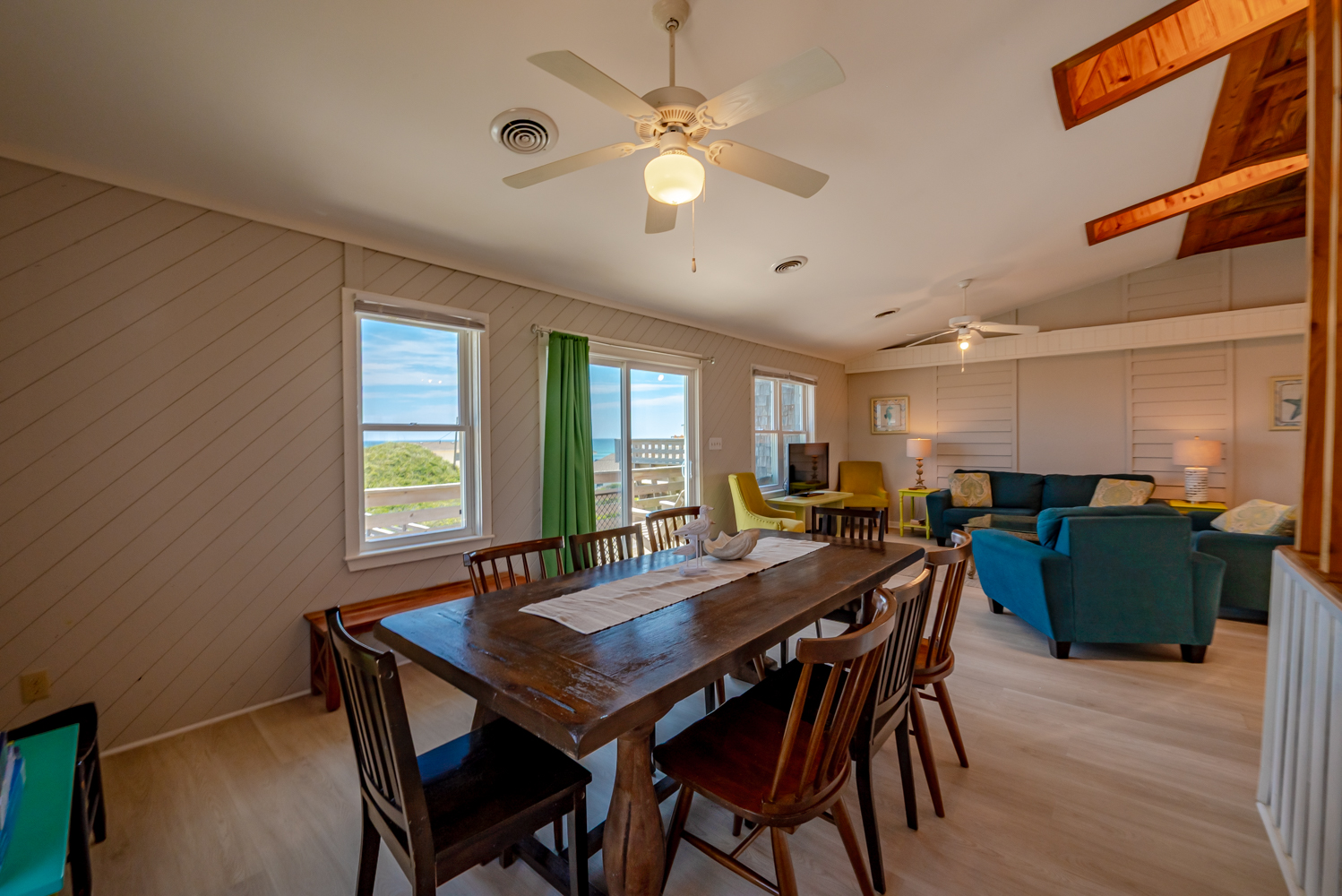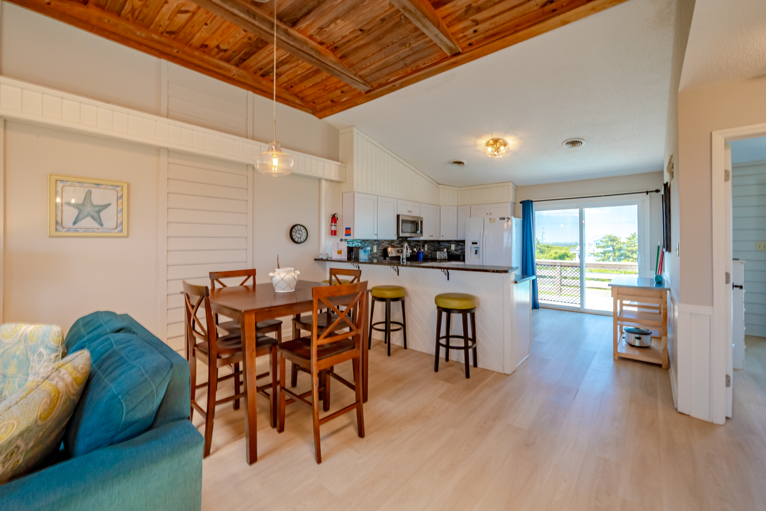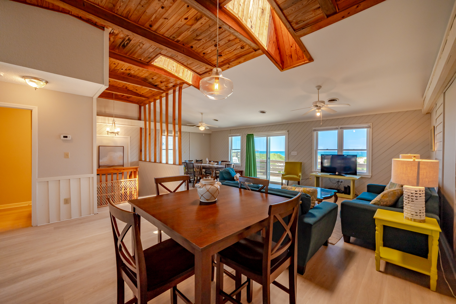 Top Level: Living Area w/TV and Ocean Views, Kitchen Area w/Bar Seating for Three (3) and Access to West Facing Sun Deck w/Deck Furniture, Dining Area w/Seating Eight (8), Table w/Seating for Four (4), Access to Oceanfront Sun Deck w/Deck Furniture, Full Hall Bath w/Shower, and Bedroom w/King, and Access to West Facing Sun Deck w/Deck Furniture.