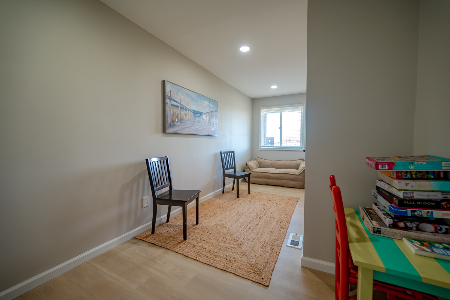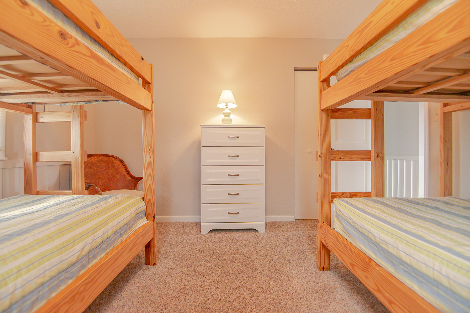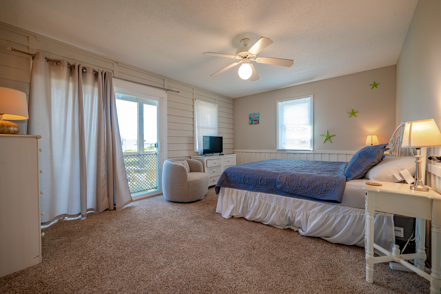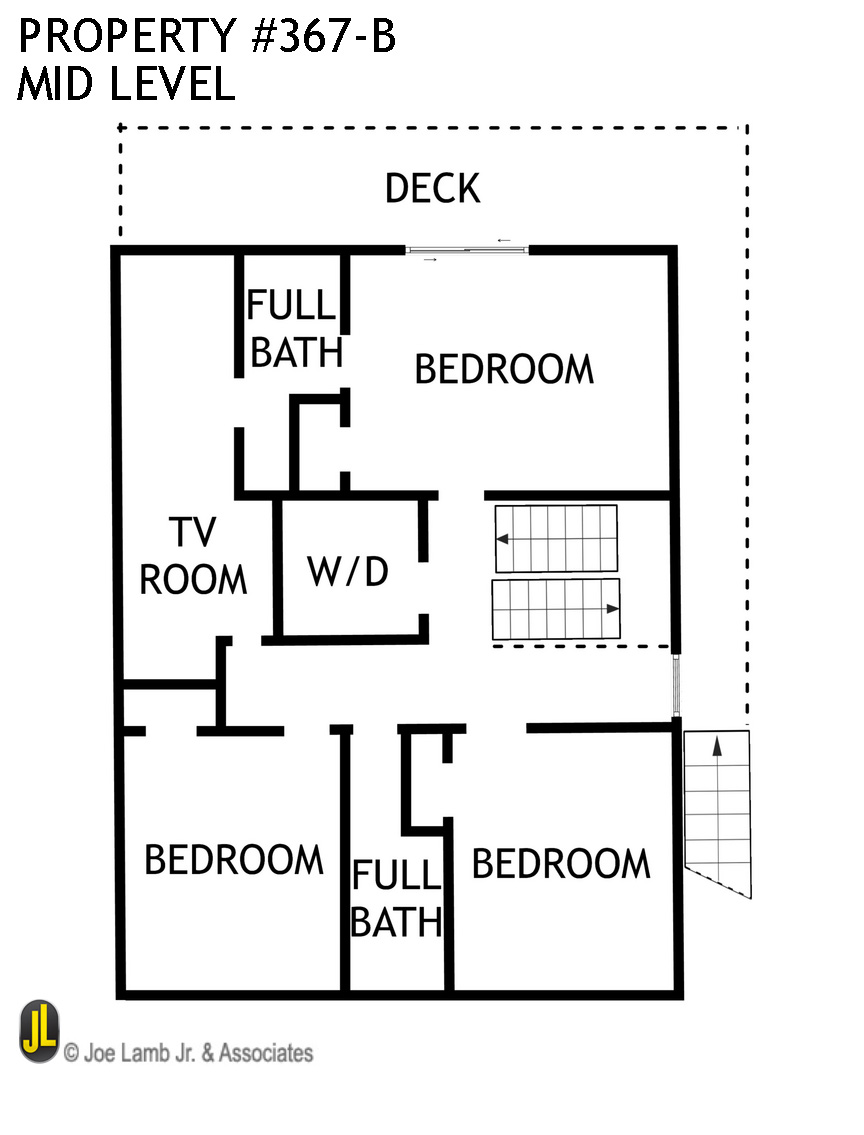 Mid Level: 3 Bedrooms (Private Suite w/King, TV, Full Bath w/Tub/Shower, Access to West Facing Sun Deck; 1 w/2 Bunk Sets, 1 w/King), Full Hall Bath w/Tub/Shower, New TV Room, Laundry Area, and Access to Oceanfront Covered Deck w/Deck Furniture.