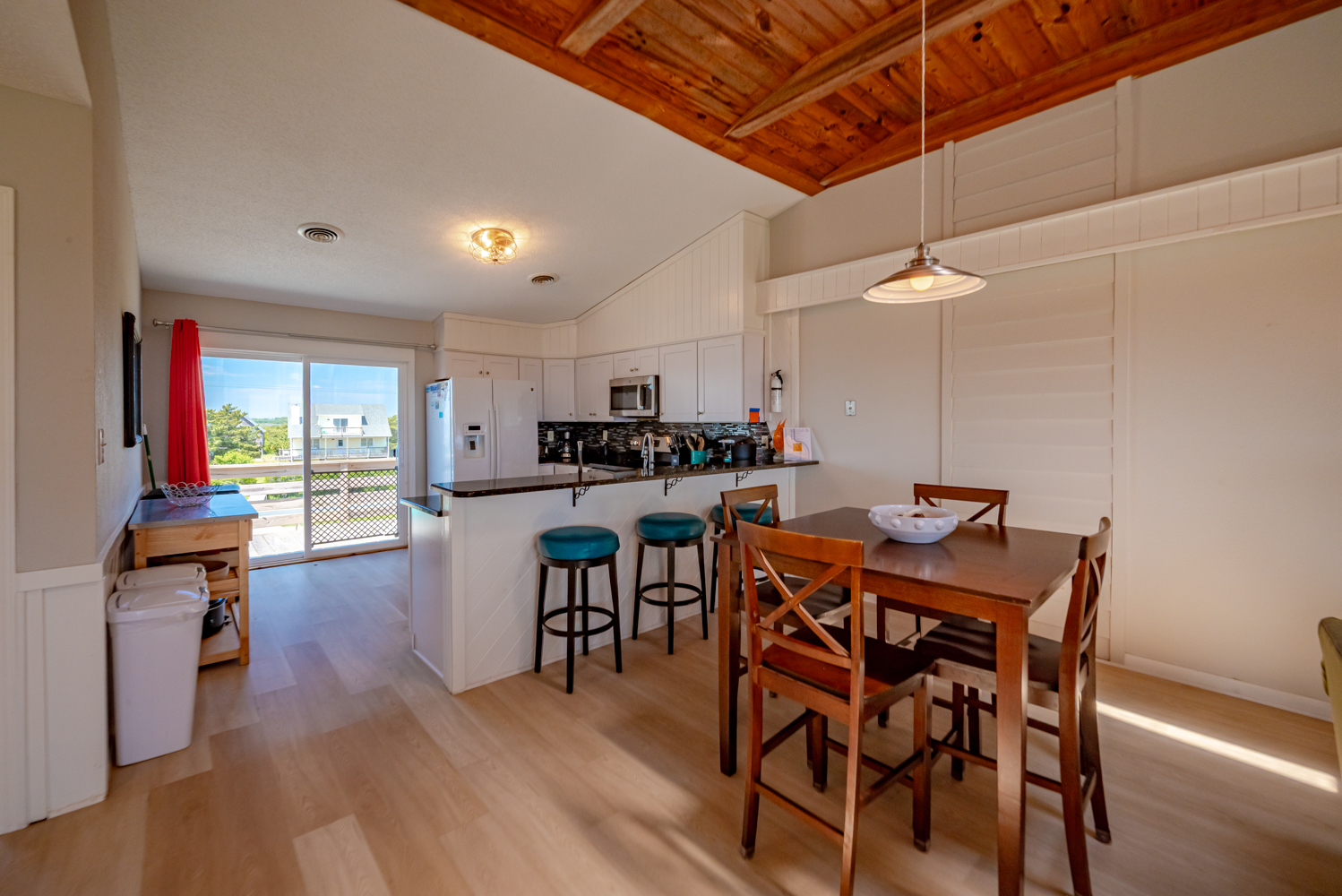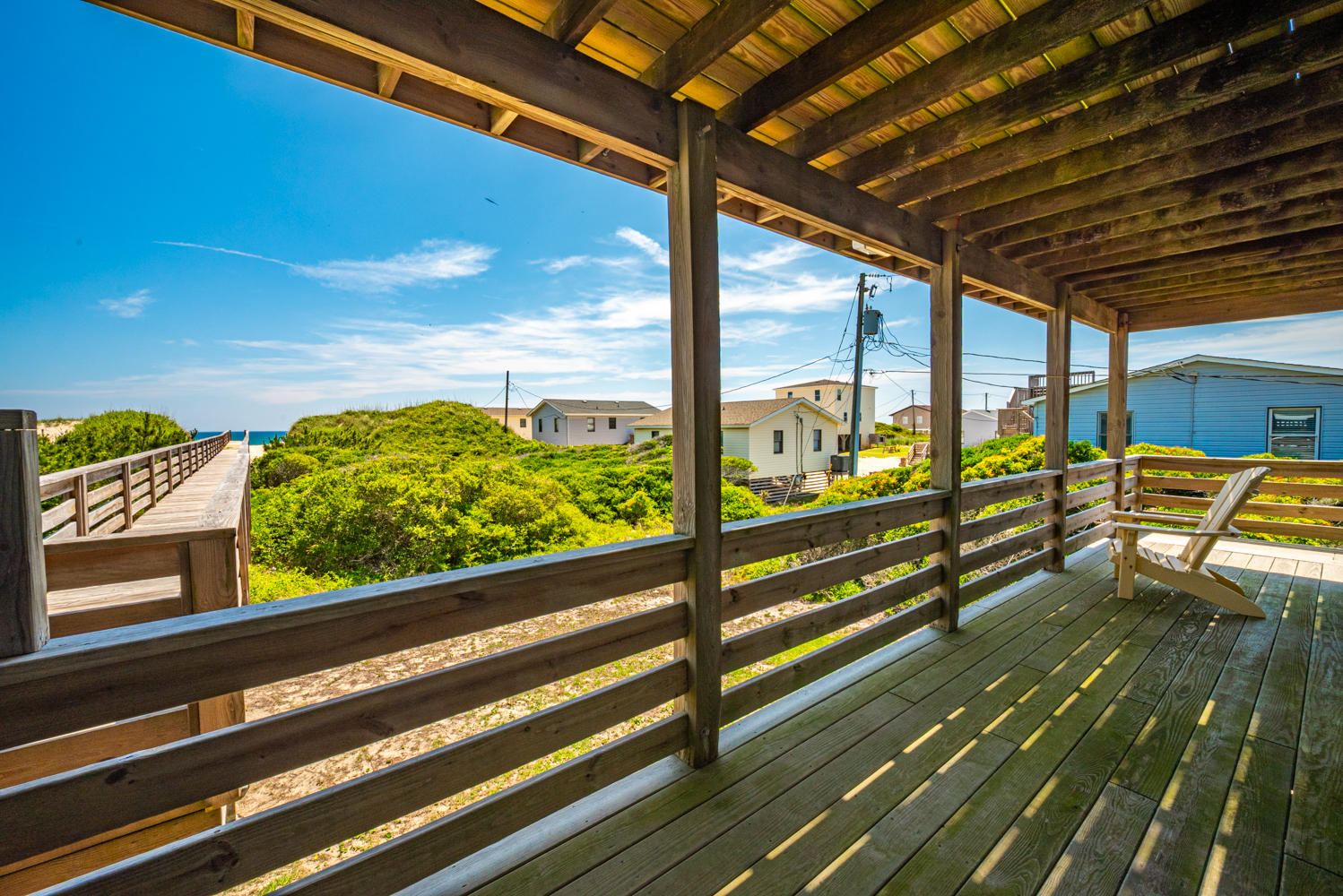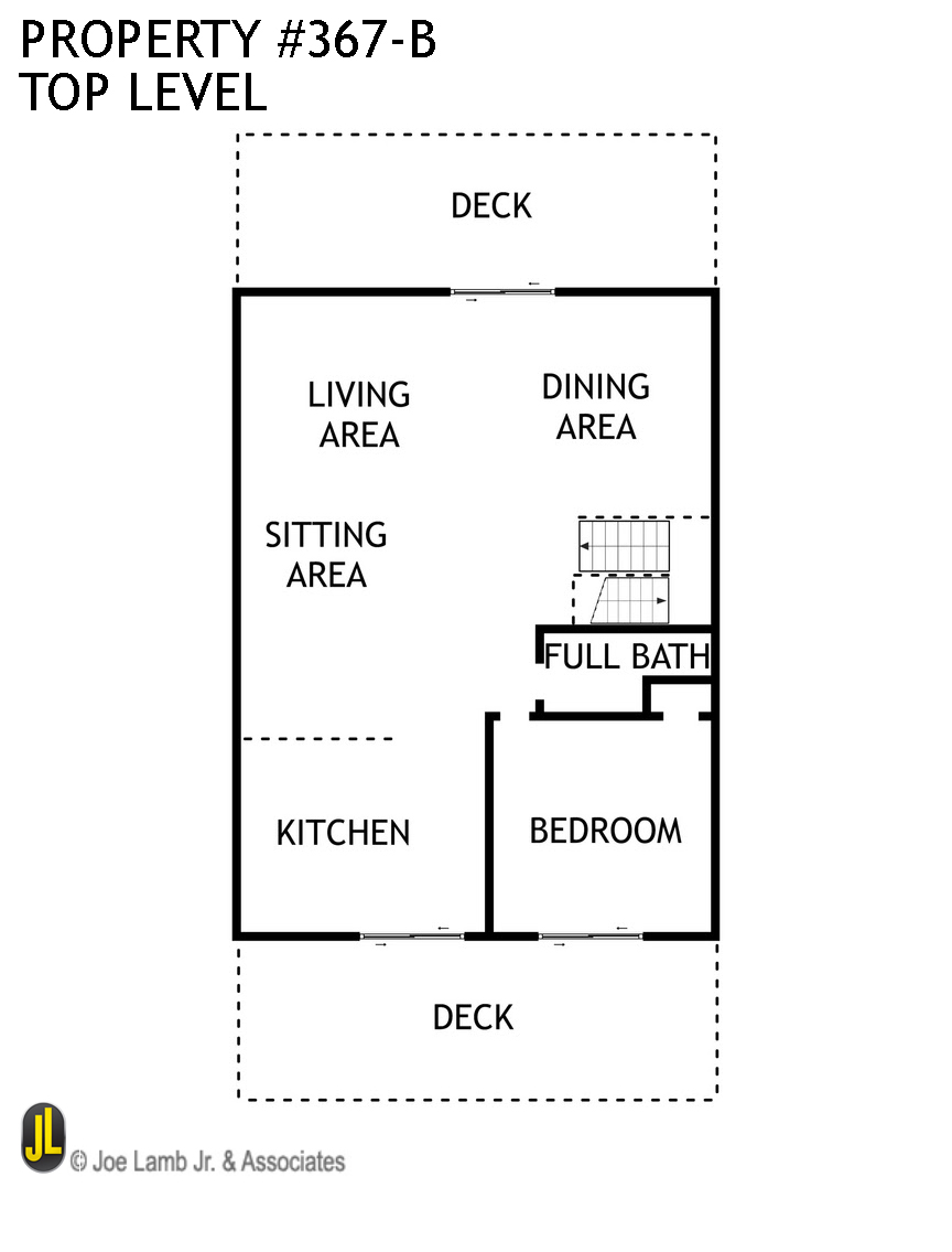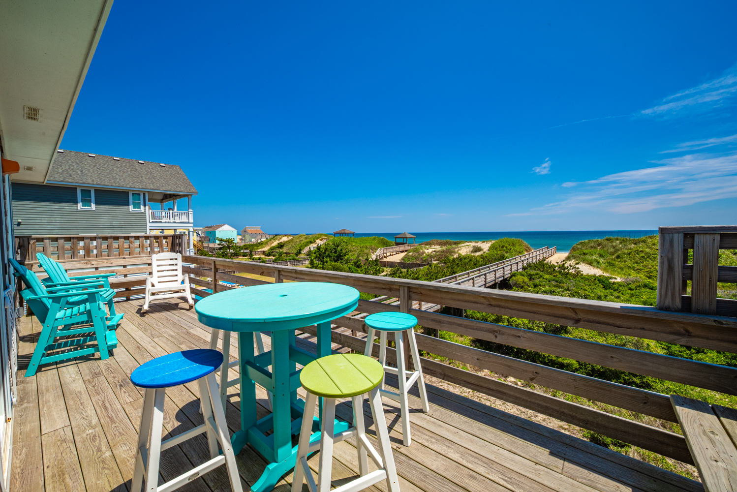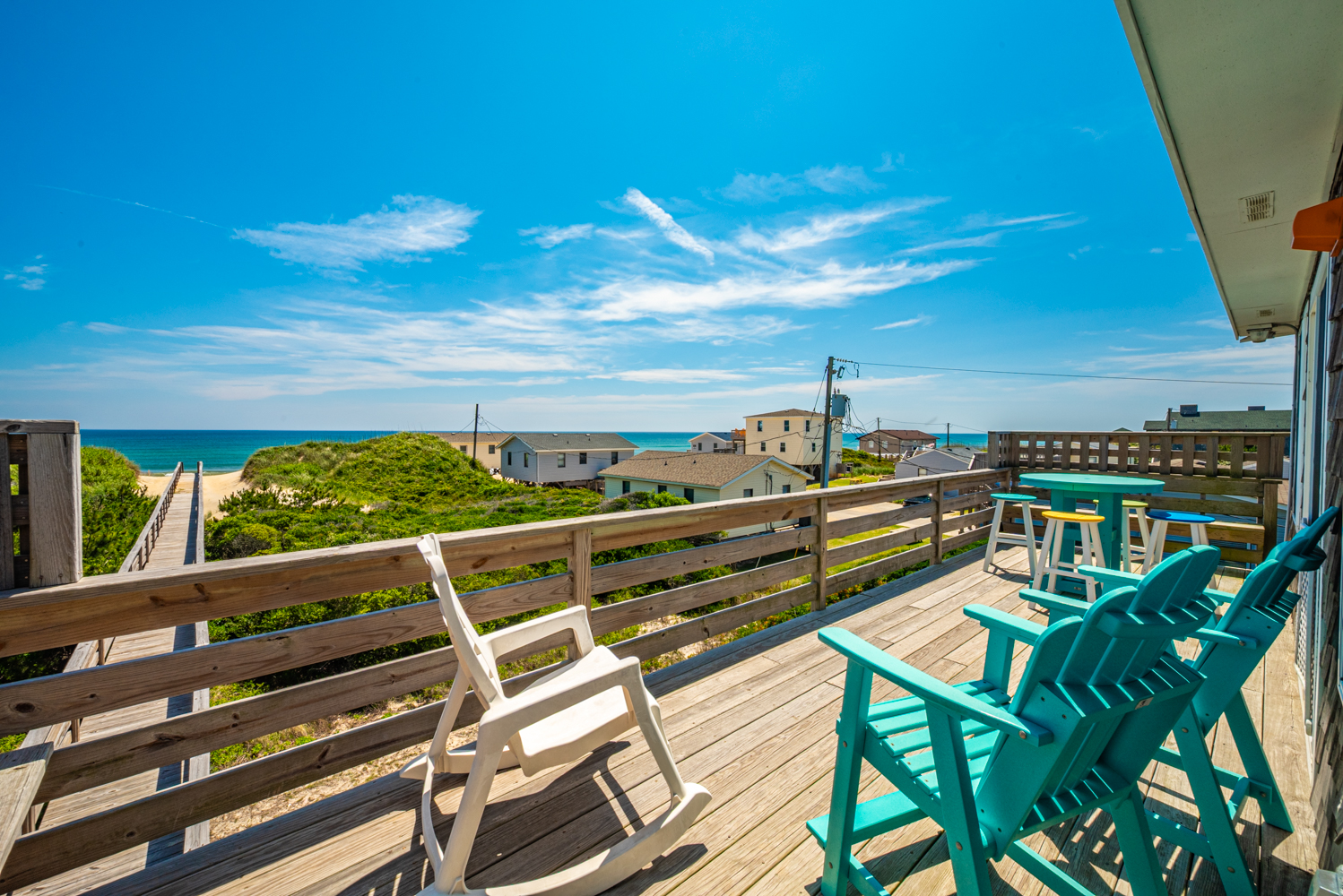 Top Level: Living Area, TV, Ocean Views; Kitchen Area w/Bar Seating for Three (3); Access to west facing Sun Deck w/Deck Furniture; Dining Area w/Seating Eight (8), Table w/Seating for Four (4); Access to Oceanfront Sun Deck w/Deck Furniture, Full Hall Bath w/Shower; Bedroom w/King, TV, and Access to west facing Sun Deck w/Deck Furniture.