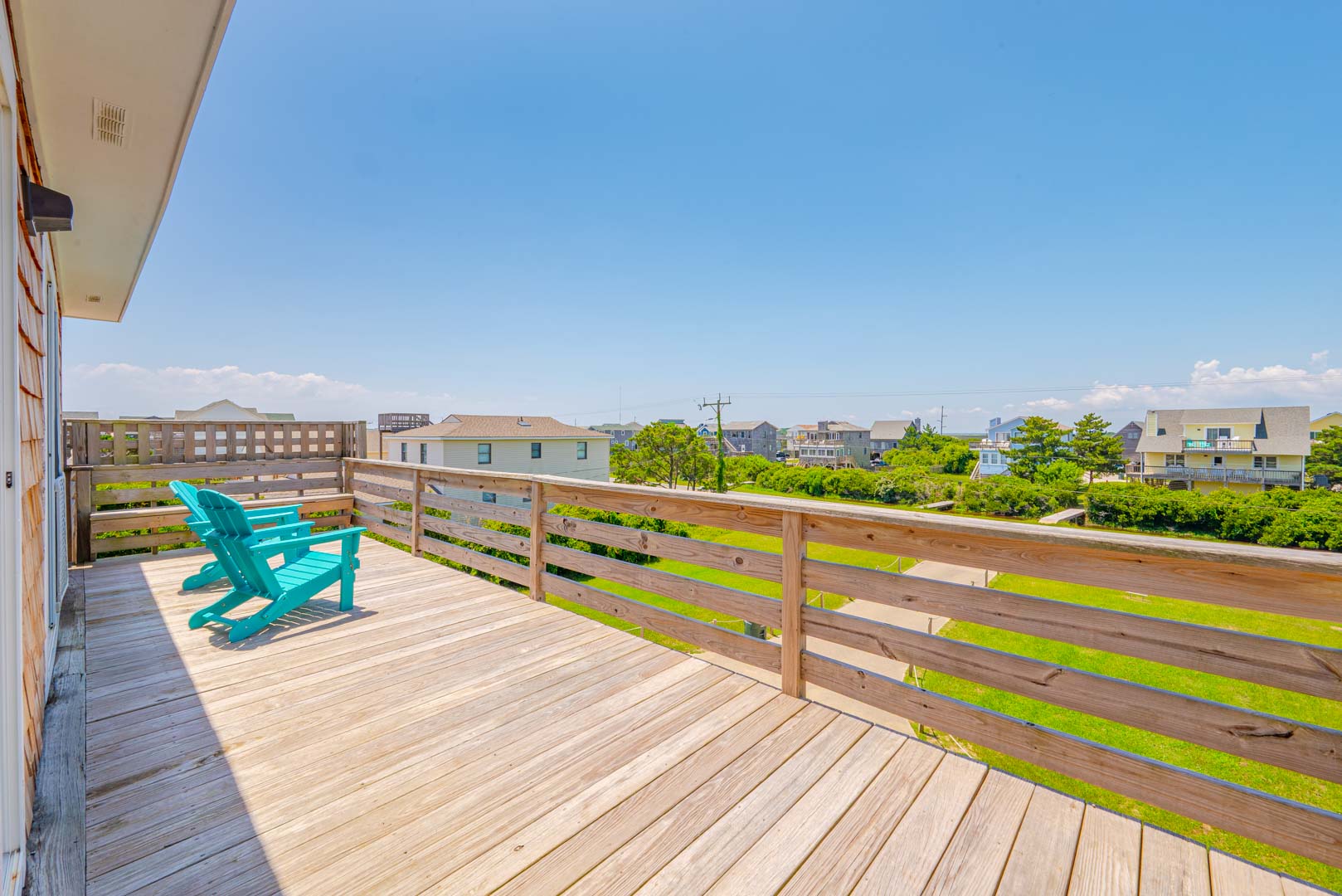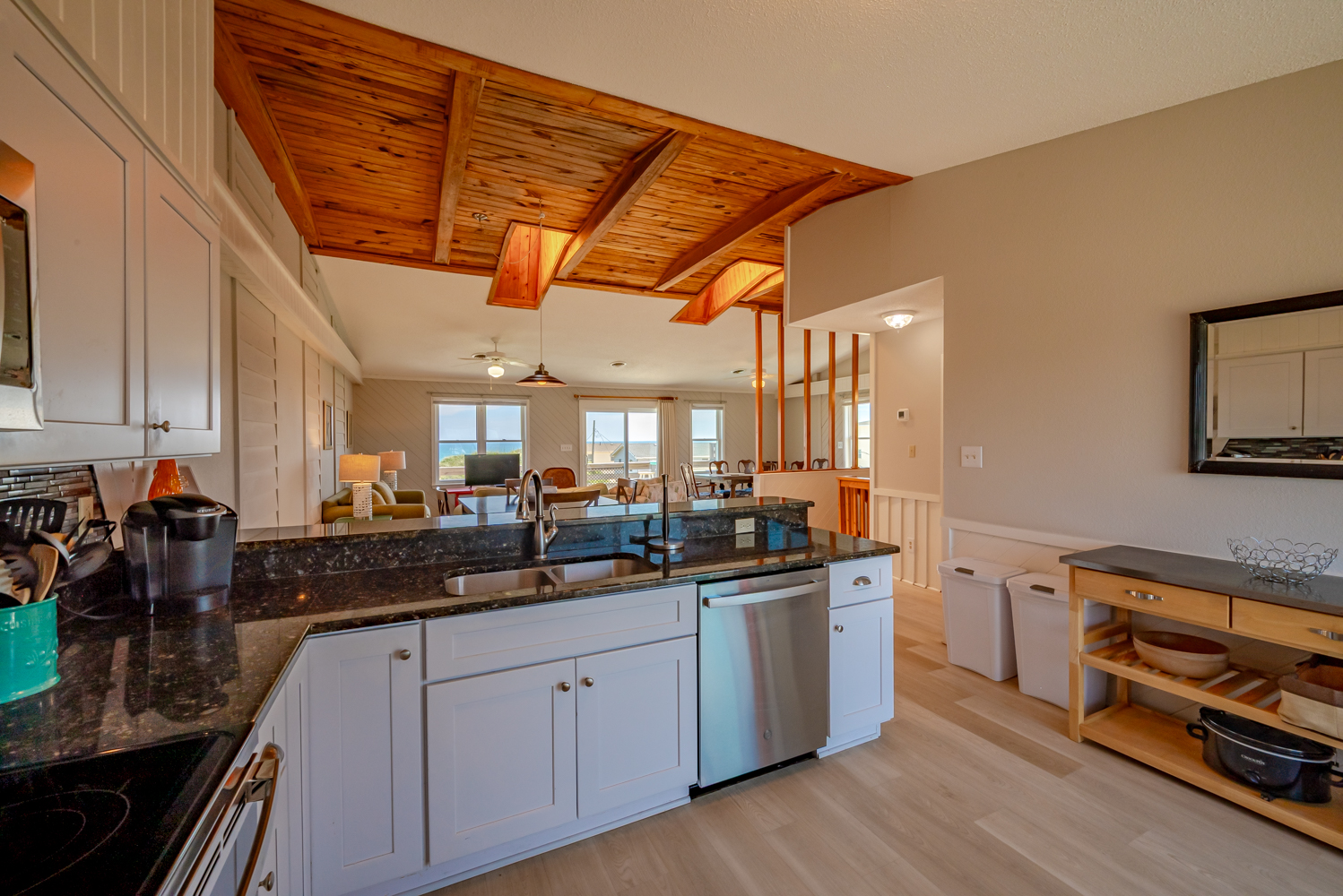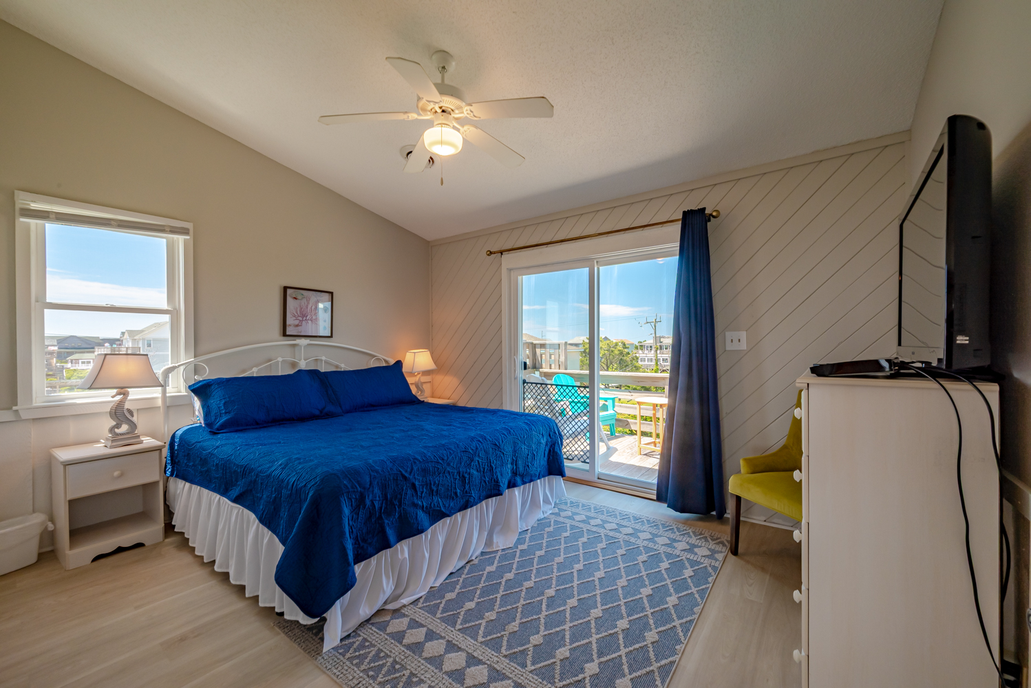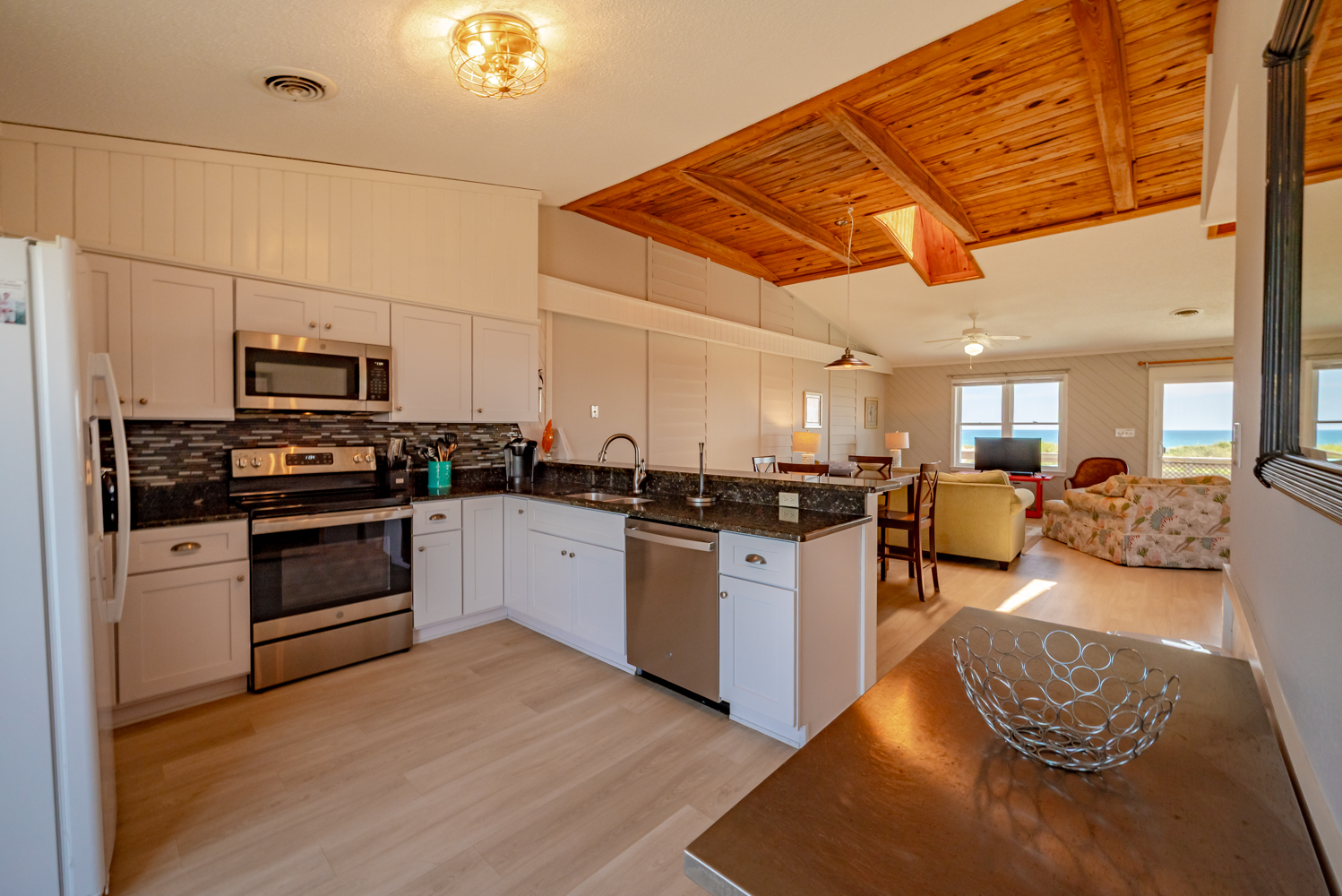 Top Level: Living Area, TV, Ocean Views; Kitchen Area w/Bar Seating for Three (3); Access to west facing Sun Deck w/Deck Furniture; Dining Area w/Seating Eight (8), Table w/Seating for Four (4); Access to Oceanfront Sun Deck w/Deck Furniture, Full Hall Bath w/Shower; Bedroom w/King, TV, and Access to west facing Sun Deck w/Deck Furniture.