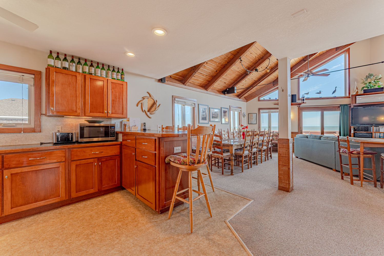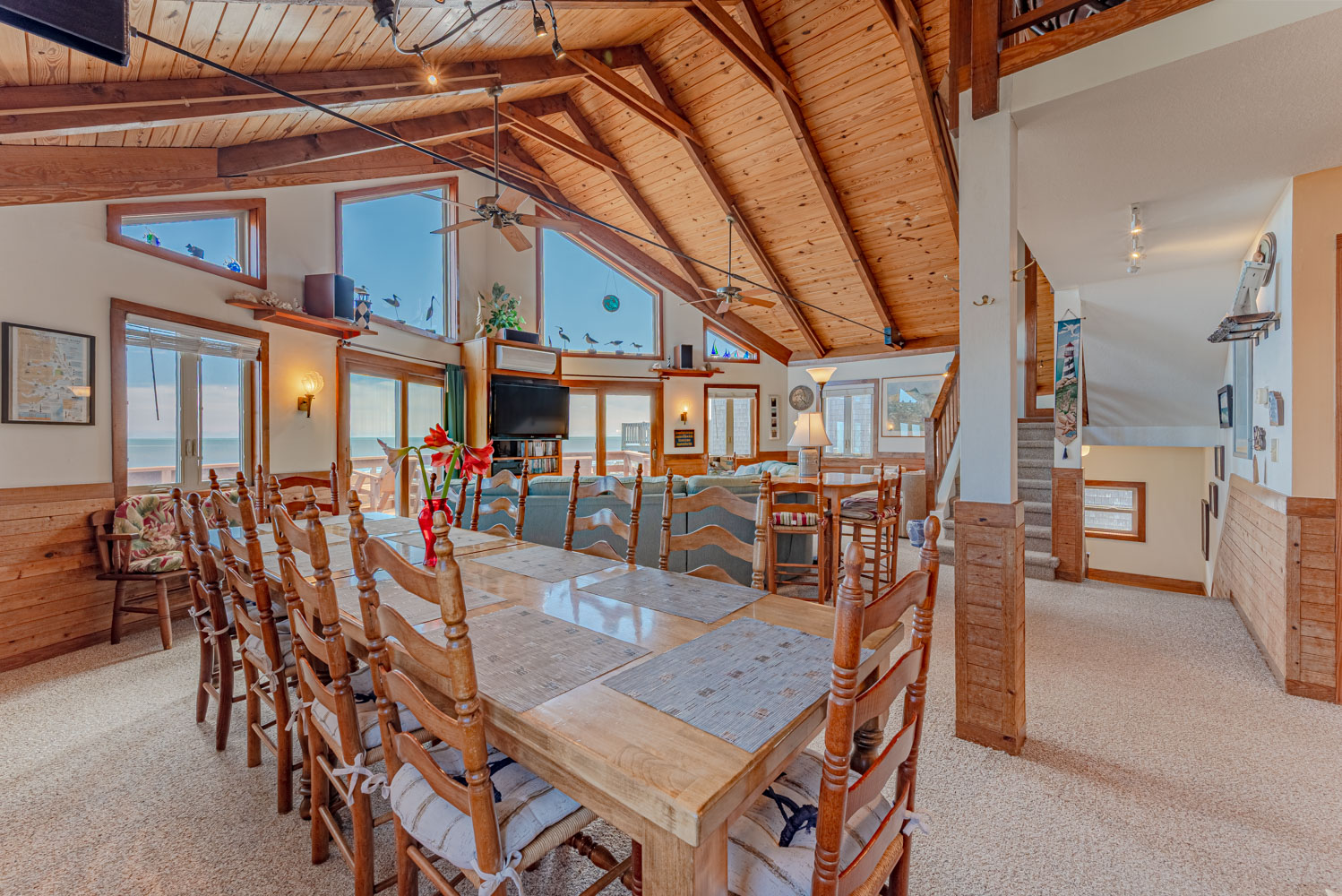 Second Level: Spacious Living/Dining/Kitchen & Great Room w/TV, Surround Sound, Netflix, Gas Fireplace, Endless Ocean Views, Half Bath, Private Suite w/King & Full Bath, Oceanfront Sun Deck w/Picnic Table & Deck Furniture. West Facing Deck w/Picnic Table