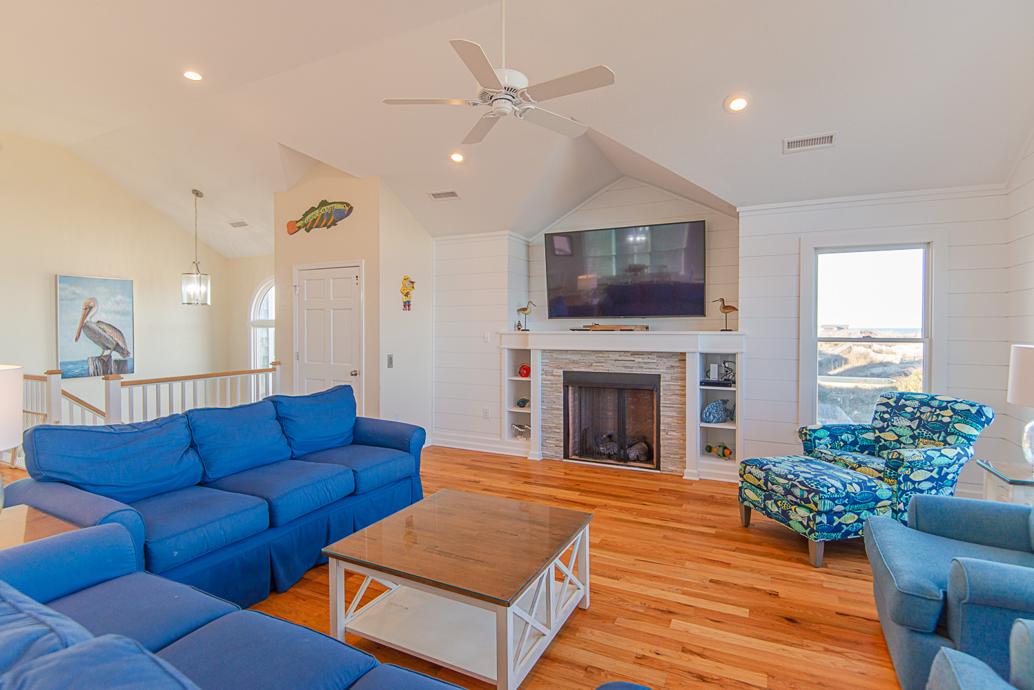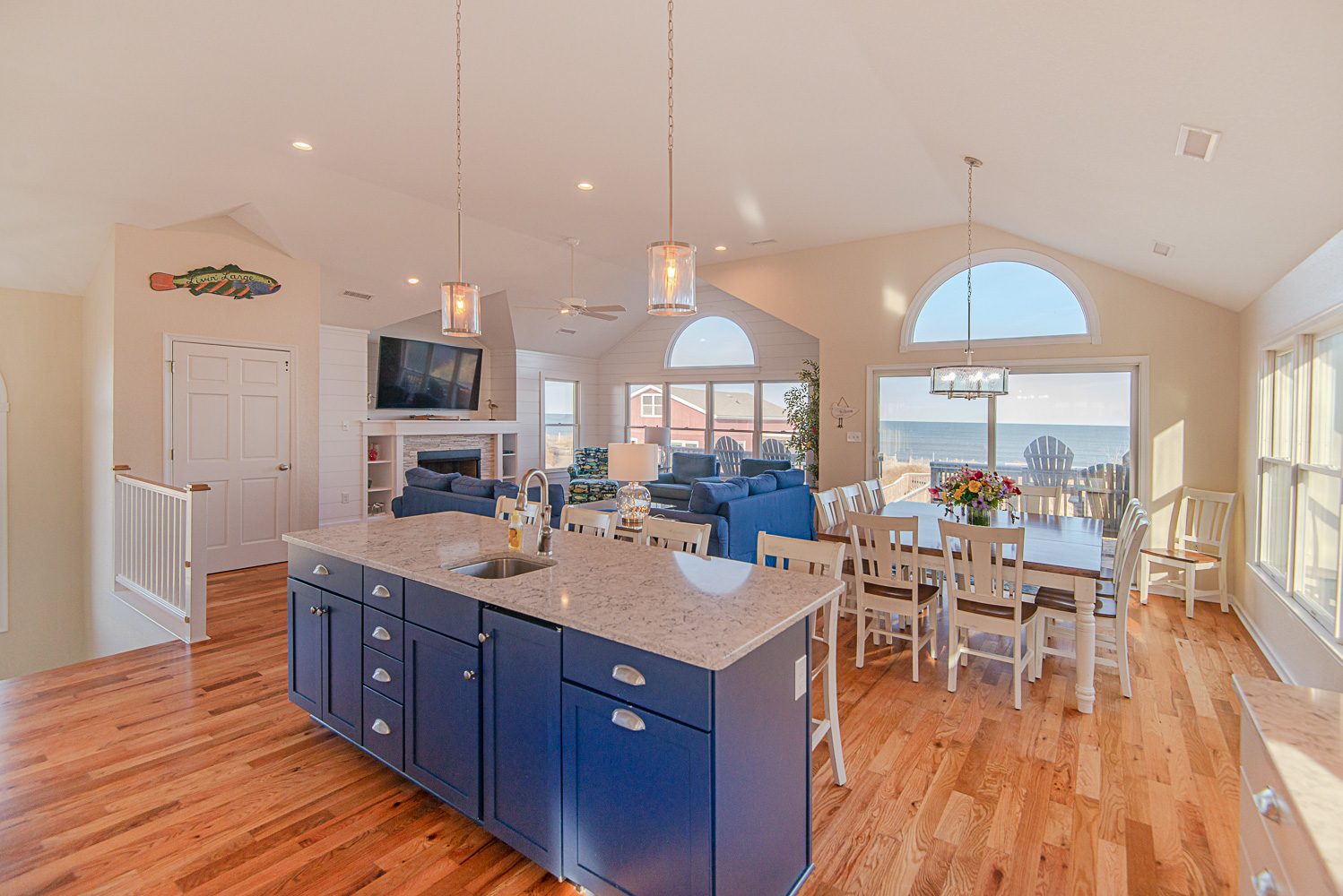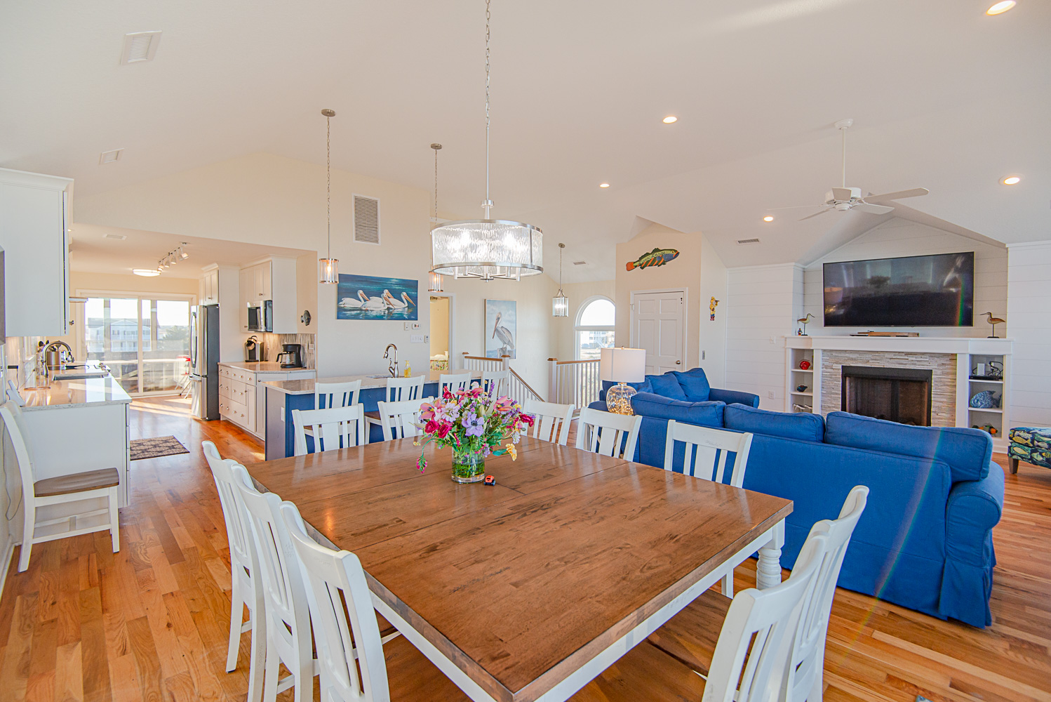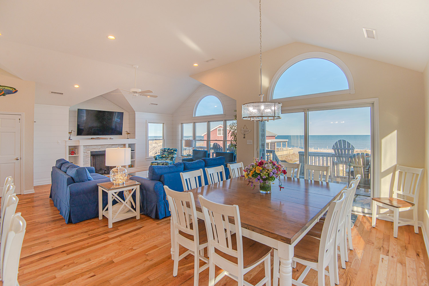 Top Level: Living/Dining/Kitchen Area, 75 Inch Flat Screen Smart HDTV, Half Bath, Private Suite w/King, Smart TV, Full Bath, Dual Sinks, Walk-in Shower (Approx. 6 Inch Threshold), Private Deck; Gas Fireplace, Large Oceanfront Sun Deck, and Screened Porch w/Picnic Table.