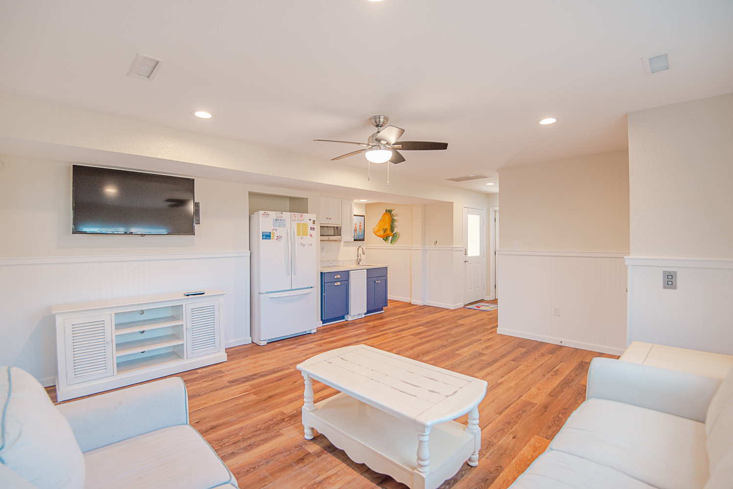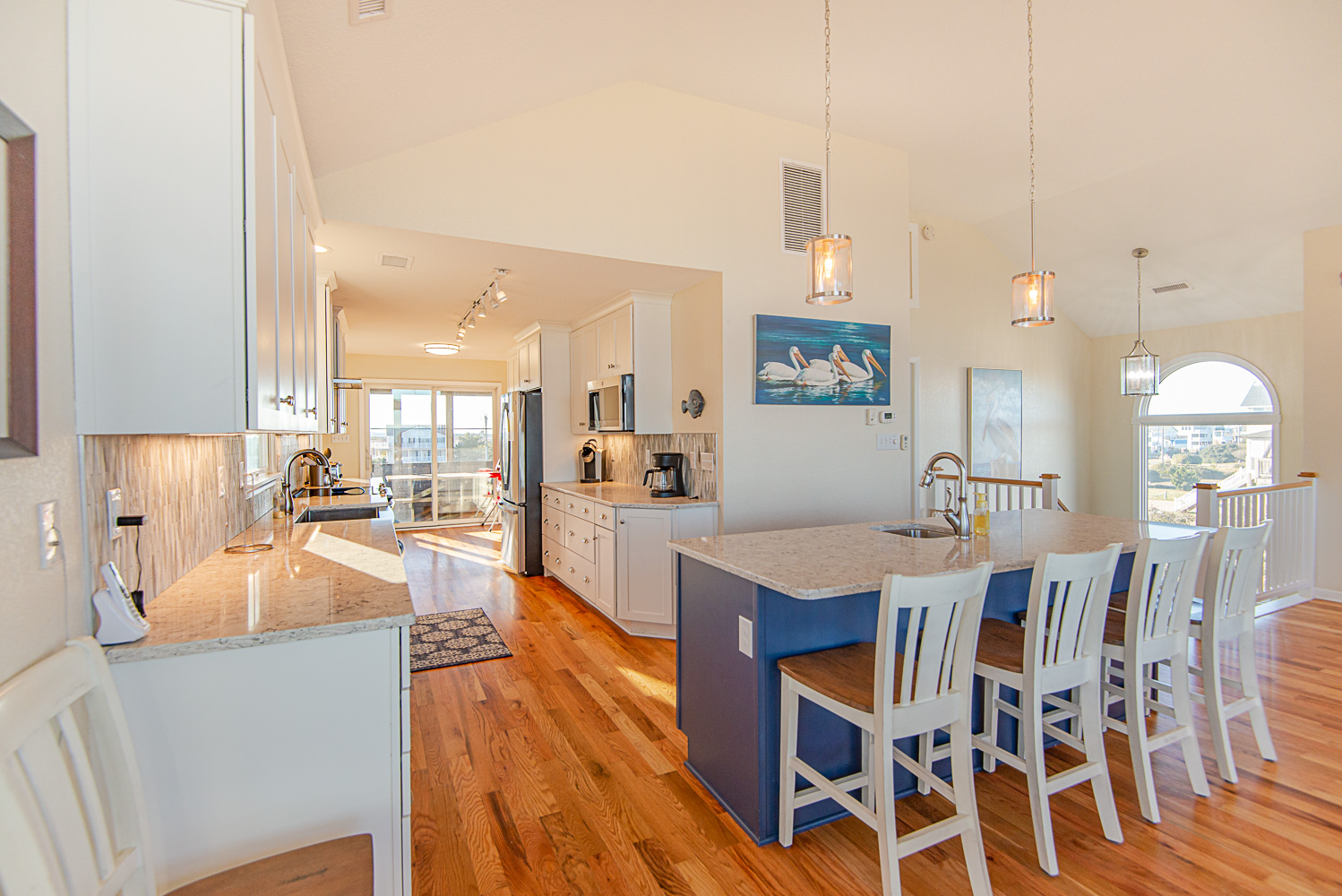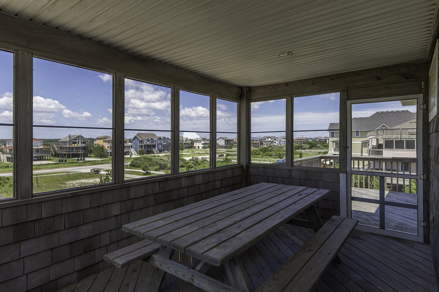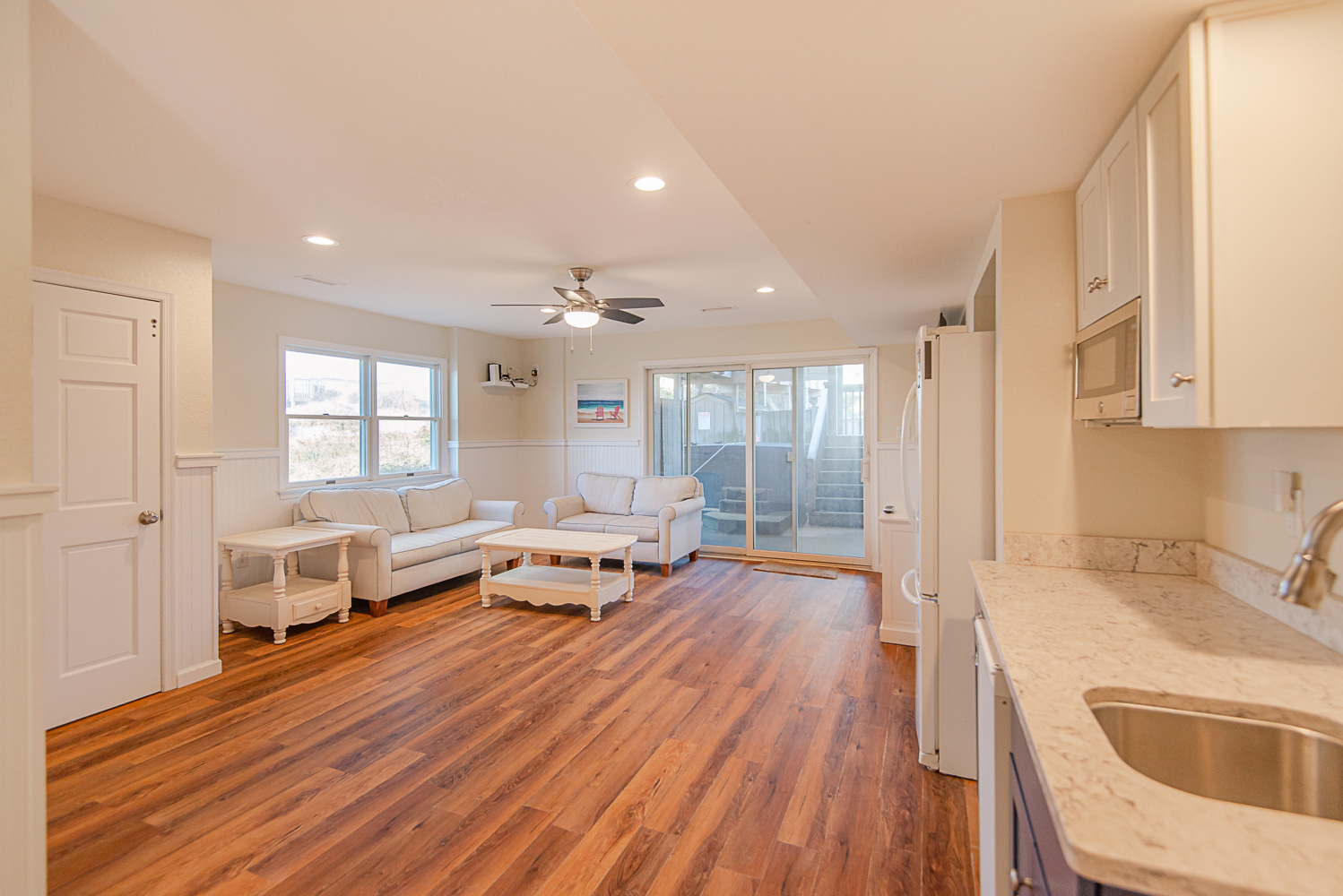 Top Level: Living/Dining/Kitchen Area, 75 Inch Flat Screen Smart HDTV, Half Bath, Private Suite w/King, Smart TV, Full Bath, Dual Sinks, Walk-in Shower (Approx. 6 Inch Threshold), Private Deck; Gas Fireplace, Large Oceanfront Sun Deck, and Screened Porch w/Picnic Table.