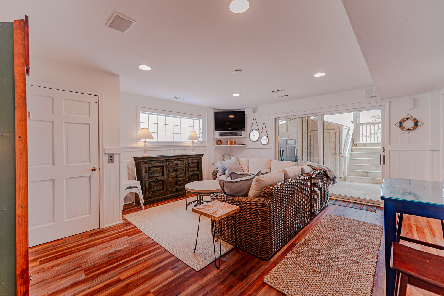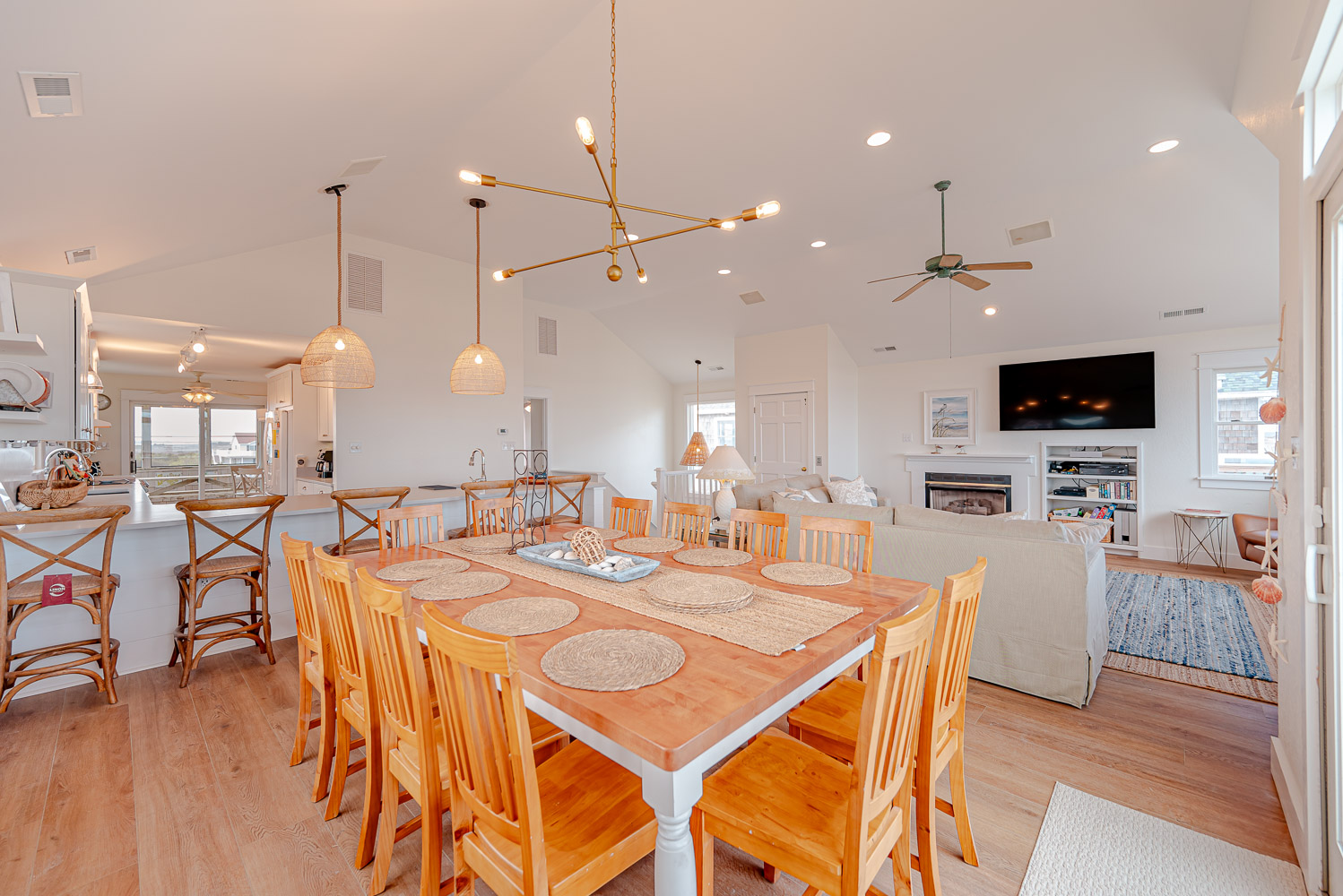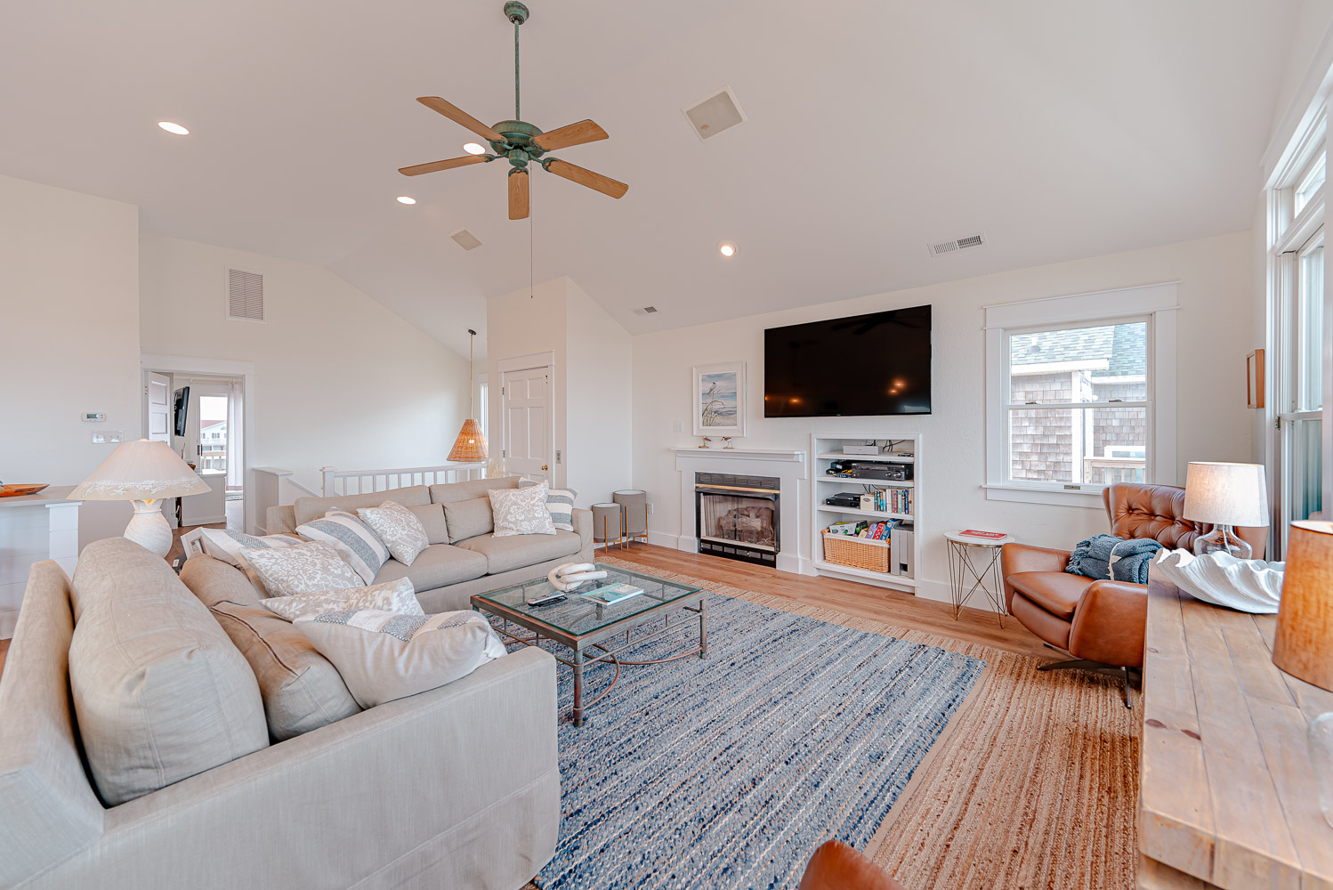 Top Level: Beautifully Decorated Living/Dining/Kitchen Area, w/60 Inch LED HDTV, Blu-ray/DVD, HD Cable DVR, Bluetooth Enabled Stereo w/Surround Sound, Gas Fireplace, Half Bath, Private Suite w/King, iPod Ready Stereo, 40 Inch HDTV, Blu-ray DVD, Full Bath w/Jacuzzi, Handicap Friendly Shower w/Bar and Seat, Large Oceanfront Sun Deck, and Screen Porch w/Ceiling Fan and Picnic Table.