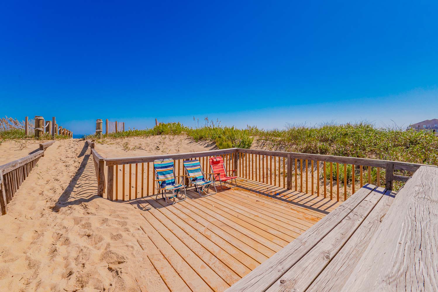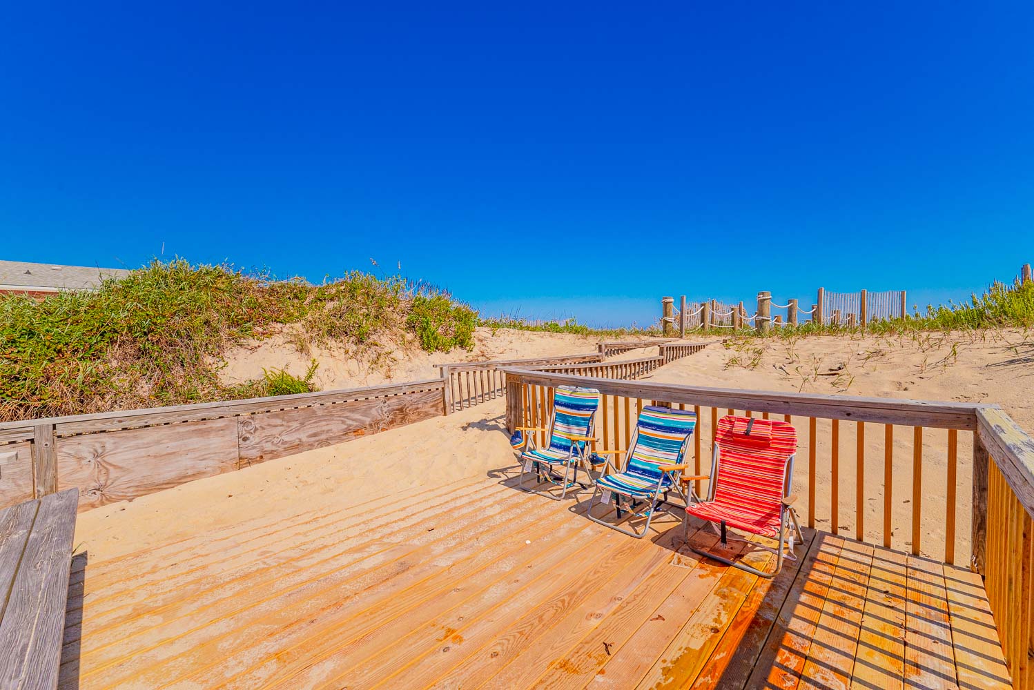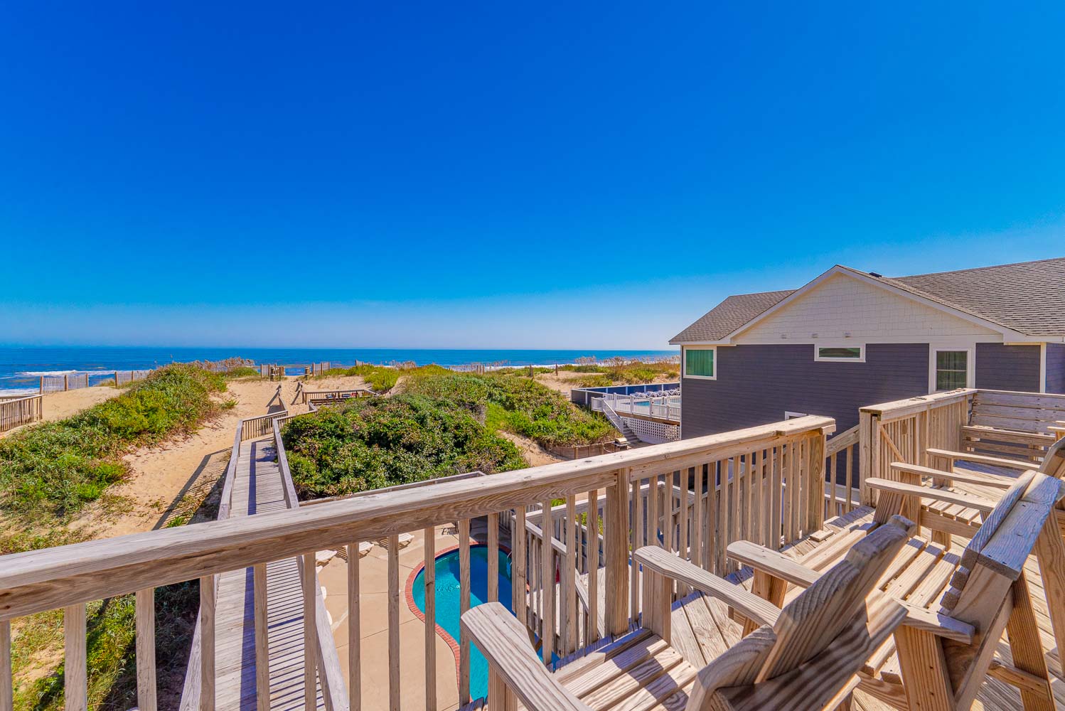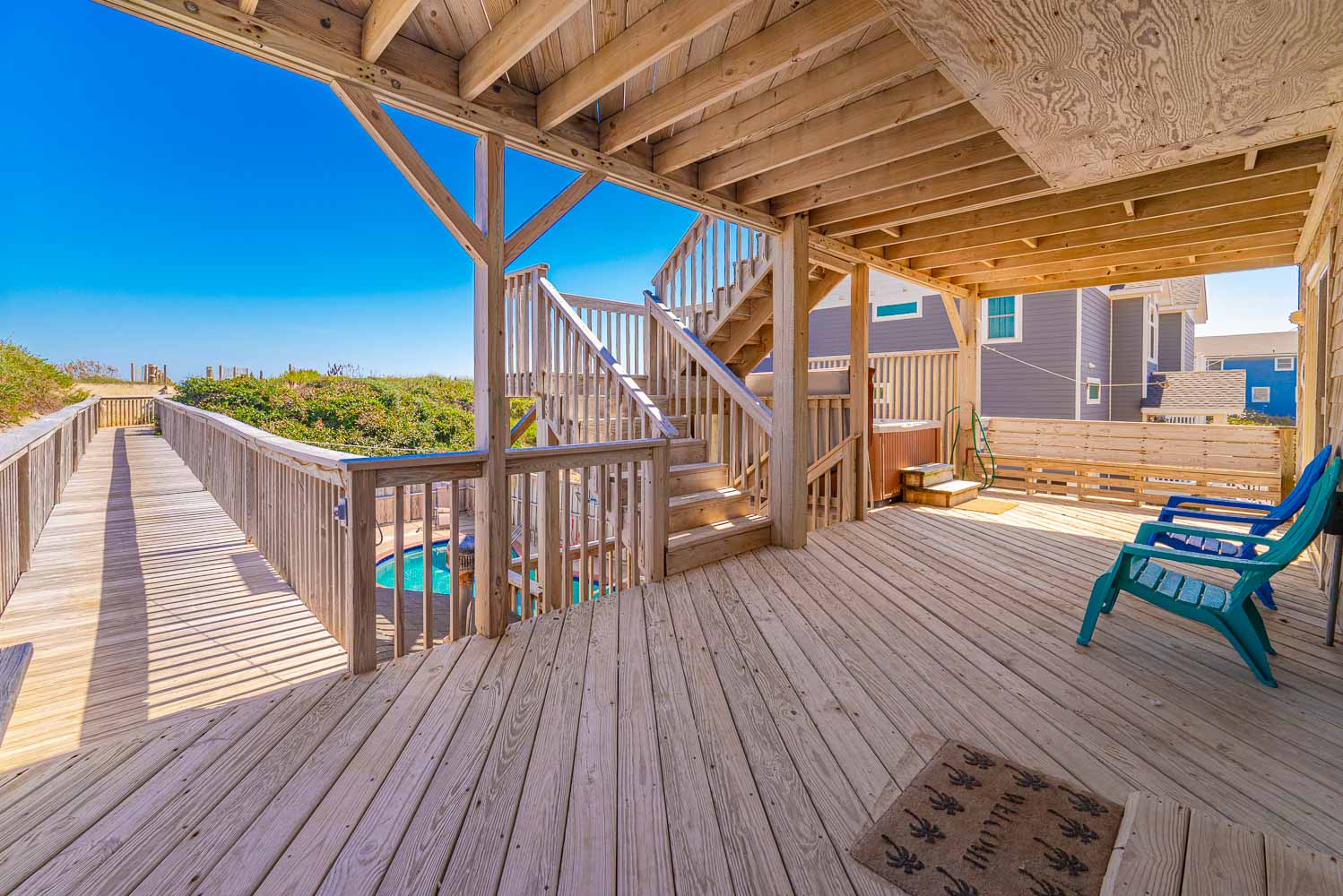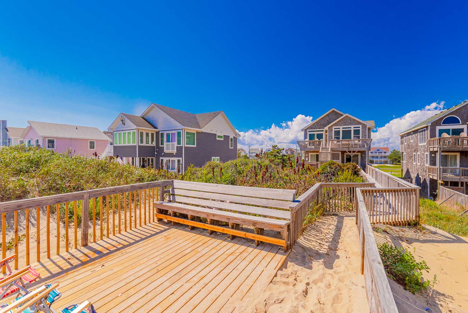 Mid Level: 4 Bedrooms (Private Suite w/King, Full Bath w/Walk-In Shower; Private Suite w/Queen, Full Bath w/Walk-In Shower; 1 w/King; 1 w/2 Singles and a Shared Full Bath), Covered Deck, Porch Swing, Sun Deck w/Hot Tub, and Handicap Accessible Elevated Beach Walkway w/LED Lighting.