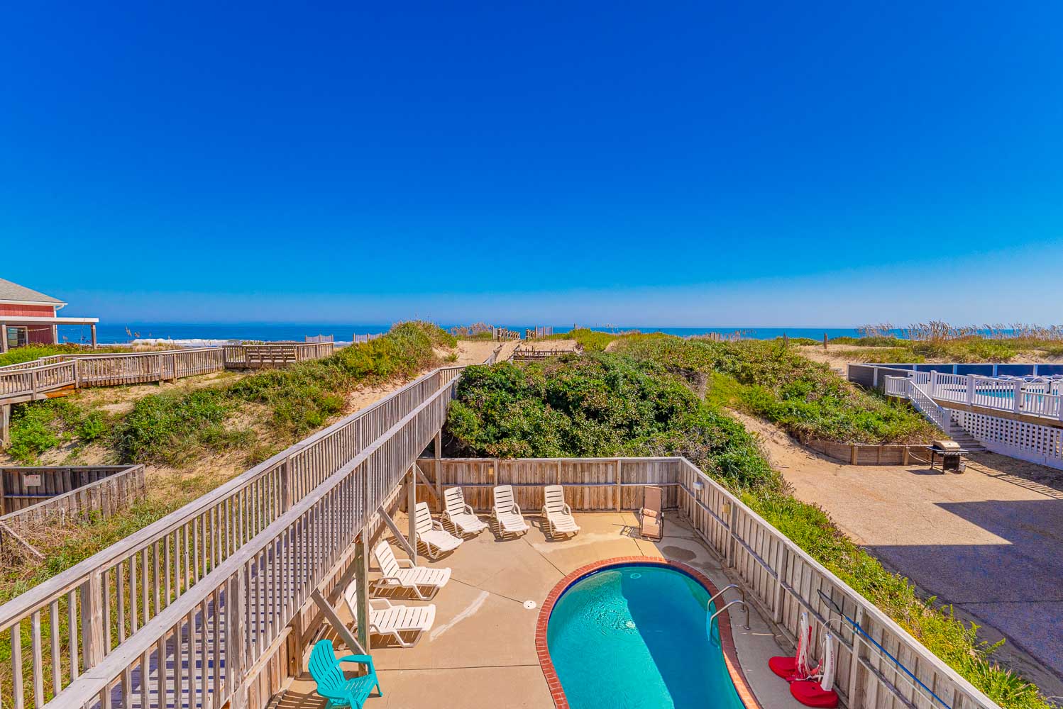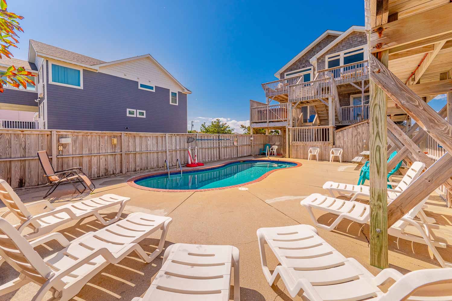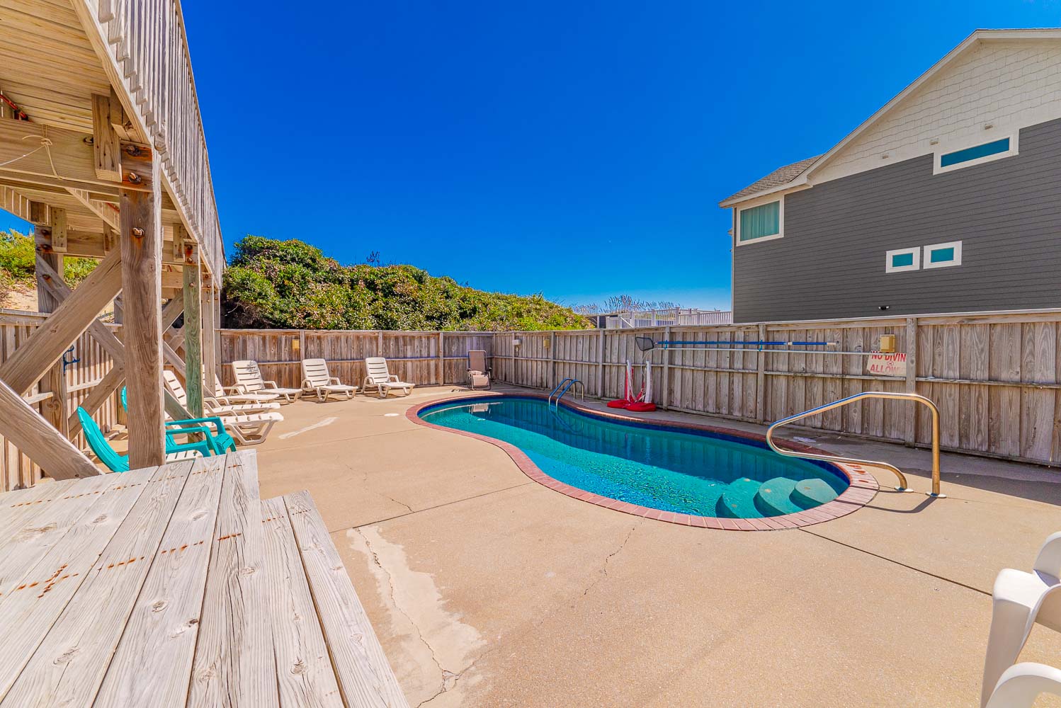 Ground Level: Parking for 7 Cars, Covered Entry, Wet Bar, Refrigerator, Elevator to All Floors, 2 Bedrooms (1 w/Queen; 1 w/1 Bunk Set, Single), Full Bath, Den, 37 Inch TV, Books, Games, Puzzles, Access to Patio Area, Outdoor Speakers, Private Heated Swimming Pool - Open Seasonally (Can Be Heated for $600.00 Per Week, Plus Tax. Please Bear in Mind That Pool Temperature is Subject to Outside Temperatures and Conditions), Enclosed Outside Shower, Gas Grill, Picnic Table, Basketball Goal, and Fish Cleaning Station.