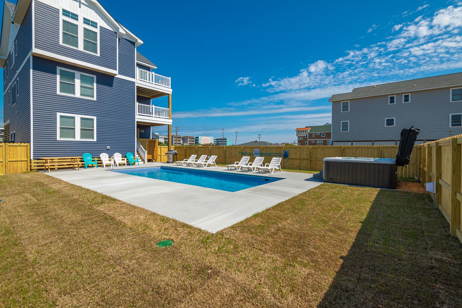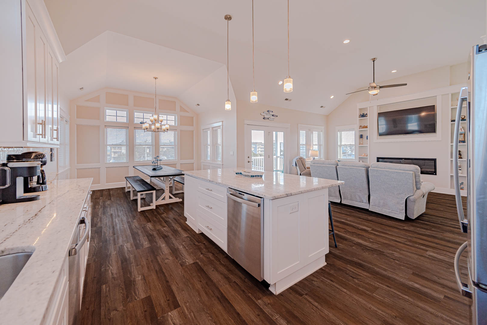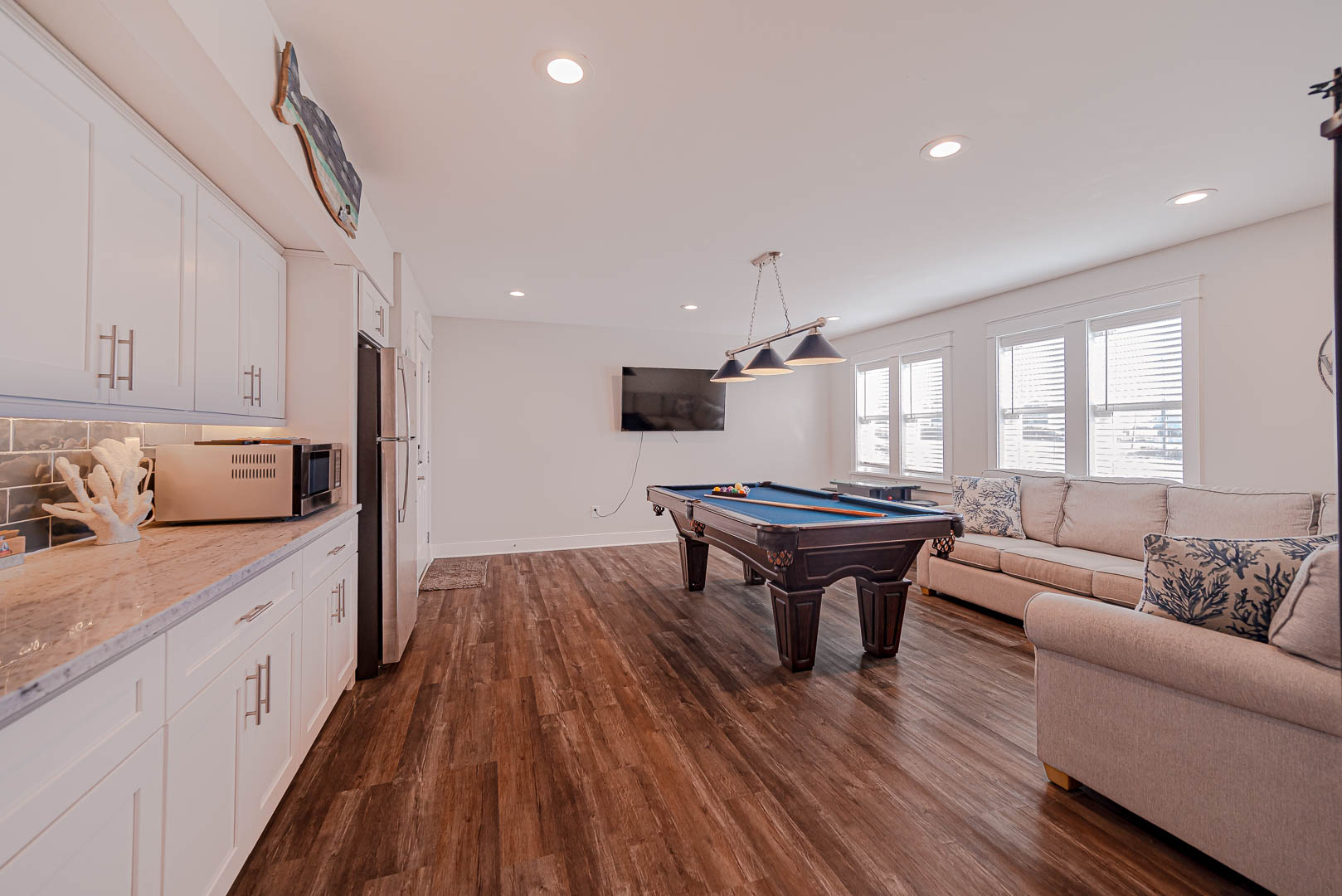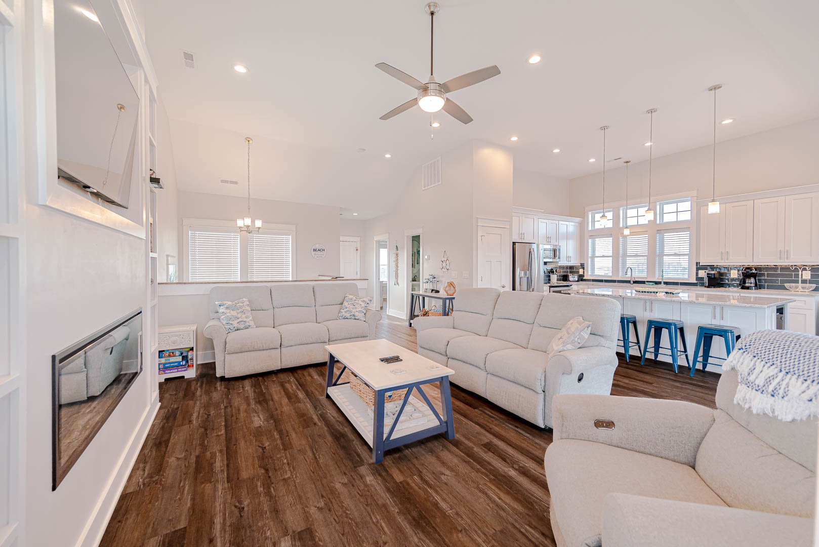 The top floor features the Living/Dining/Kitchen area that is open and speciaous, has cathedral ceilings, gourmet kitchen w/island bar, stainless steel appliances and quartz counters. With plenty of room to gather, your family will find this to be the focal point for gathering while preparing meals, or spending quality time together after a day spent on the beach or in the pool. Their is a sun deck and covered porche on this level, a private suite, and excellent views! The middle level provides 4 bedrooms, and two a covered porches. The first level features the rec. room w/pool table, private suite and access to the pool patio area where your family will enjoy swimming and plenty of room to run and play in the completely fenced rear yard.