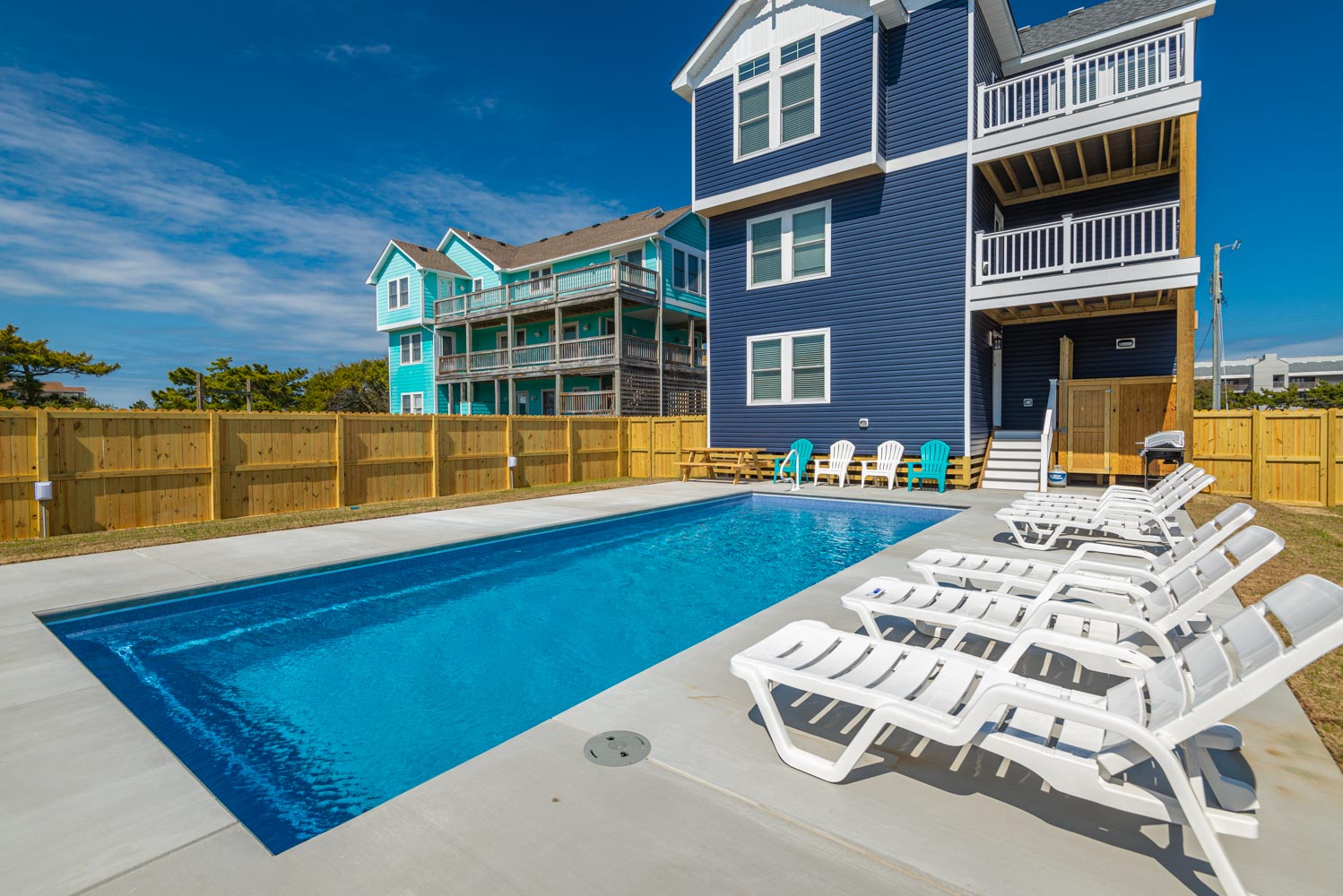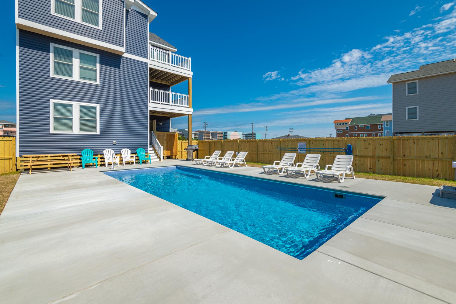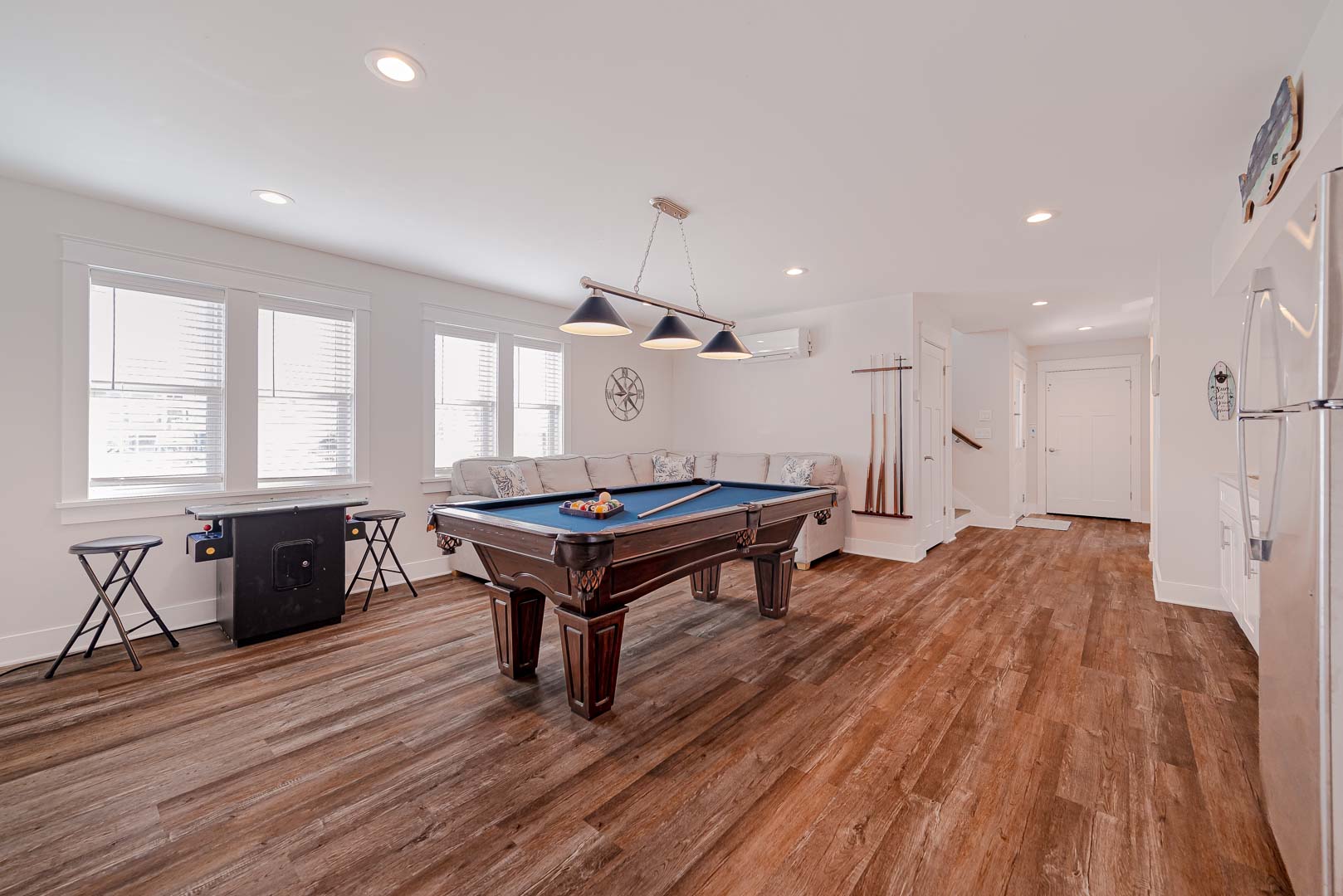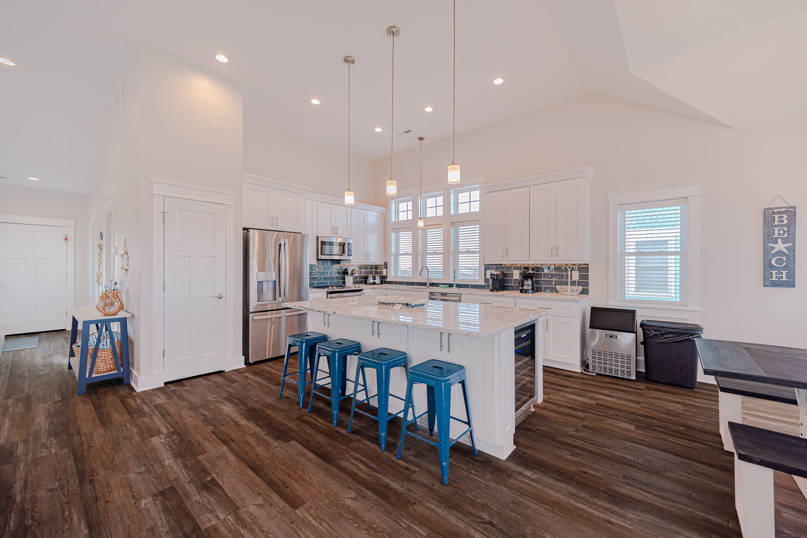 The top floor features the Living/Dining/Kitchen area that is open and speciaous, has cathedral ceilings, gourmet kitchen w/island bar, stainless steel appliances and quartz counters. With plenty of room to gather, your family will find this to be the focal point for gathering while preparing meals, or spending quality time together after a day spent on the beach or in the pool. Their is a sun deck and covered porche on this level, a private suite, and excellent views! The middle level provides 4 bedrooms, and two a covered porches. The first level features the rec. room w/pool table, private suite and access to the pool patio area where your family will enjoy swimming and plenty of room to run and play in the completely fenced rear yard.