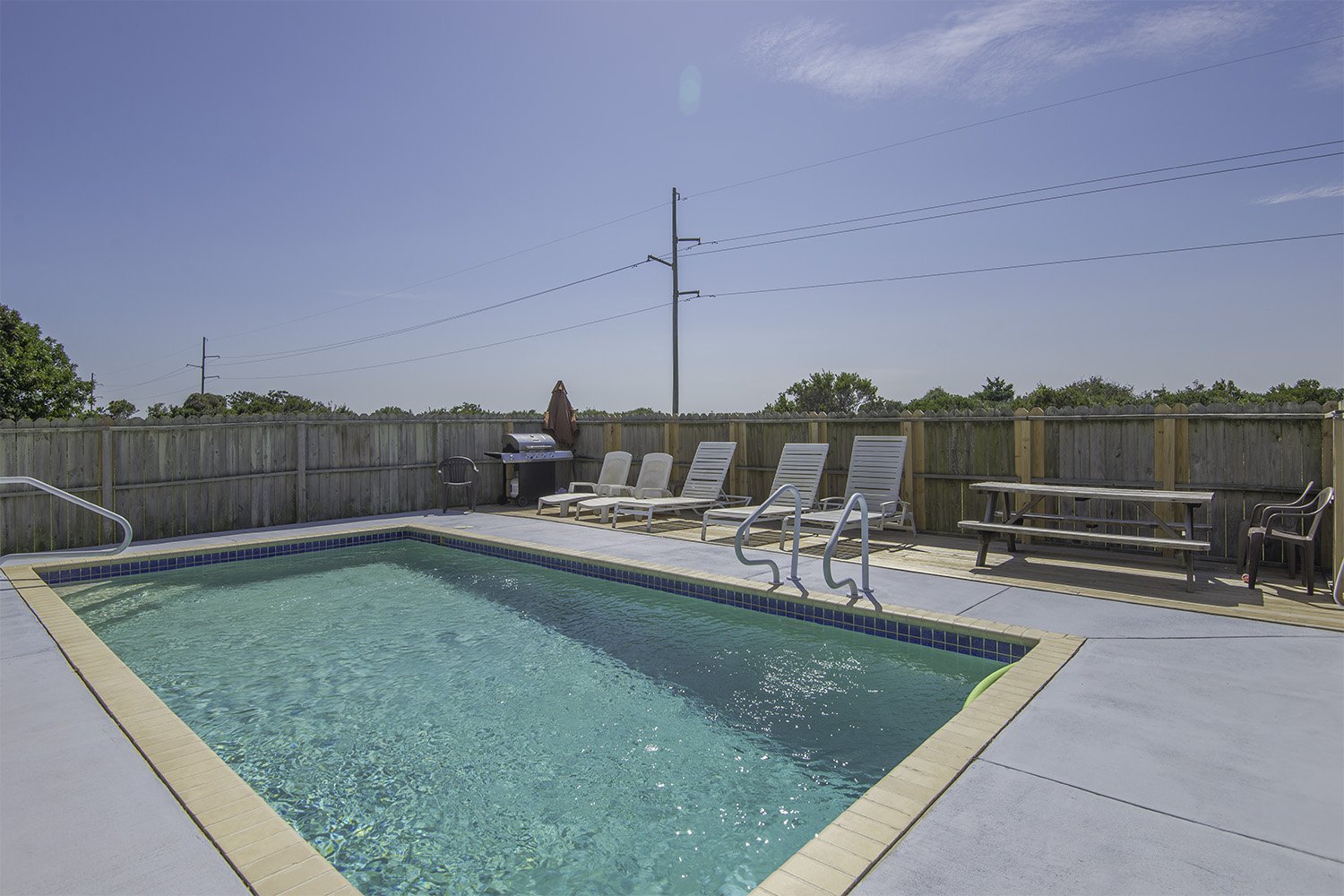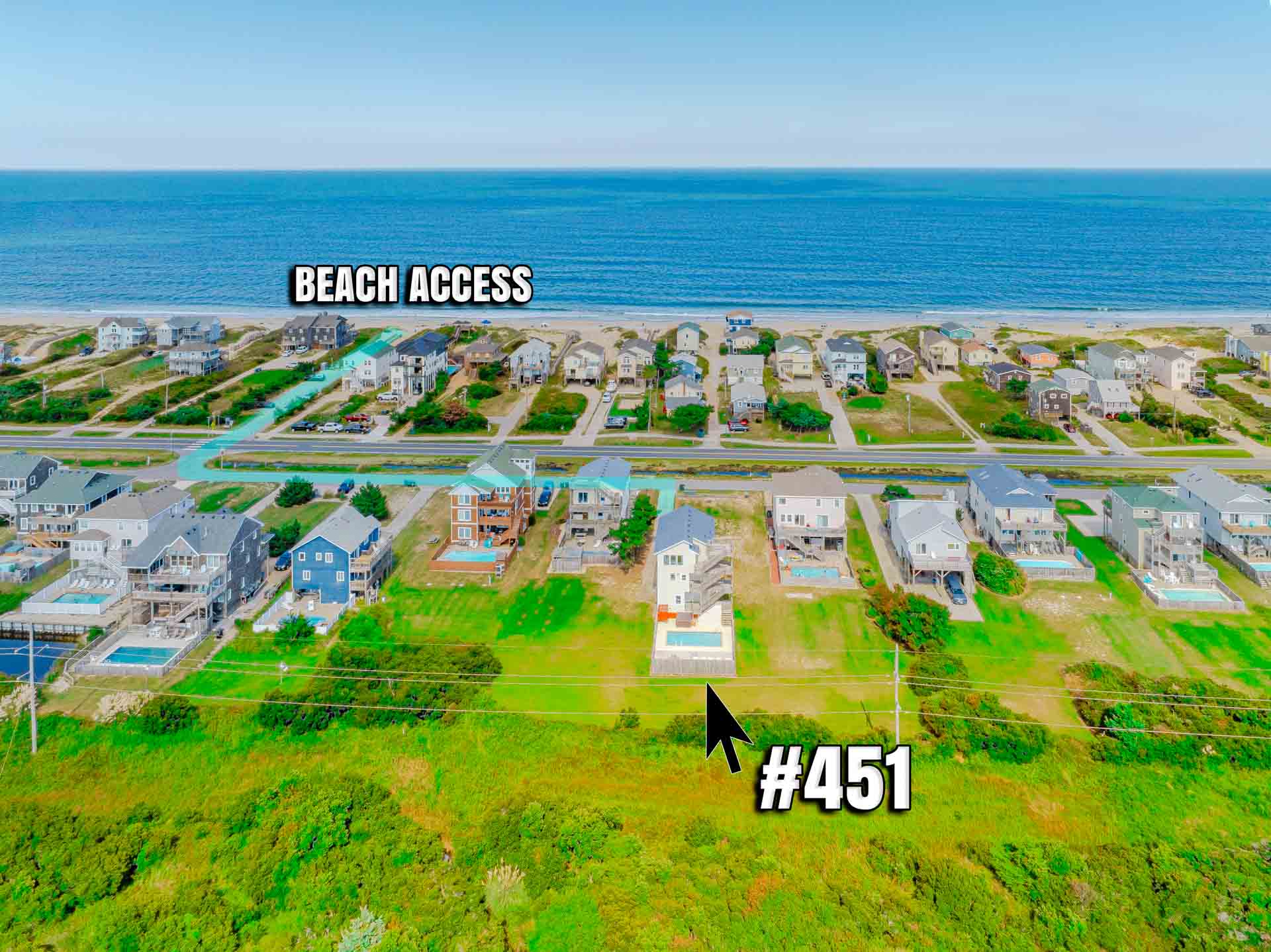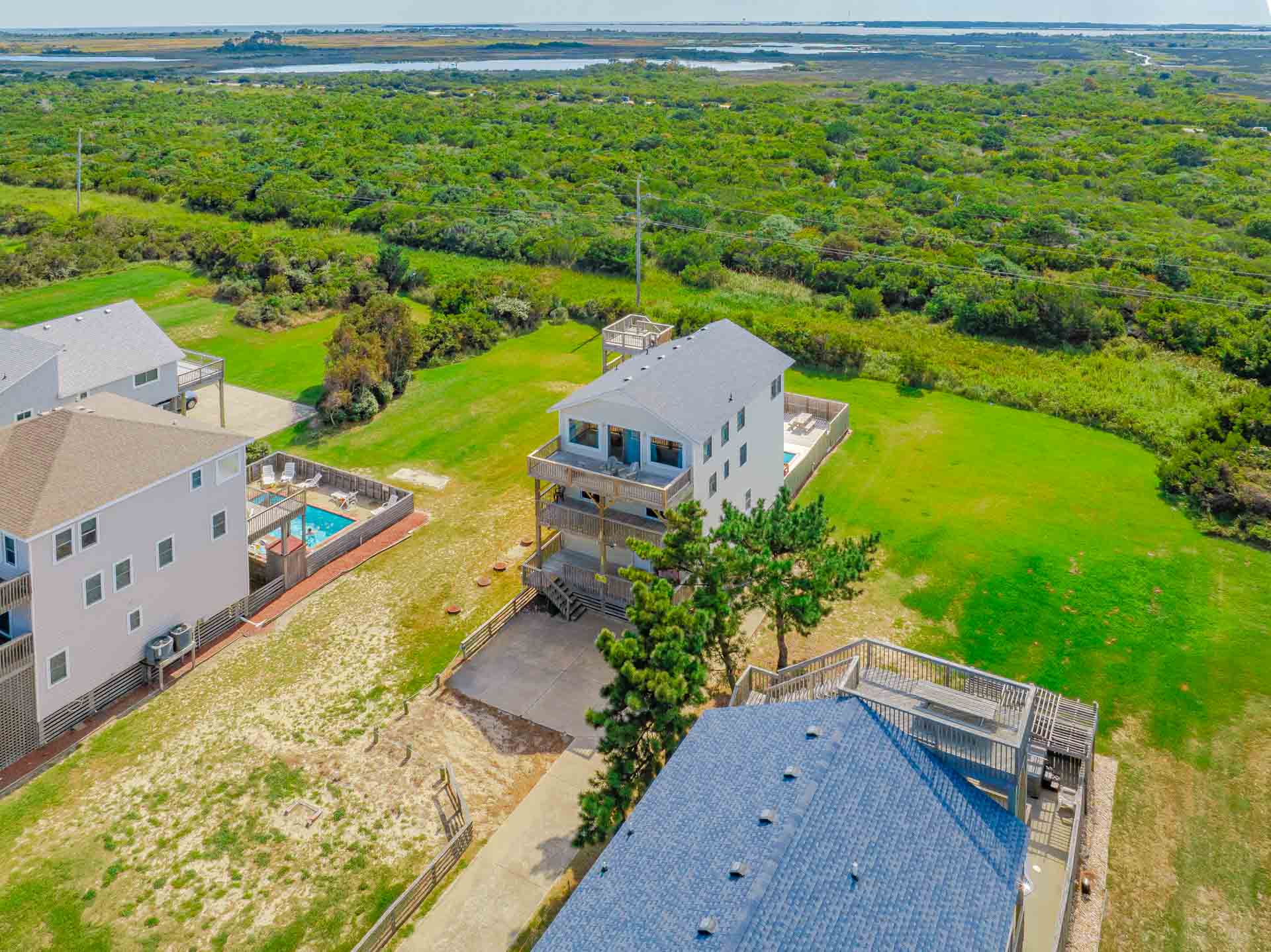 Enjoy the Peace and Tranquility this terrific South Nags Head beach home has to offer. Spacious and well-appointed, this home is located adjacent to the Cape Hatteras National Park, and provides wonderful sunrise views over the Atlantic and incredible Sunsets Over the Roanoke Sound. Expansive decking and amenities that include your own Private Swimming Pool, Hot Tub, and Rec. Room w/Pool Table ensure a great vacation for all. The Beach is a short walk away, only 500 Ft. to June Street access or 700 Ft. to James Street access. Be sure to take advantage of the South Creek Acres Community Swimming Pool and Tennis/Pickle Ball courts.
