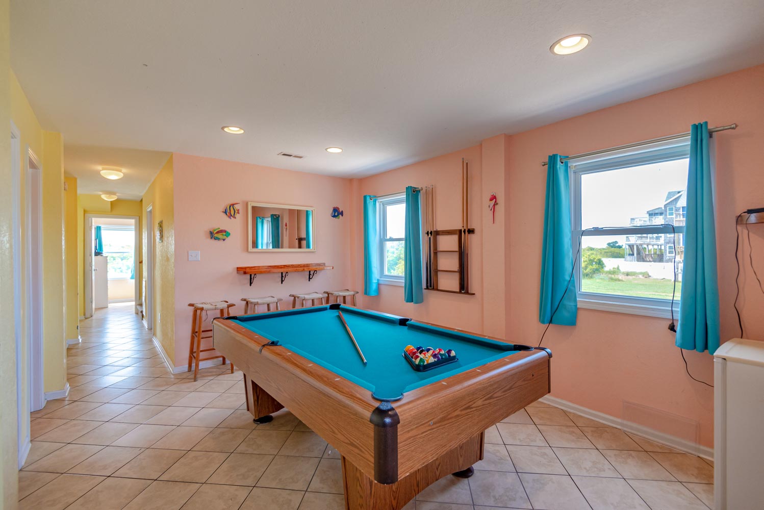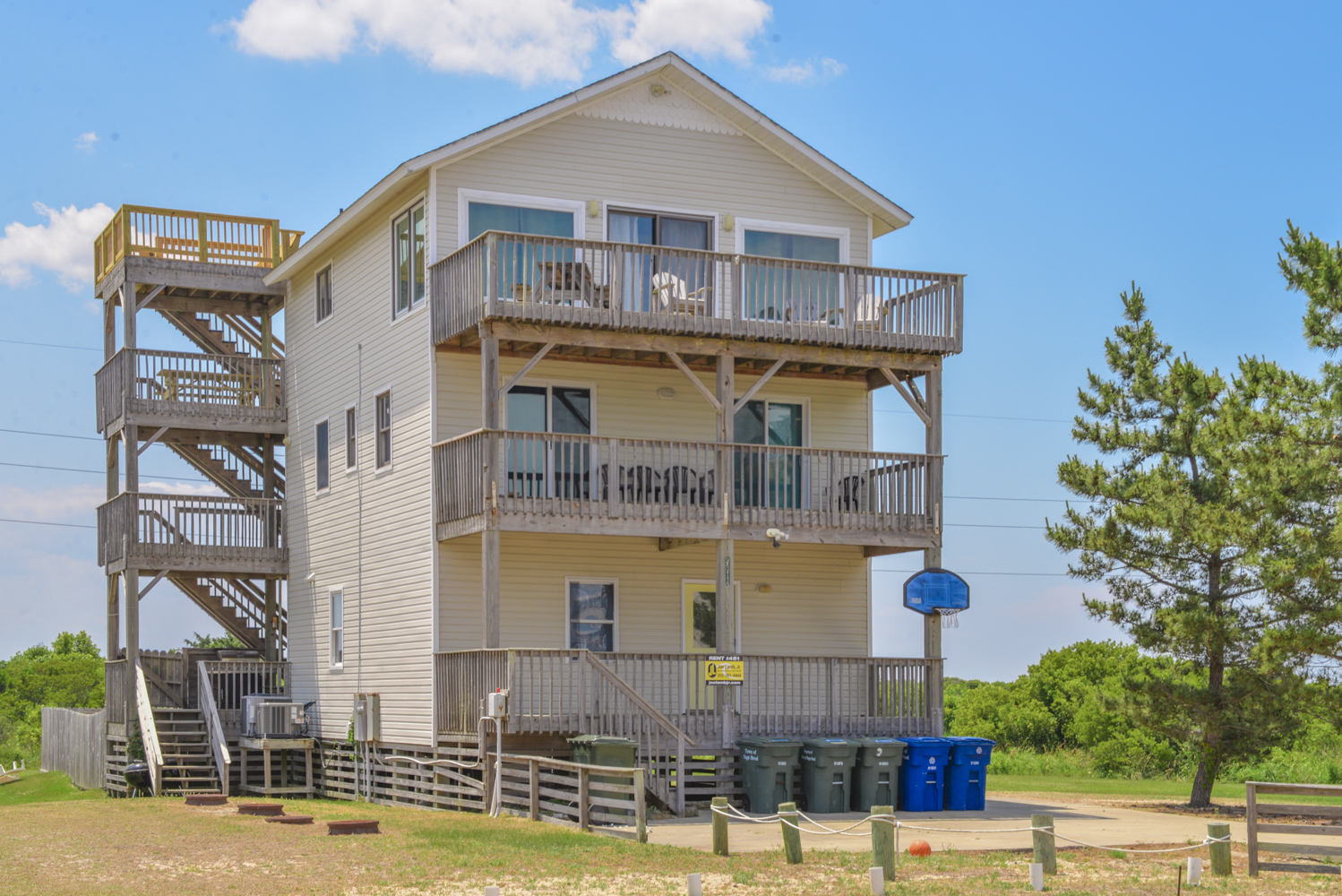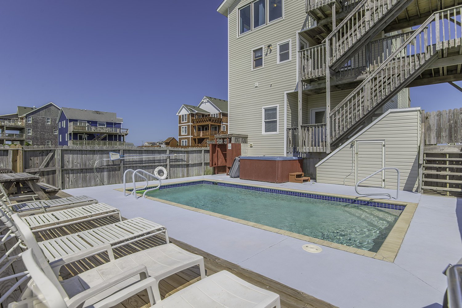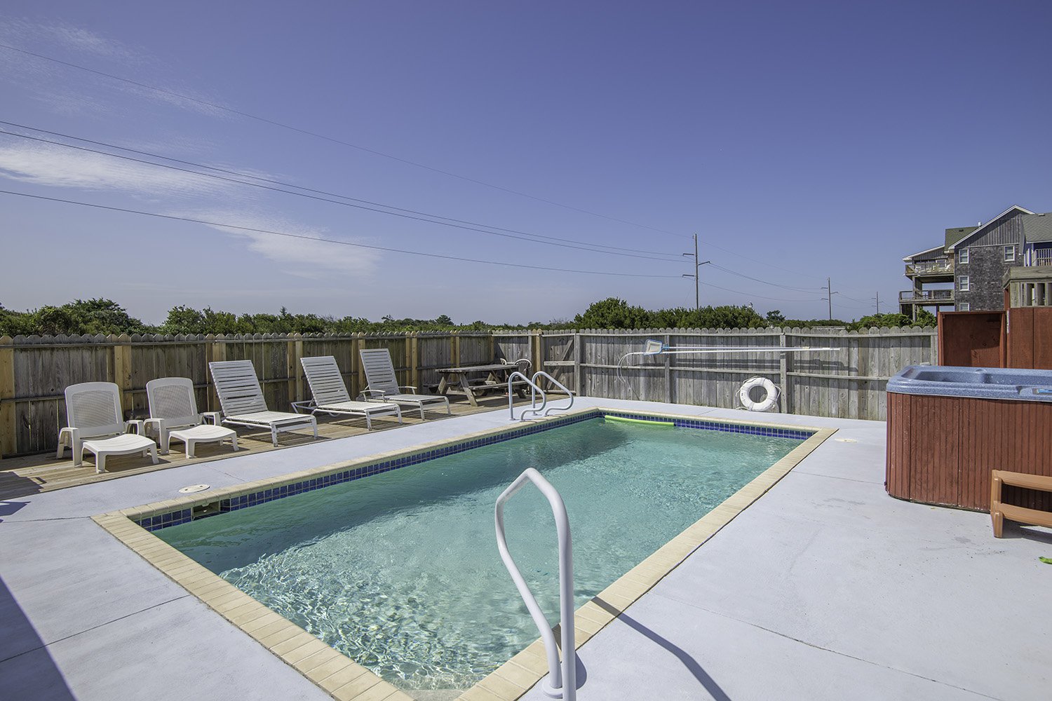 Enjoy the Peace and Tranquility this terrific South Nags Head beach home has to offer. Spacious and well-appointed, this home is located adjacent to the Cape Hatteras National Park, and provides wonderful sunrise views over the Atlantic and incredible Sunsets Over the Roanoke Sound. Expansive decking and amenities that include your own Private Swimming Pool, Hot Tub, and Rec. Room w/Pool Table ensure a great vacation for all. The Beach is a short walk away, only 500 Ft. to June Street access or 700 Ft. to James Street access. Be sure to take advantage of the South Creek Acres Community Swimming Pool and Tennis/Pickle Ball courts.