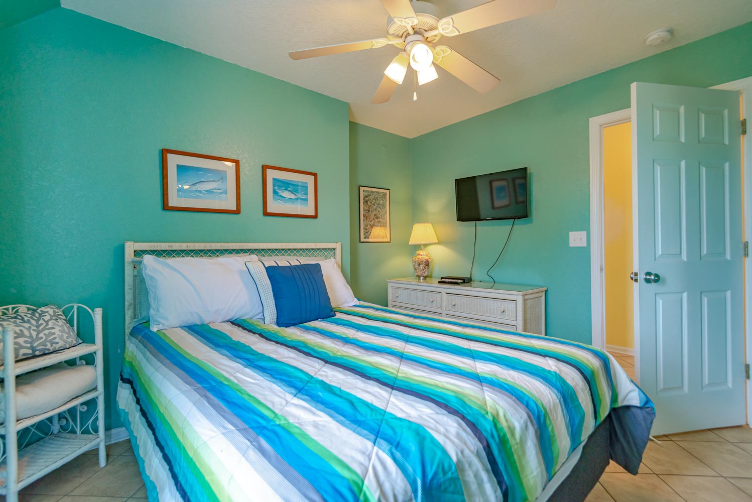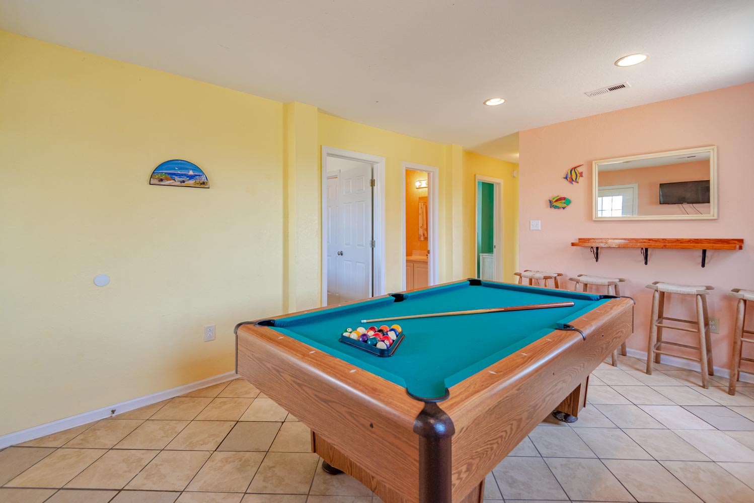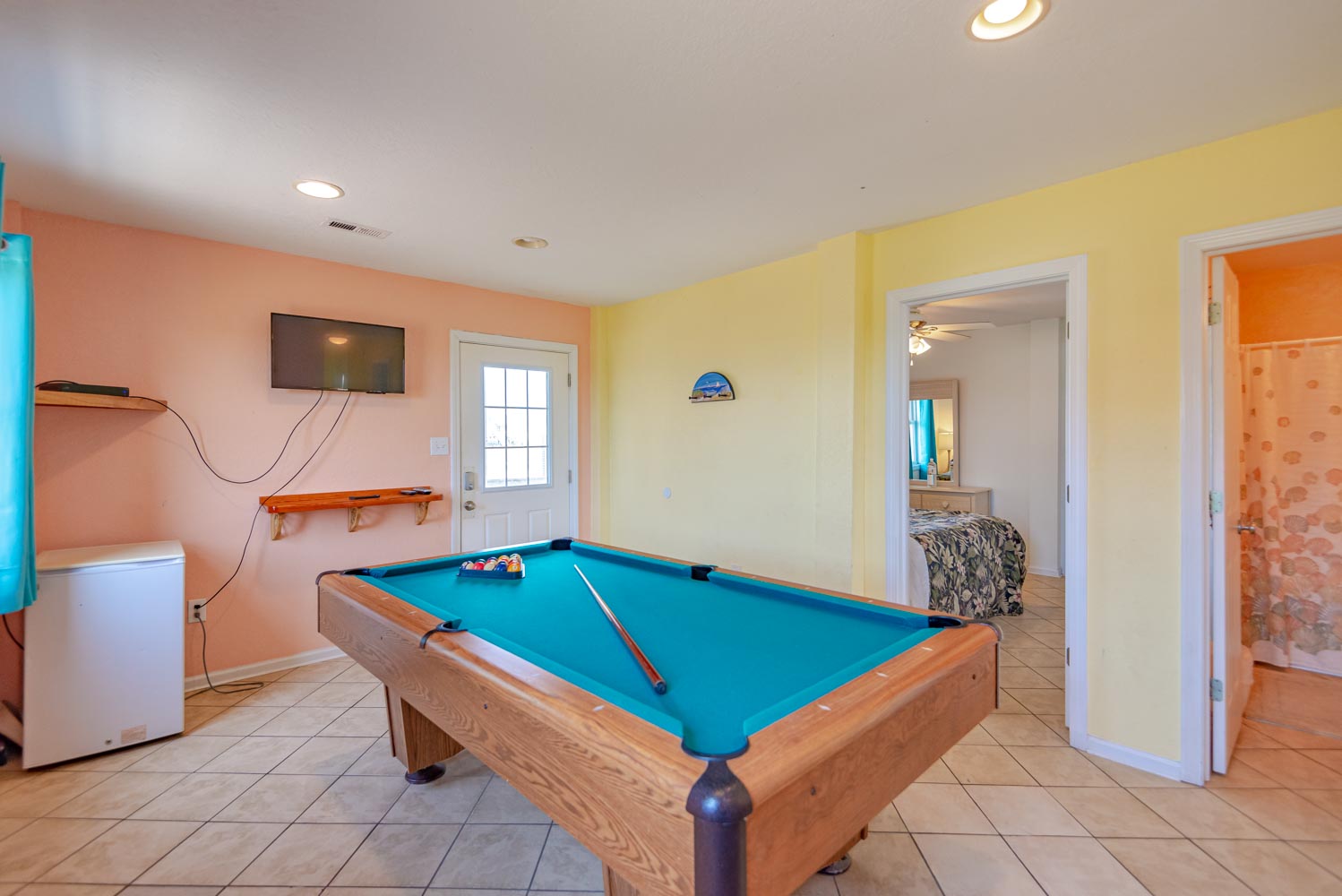 Level One: Rec. Room/Den w/Pool Table and TV, Small Refrigerator, 3 Bedrooms (Private Suite w/King, TV, Full Bath; 1 w/Queen, TV; 1 w/Duo Bunk, TV), Full Hall Bath, 2 Covered Decks, and Access to Patio Area.
