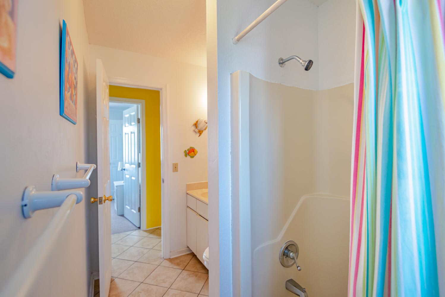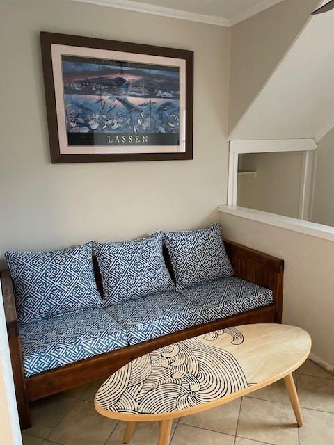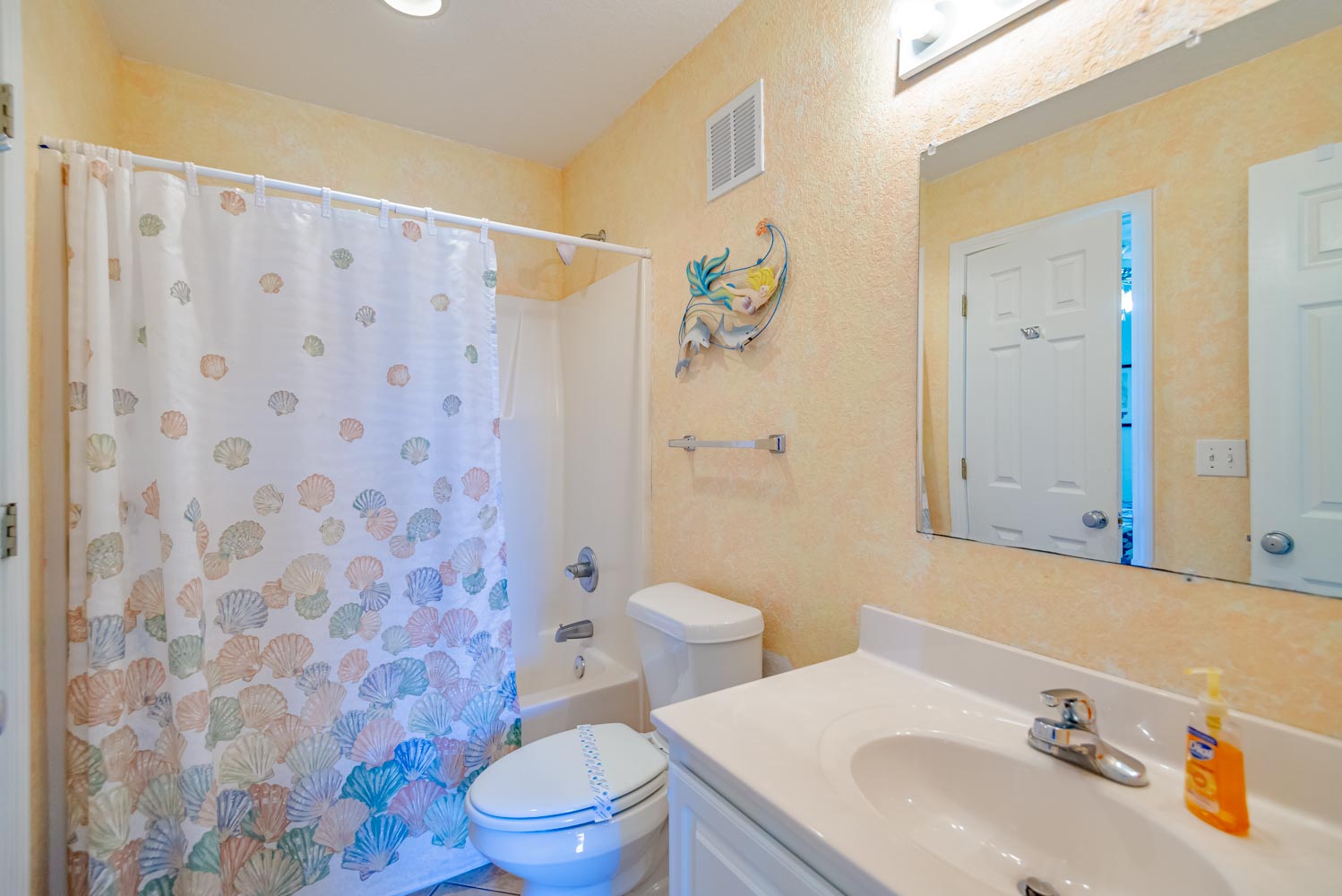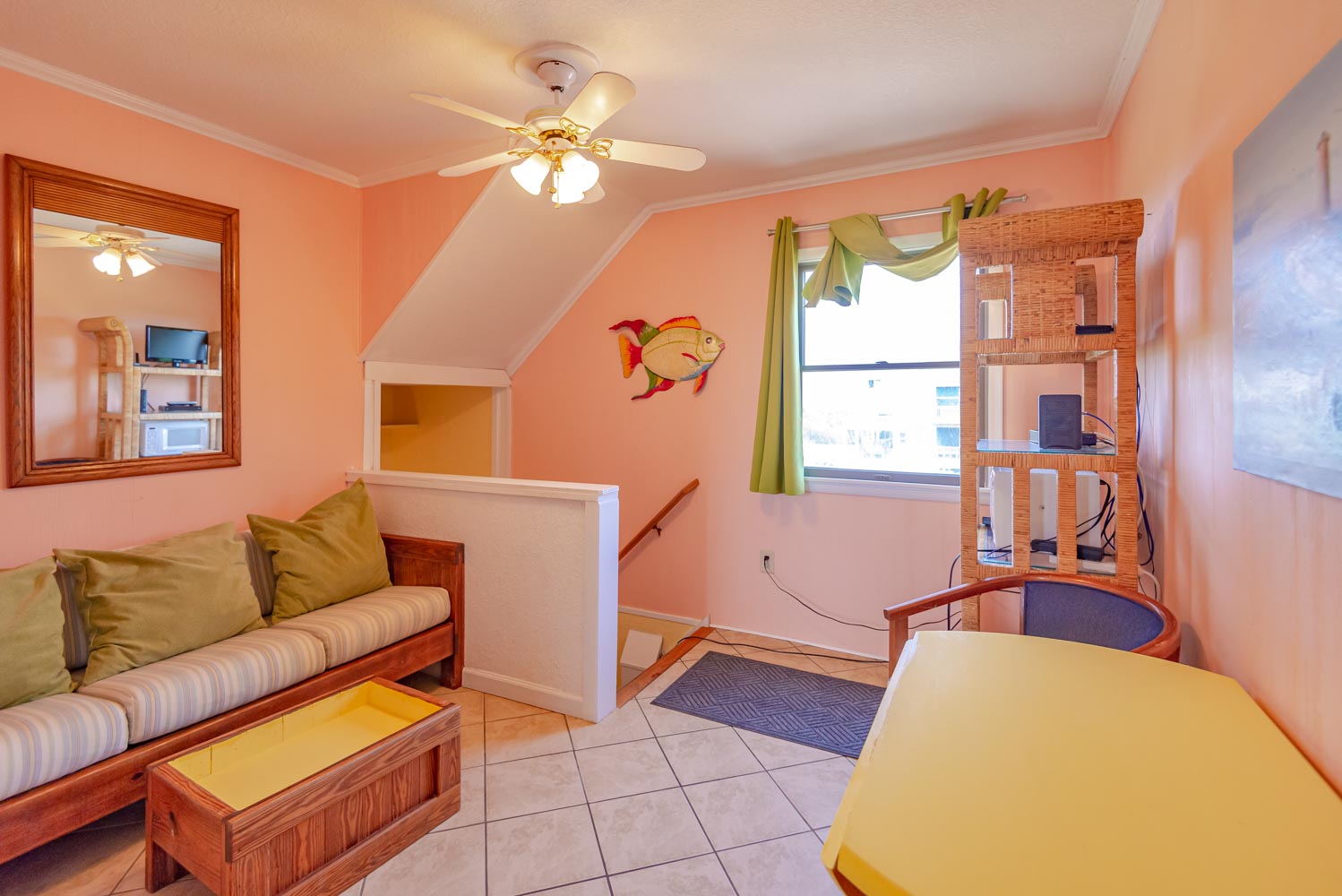 Mid Level: 3 Bedrooms (2 w/Queens, TV, Shared Bath; 1 w/Queen, TV), Full Hall Bath, Den w/TV, DVD; Laundry Area, and 2 Covered Decks.