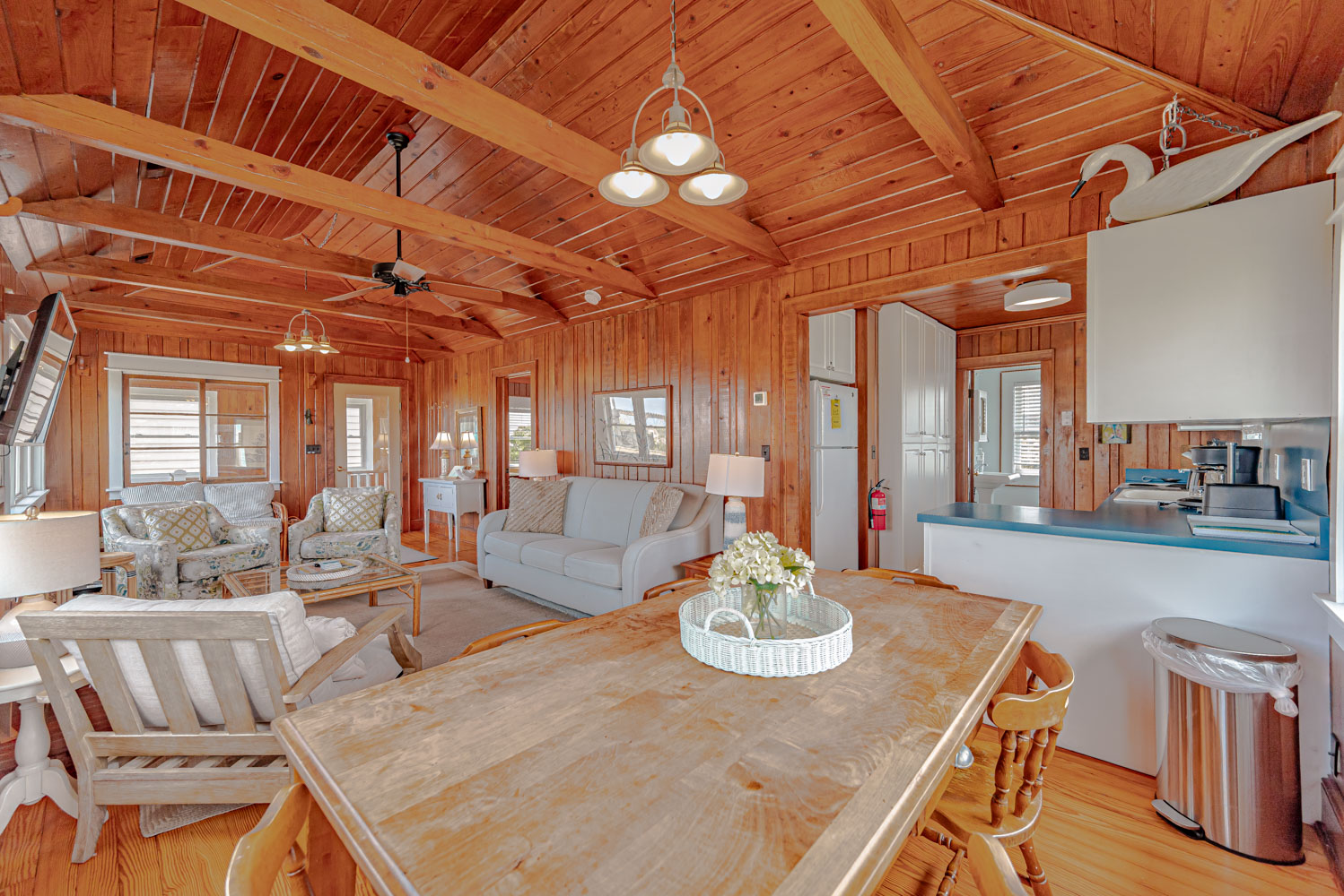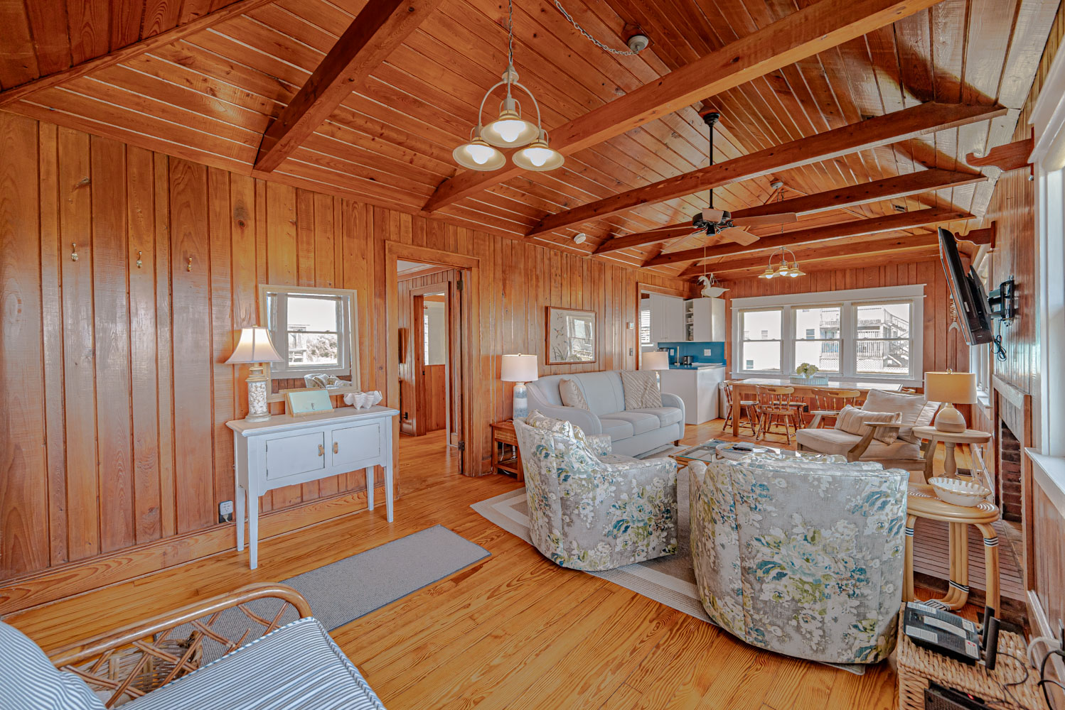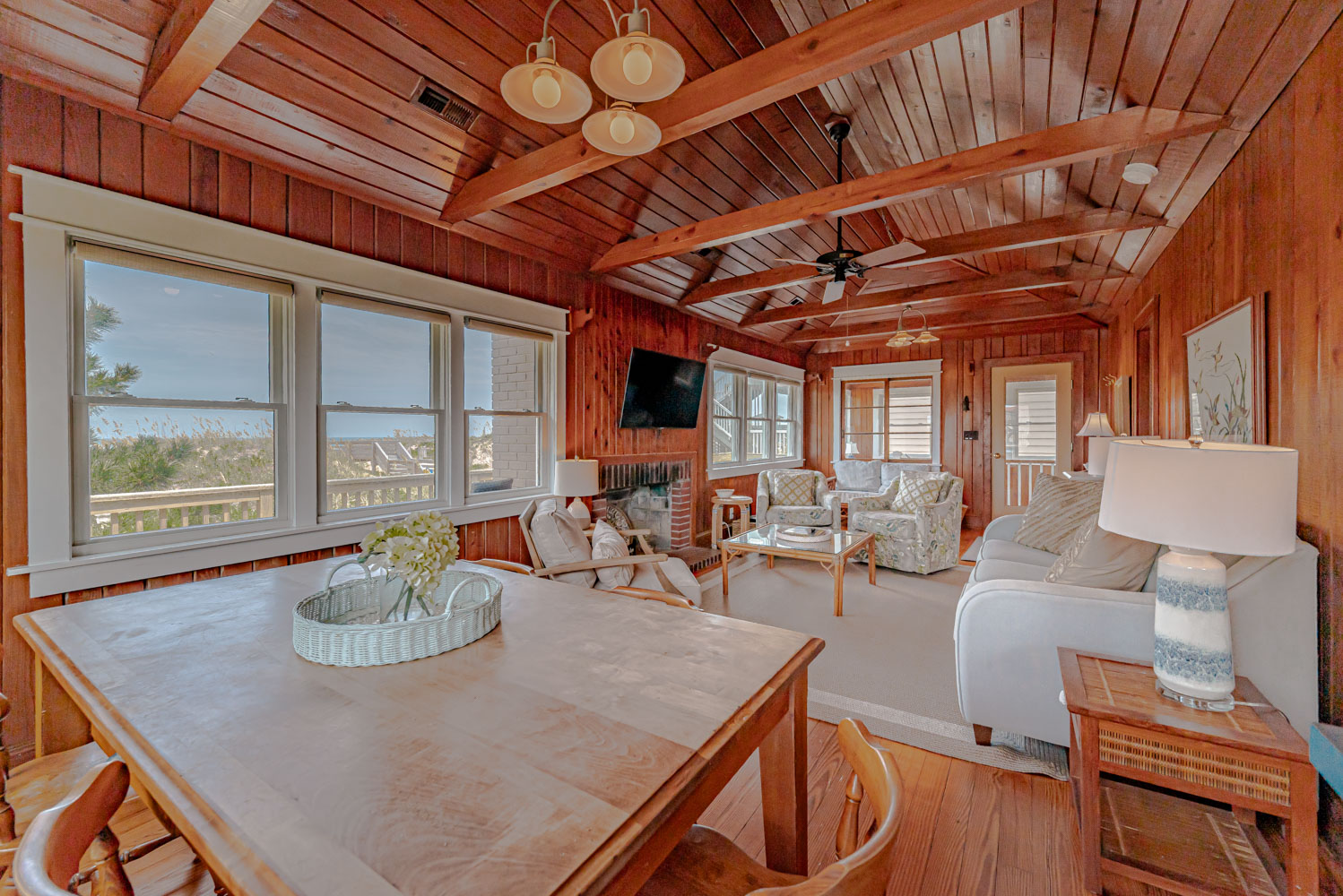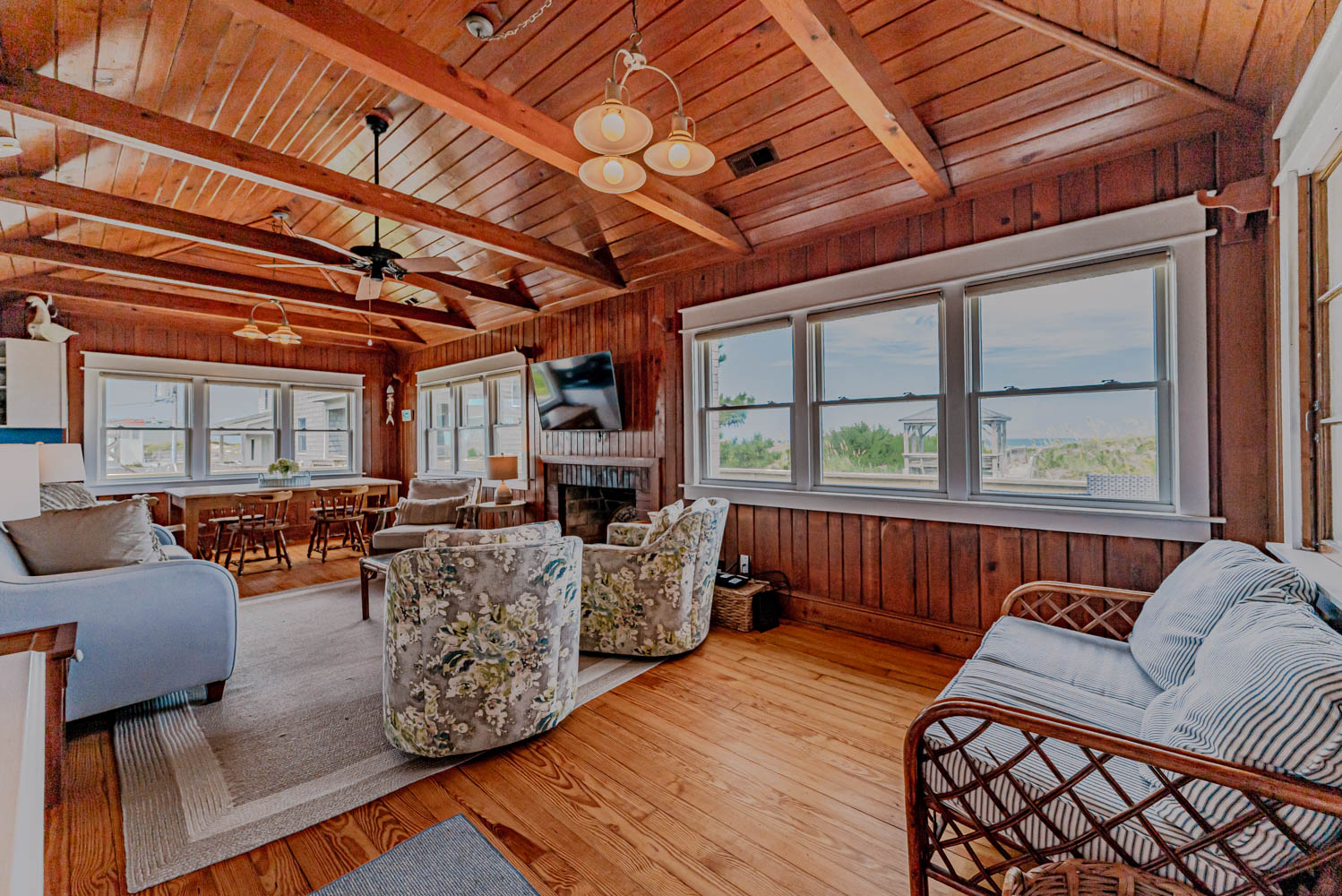 Main Level: Living Area w/ hardwood floors, beautiful tongue & groove pine walls, beamed ceiling, Flat Screen TV/DVD, Ocean Views, Dining Area w/Seating for 8, Kitchen, Half Bath, Private Suite w/King & Full Bath w/Walk-in Shower, & Sun Deck w/Deck Furniture & Ocean Views.