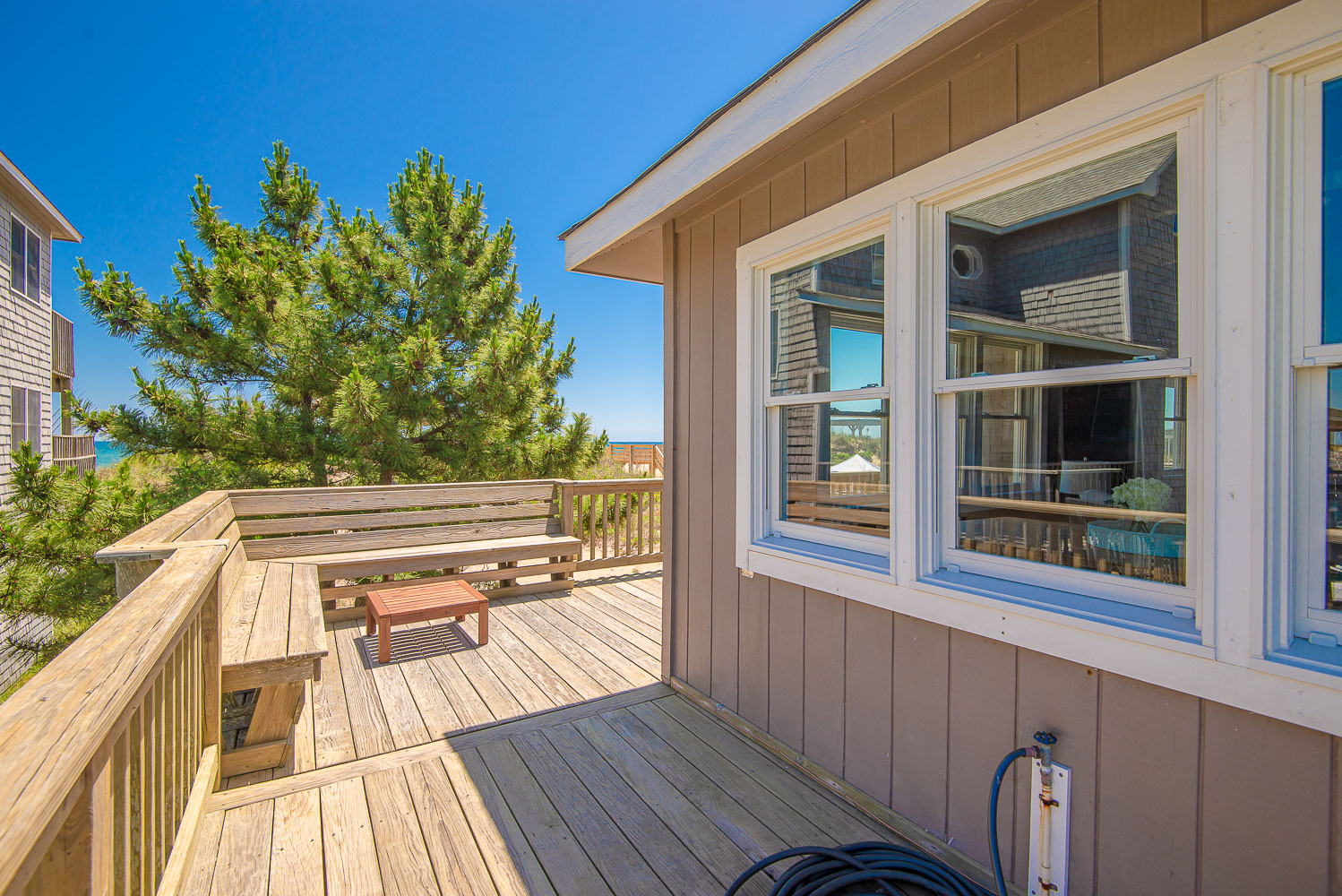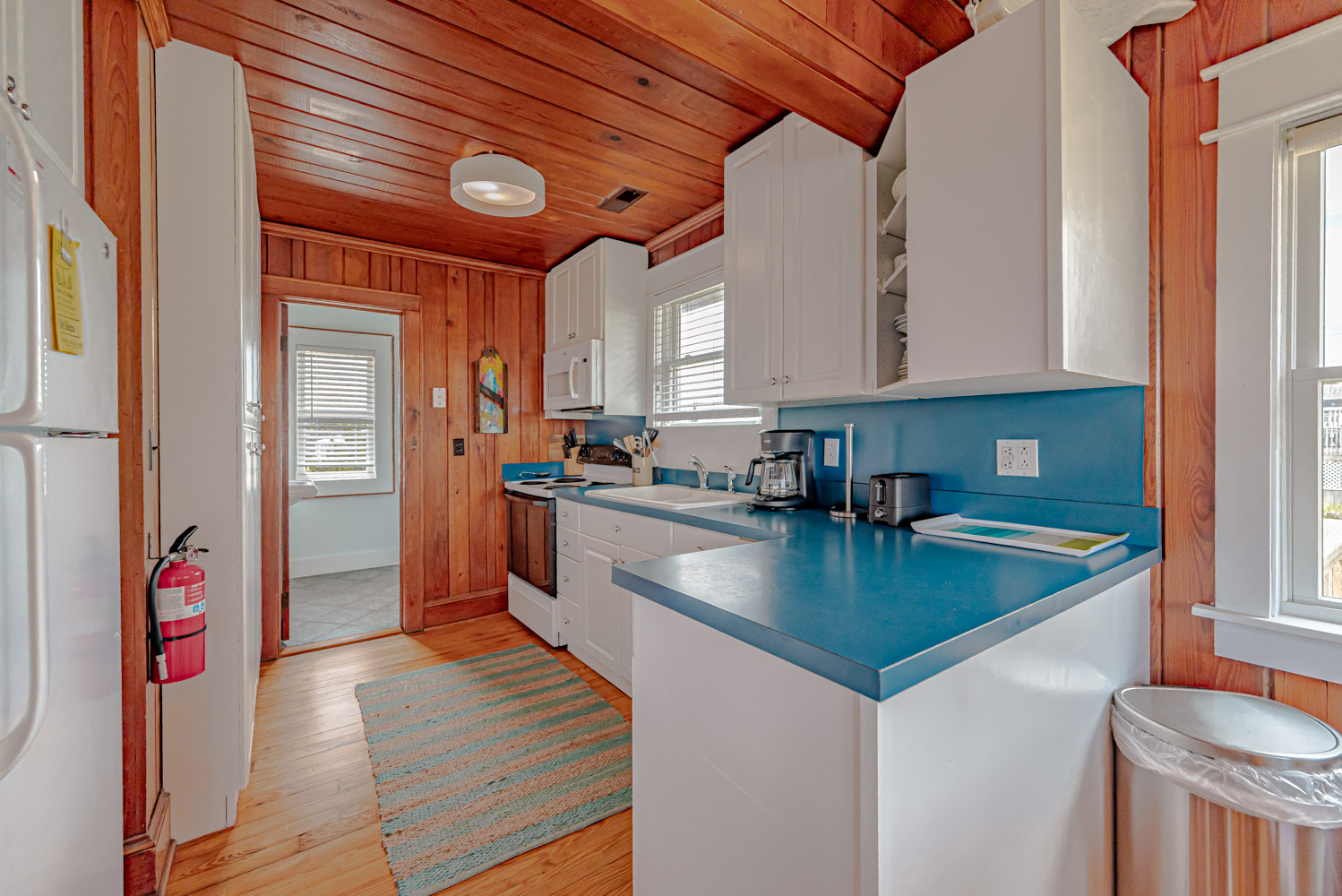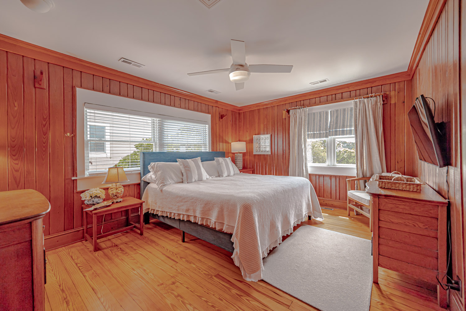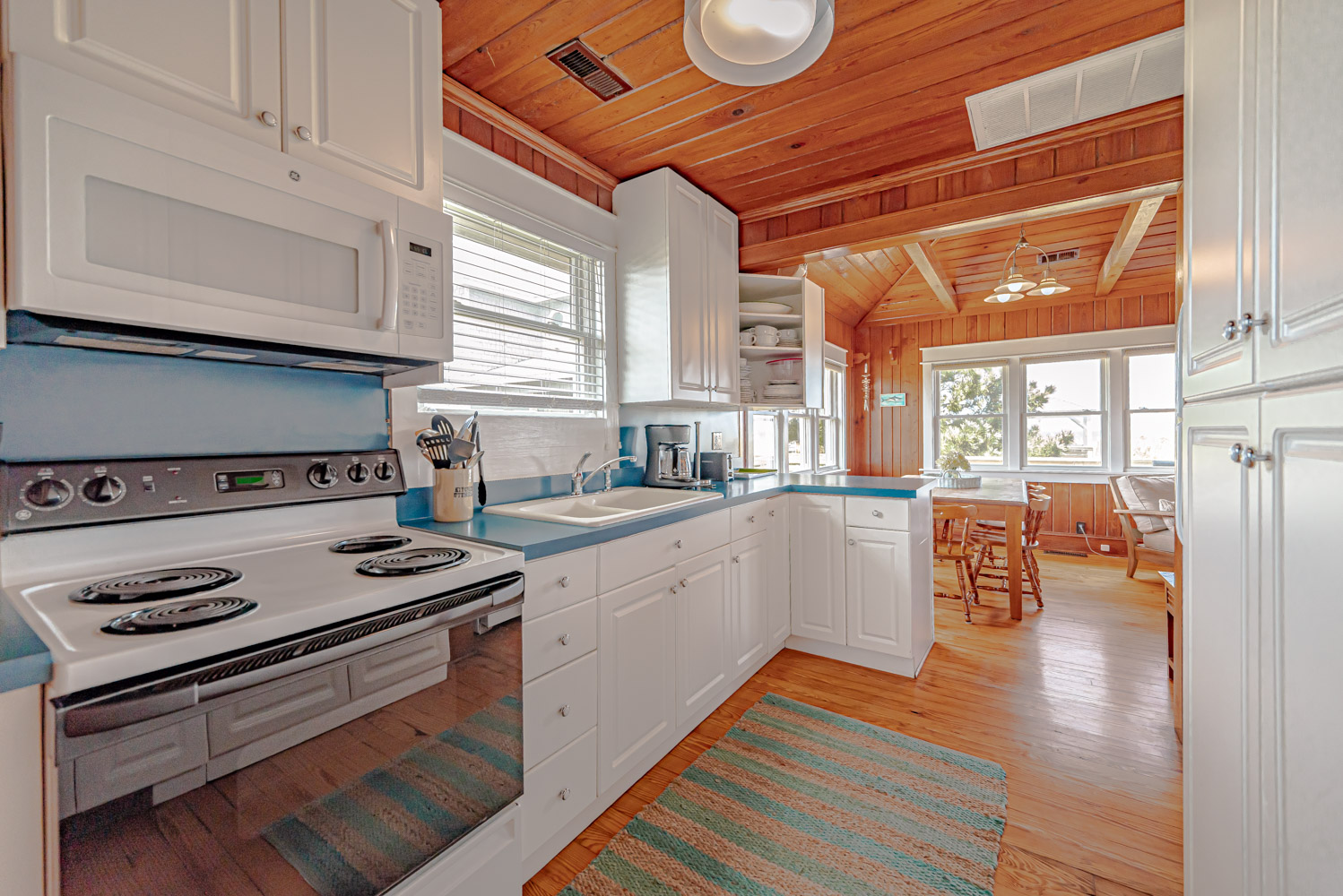 Main Level: Living Area w/ hardwood floors, beautiful tongue & groove pine walls, beamed ceiling, Flat Screen TV/DVD, Ocean Views, Dining Area w/Seating for 8, Kitchen, Half Bath, Private Suite w/King & Full Bath w/Walk-in Shower, & Sun Deck w/Deck Furniture & Ocean Views.