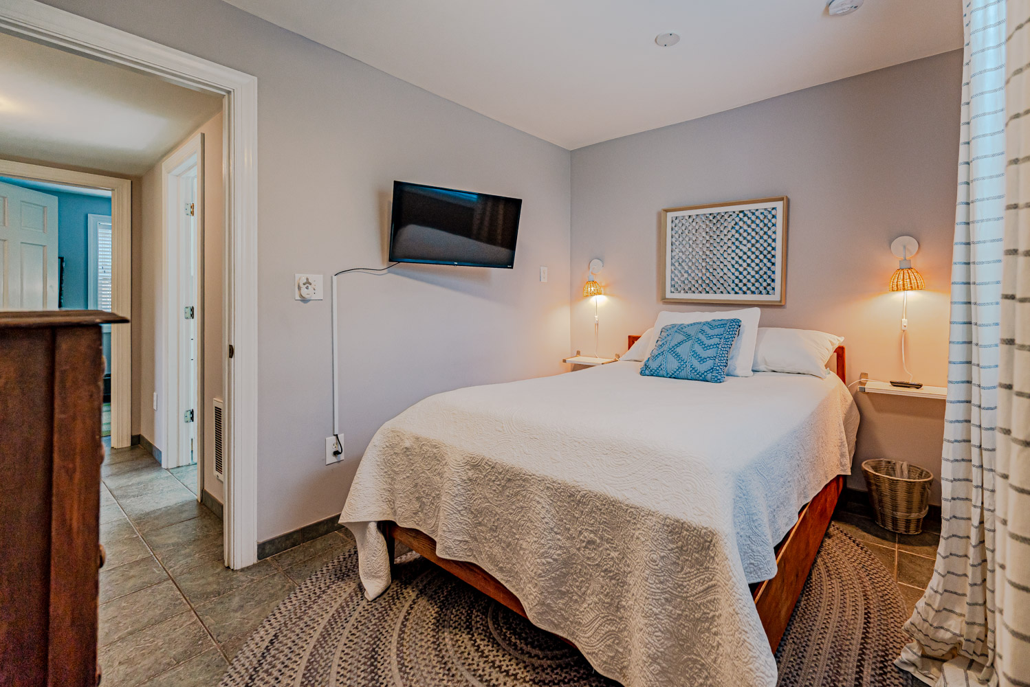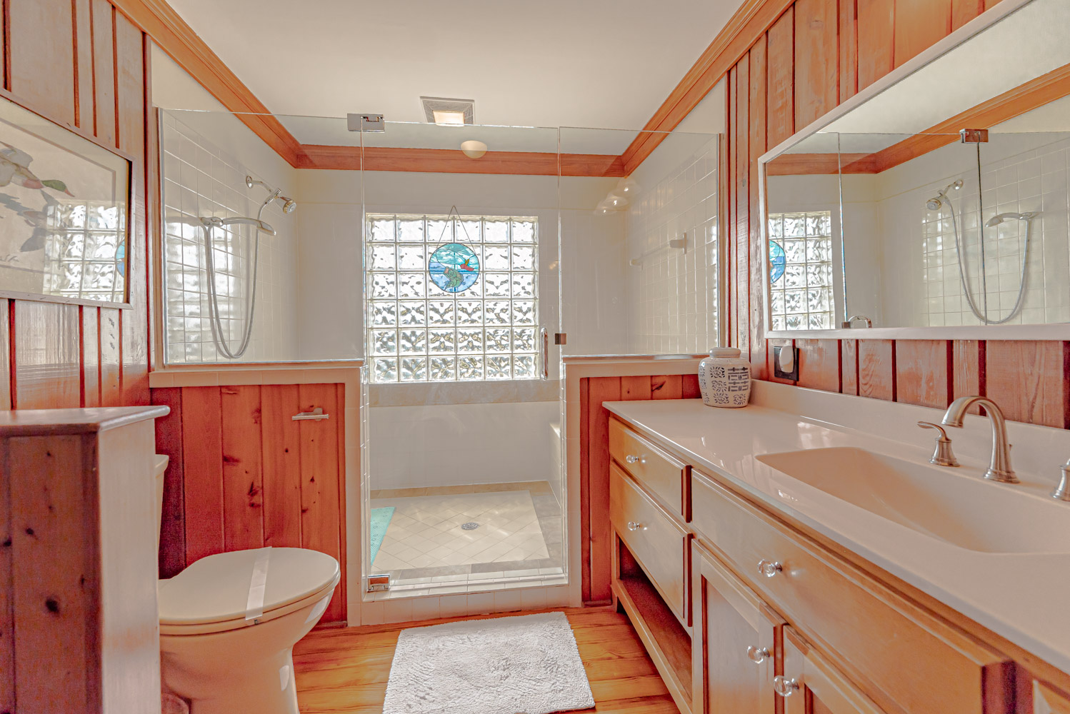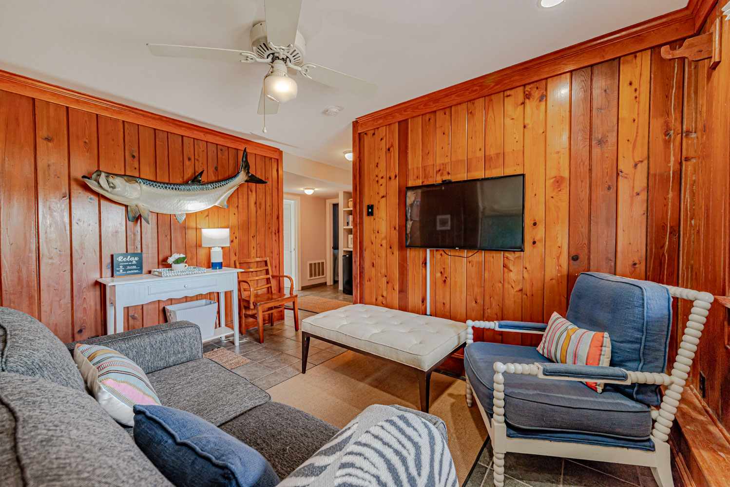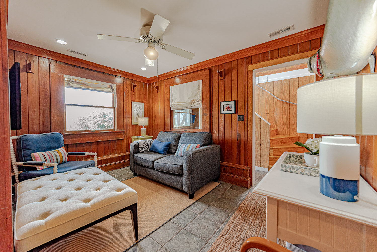 Main Level: Living Area w/ hardwood floors, beautiful tongue & groove pine walls, beamed ceiling, Flat Screen TV/DVD, Ocean Views, Dining Area w/Seating for 8, Kitchen, Half Bath, Private Suite w/King & Full Bath w/Walk-in Shower, & Sun Deck w/Deck Furniture & Ocean Views.