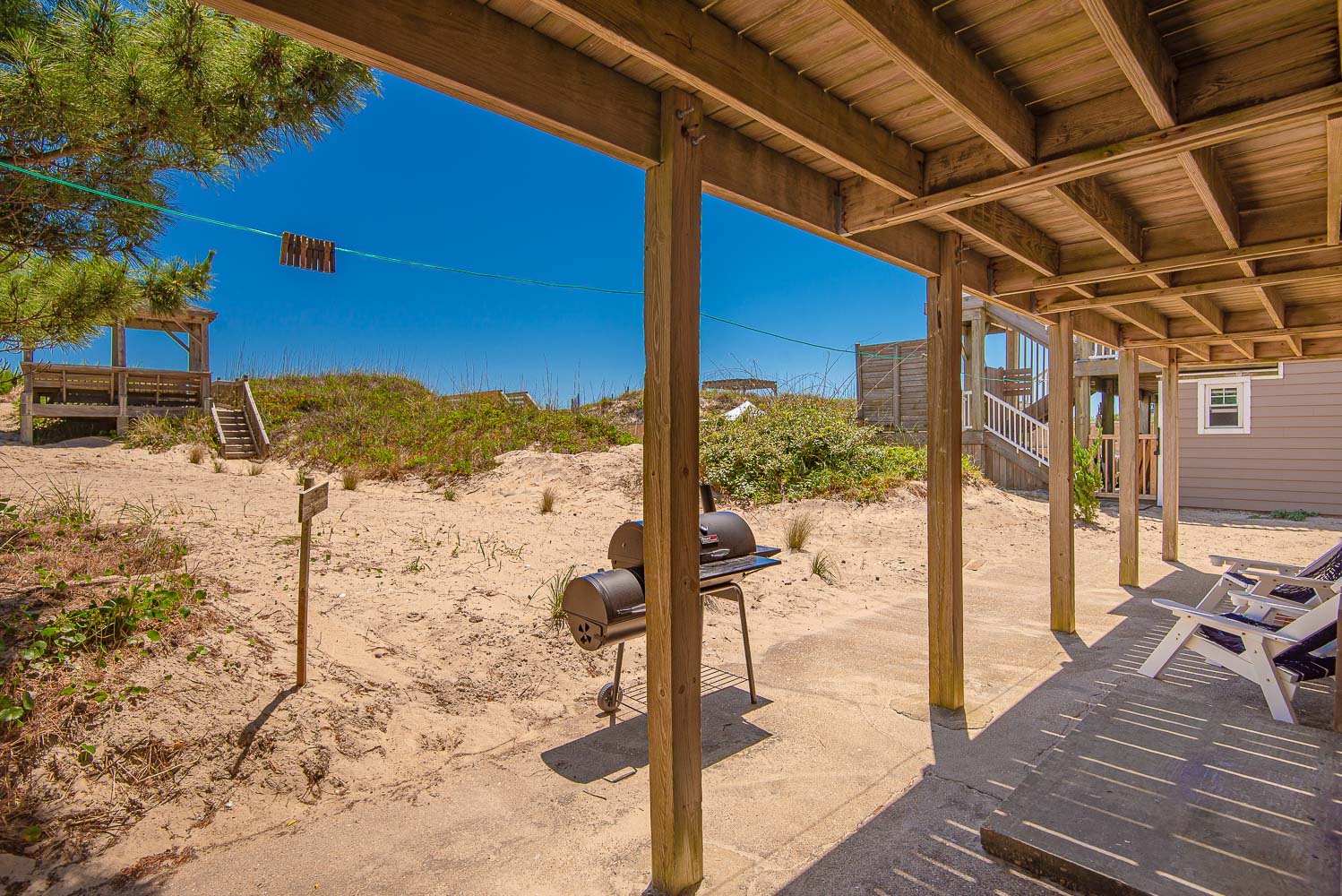 Ground Level: Parking for 4 Cars, Entry, Den w/TV, Mini-Refrigerator, Microwave, Coffee Maker, 3 Bedrooms (1 w/Queen, 1 w/Double, 1 w/2 Singles), Full Hall Bath, Laundry Area, & Enclosed Outside Shower, Charcoal Grill, & Sand Path to Dune Top Gazebo w/ Private Walkway to the beach.
