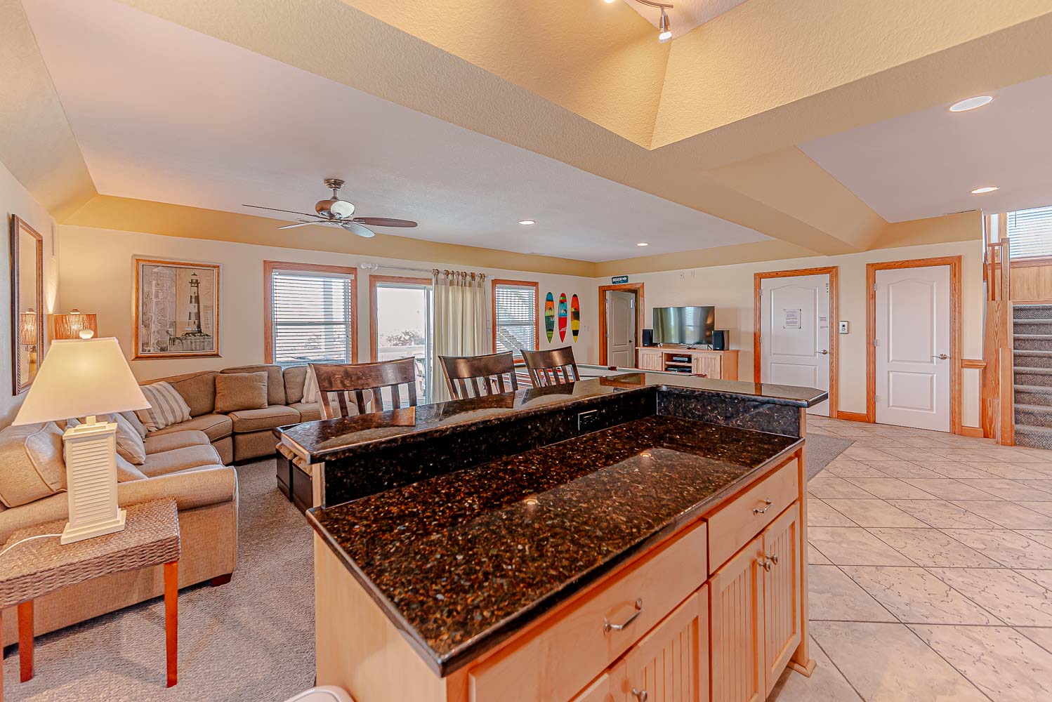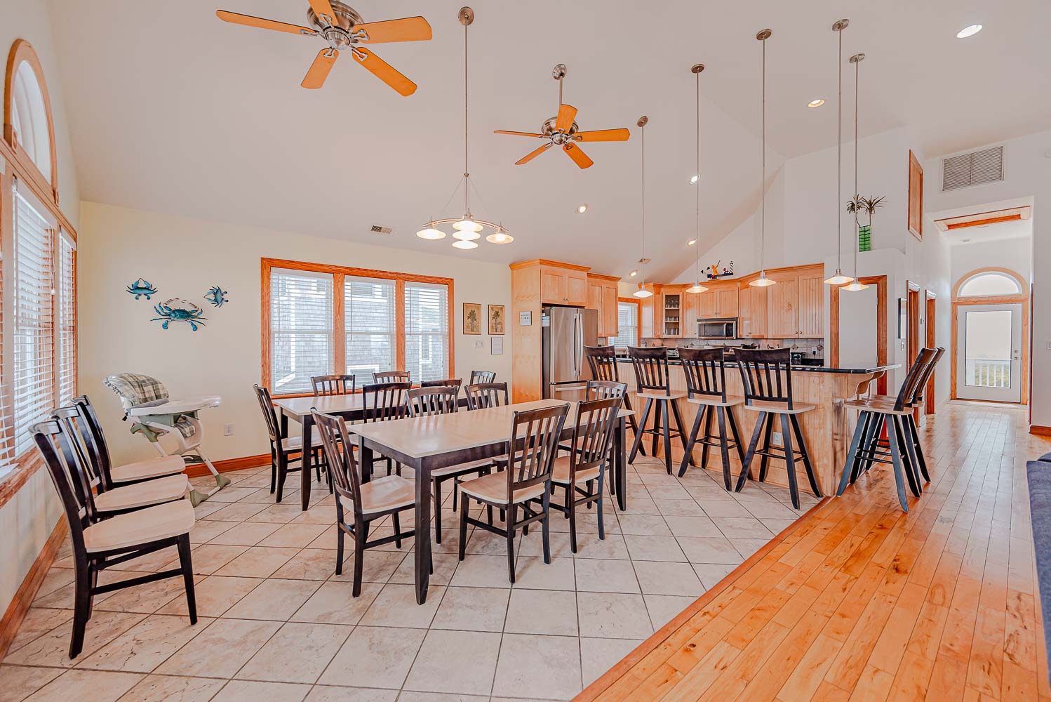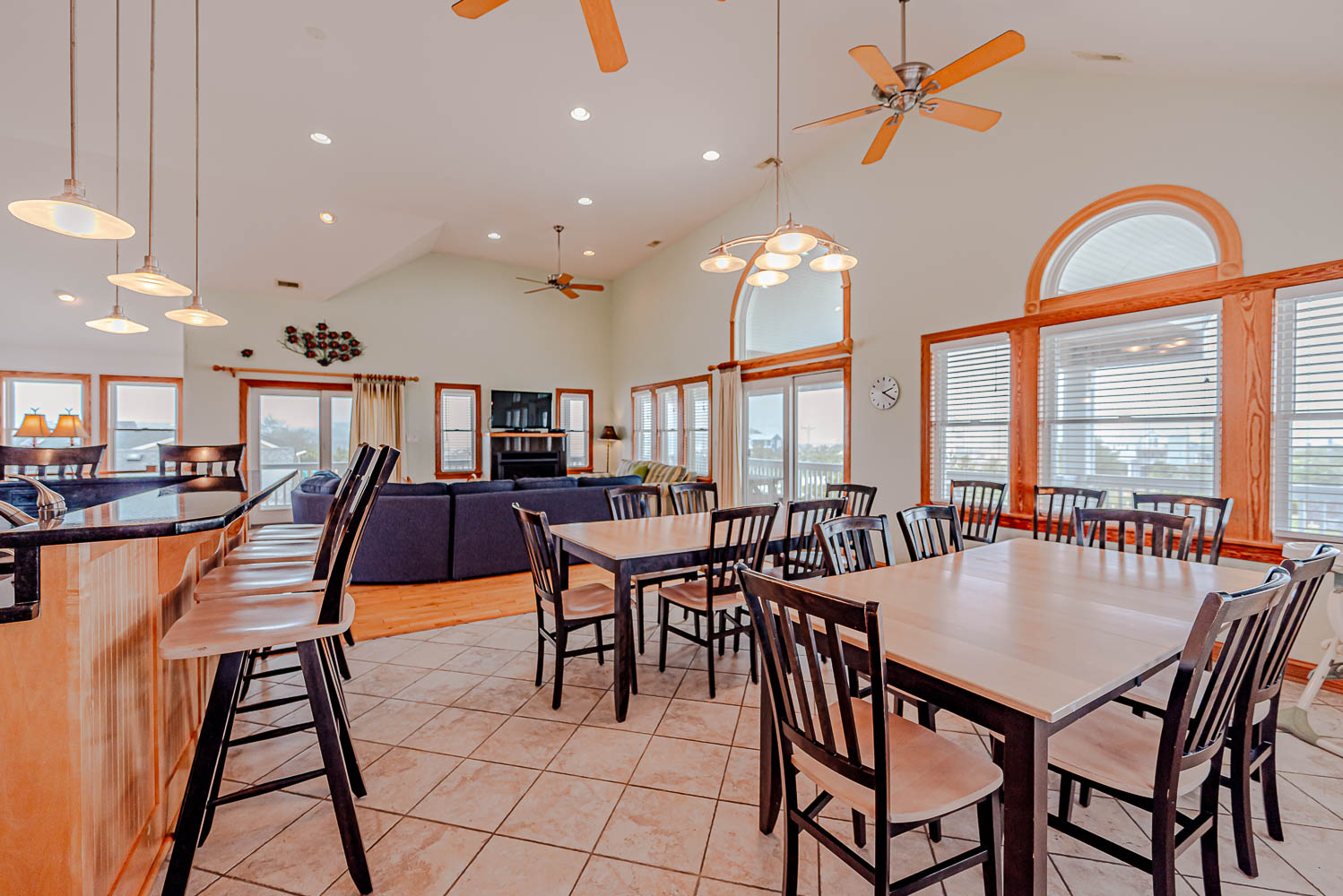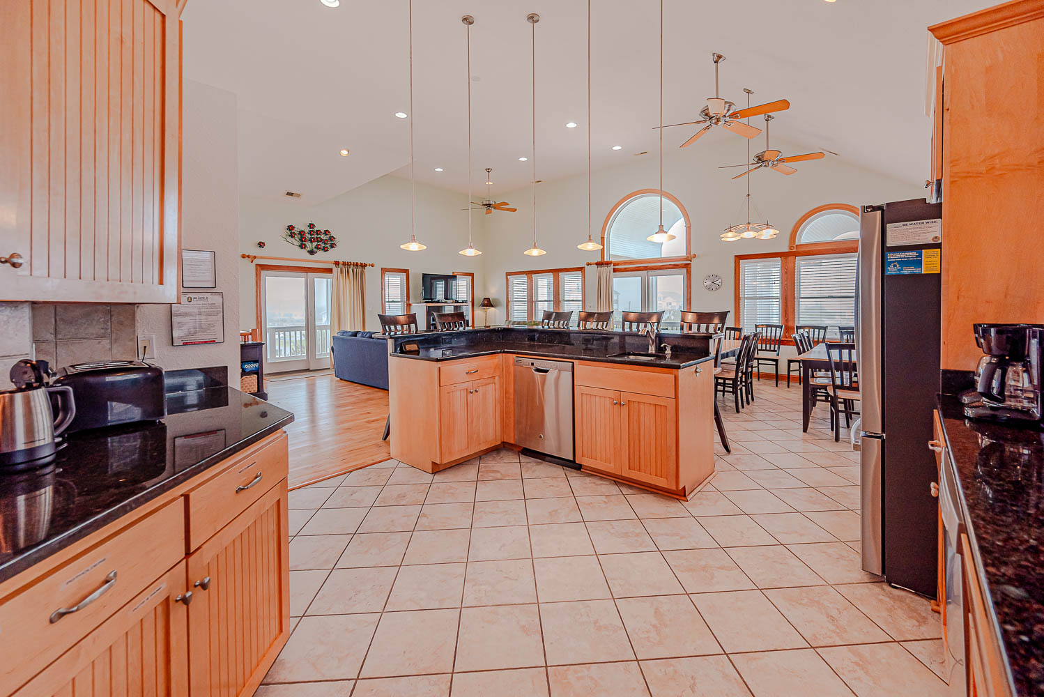 Top Level: Magnificent Great Room, Hardwood Floors, 14 Ft. Vaulted Ceilings, Ceiling Fans, Sliding Glass Door Access to Wrap Around Decking, Picnic Table, Benches, Rocking Chairs, and Ocean and Pier Views, 50 Inch Plasma HDTV, Blu-Ray/DVD, Well Stocked Kitchen, Custom Cabinetry, Granite Countertops, Pantry, Two Sink Areas, Stainless Steel Appliances, 2 Dishwashers, Range/Oven, Microwave, Refrigerator w/Ice Maker; Dining Area Seats 16 People; Half Bath, 2 Private Suites w/Queens, HDTVs, Blu-Ray/DVDs, Full Baths (One w/Completely Tiled Shower), Sliding Glass Doors to Back Deck; and Separate Hall Door to Back Deck w/Views of Cape Hatteras National Seashore and Wildlife.