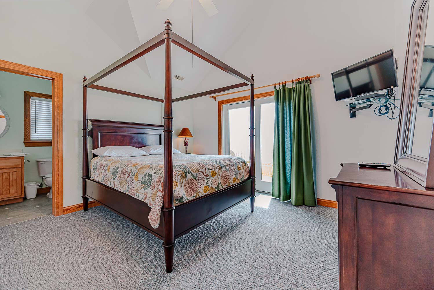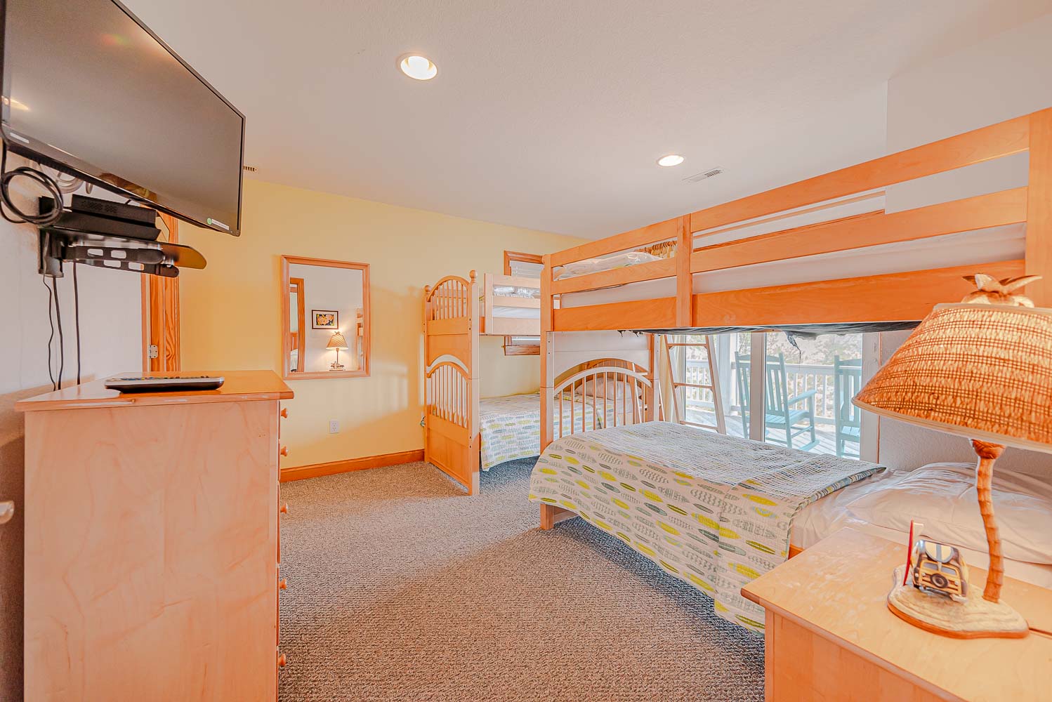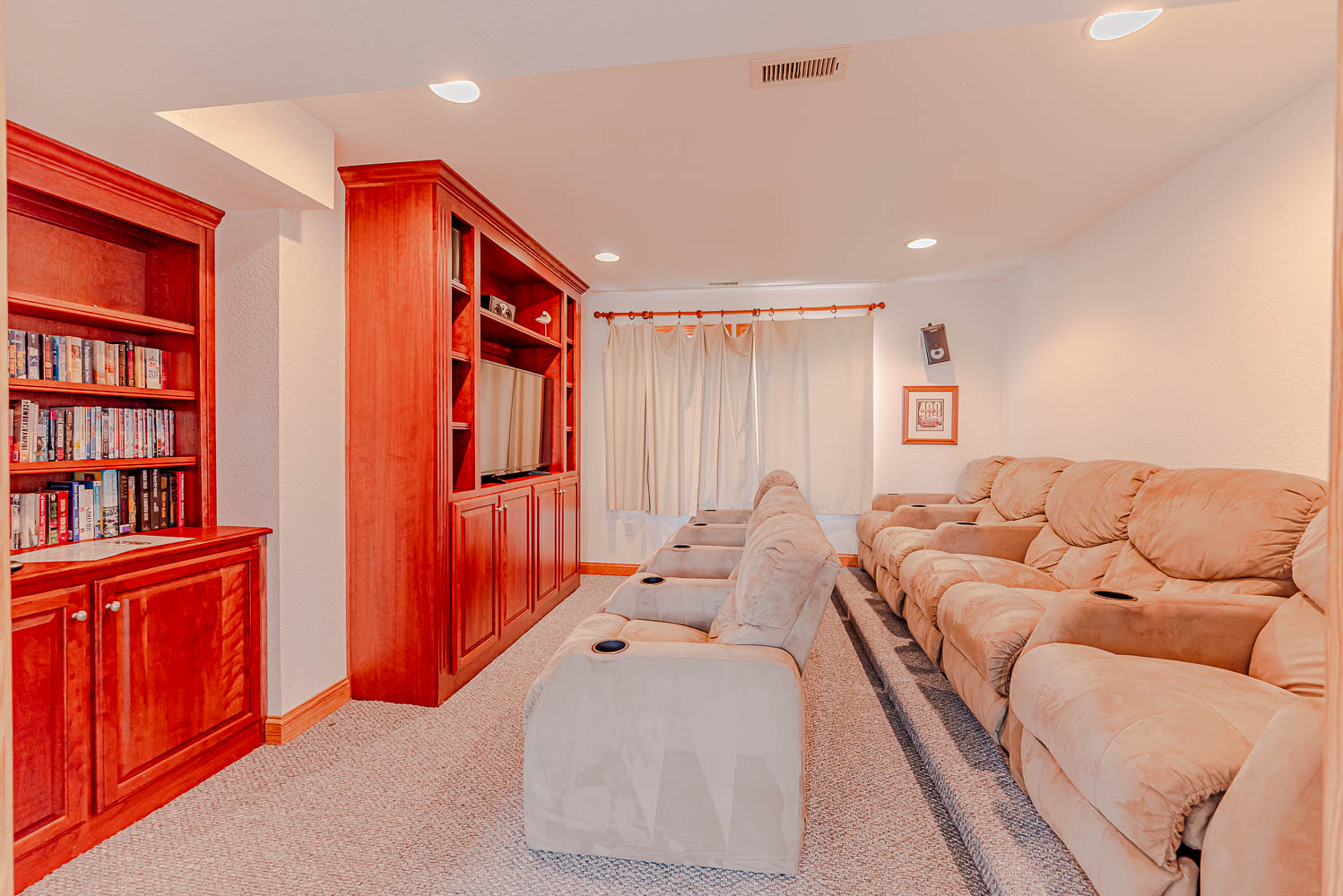 Mid Level: Incredible Theater Room w/Surround Sound, 50 Inch Plasma HDTV, Blu-Ray/DVD, Reclining Theater Seats, Custom Cabinetry, Sound-Deadening Walls; 4 Bedrooms (Private Suite w/King, HDTV, Blu-Ray/DVD, Full Bath, Sliding Glass Doors to Covered Deck; 2 Private Suites w/Queens, HDTV, Blu-Ray/DVD, Full Baths (One w/Completely Tiled Shower), Sliding Glass Doors to Covered Deck; 1 w/2 Bunk Sets, HDTV, Blu-Ray/DVD, Full Bath, Sliding Glass Doors to Covered Deck); and Laundry Area.