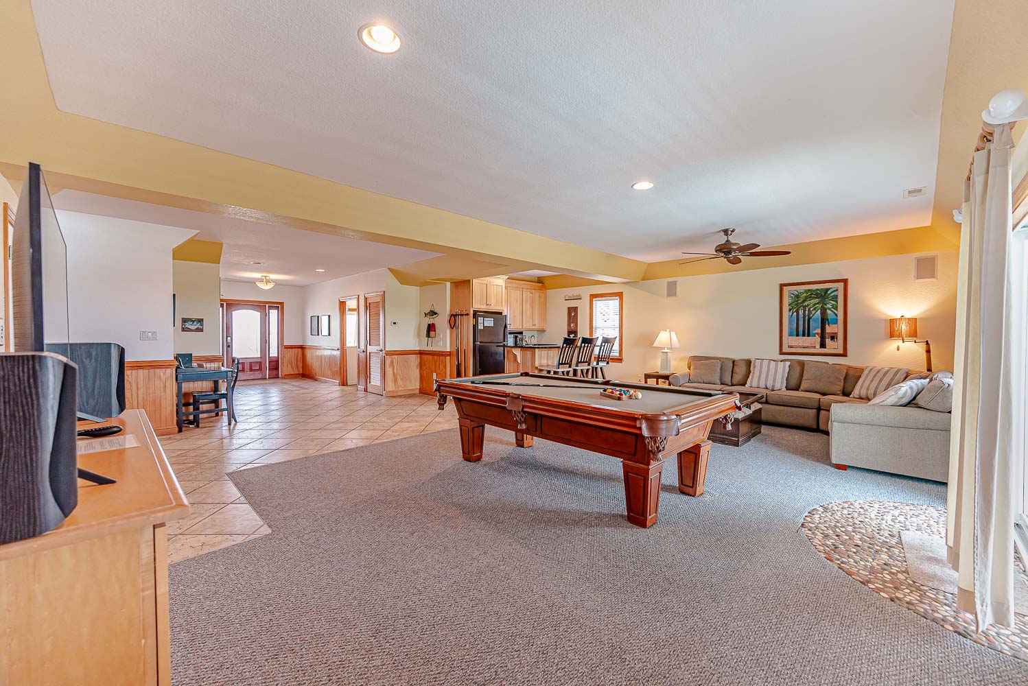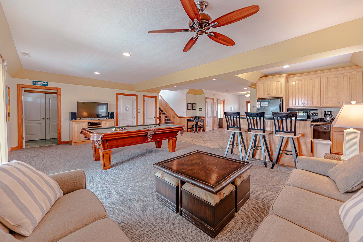 First Level: Elevator, Rec. Room, Full Size Pool Table, 55 Inch Ultra HD Smart TV w/Surround Sound, Blu-Ray/DVD, Kitchenette/Bar w/Seating, Granite Countertops, Dishwasher, Full Size Refrigerator w/Ice Maker, Stand Alone Ice Maker, Microwave, Sink; 2 Bedrooms (Private Suite w/Queen, HDTV, Blu-Ray/DVD, Full Bath w/Completely Custom Tiled, Two-Person Shower w/Upgraded Fixtures, Sliding Glass Door to Covered Deck; Private Suite w/Duo Bunk, HDTV, Blu-Ray/DVD, Full Bath w/Completely Custom Tiled, Two-Person Showers w/Upgraded Fixtures, Sliding Glass Door to Covered Deck), Laundry Area, and Half Bath w/Direct Access to Patio Area.