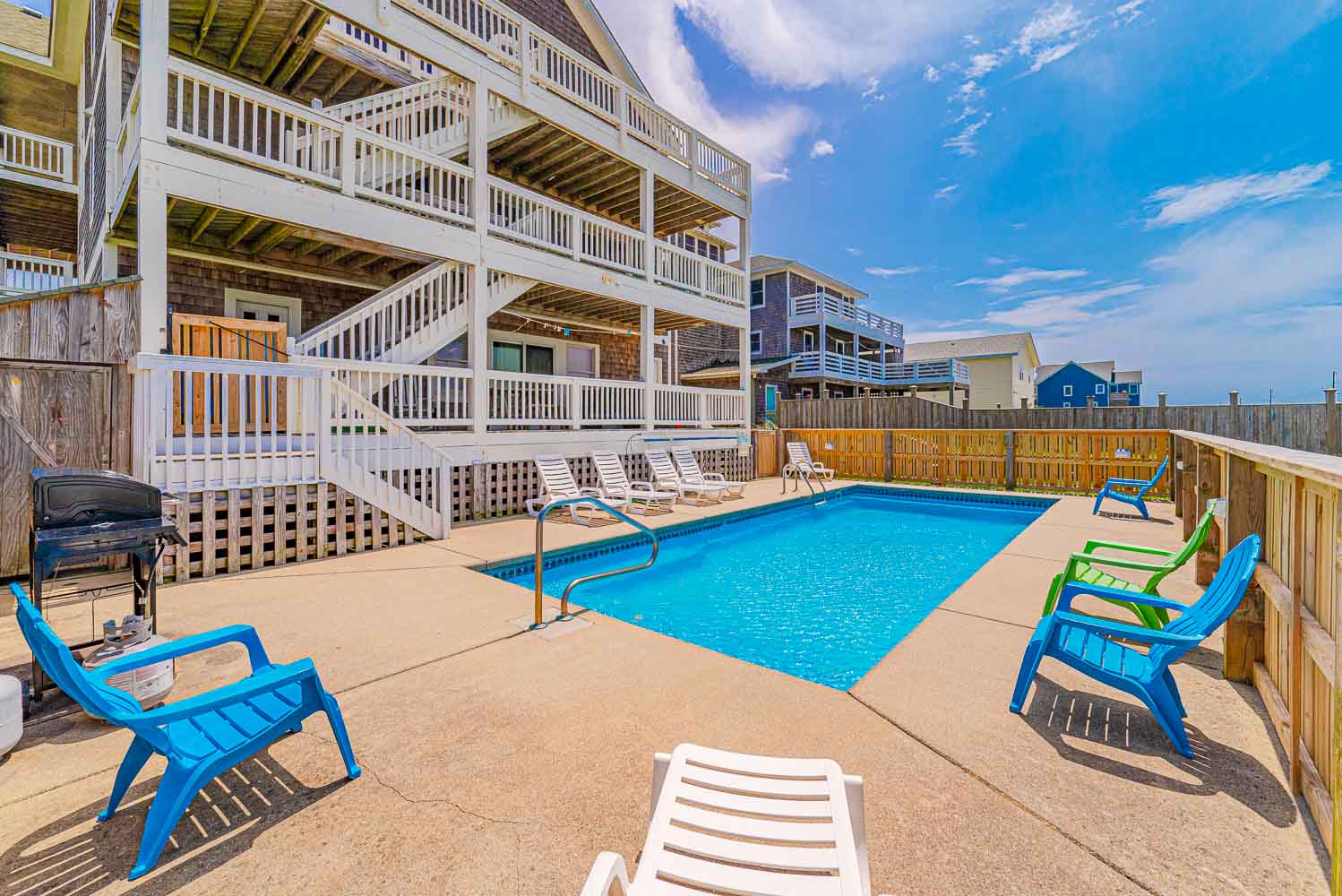 Ground Level: Parking for 7 Cars, 9 Steps Covered Entry into Level 1, Private 14x33 Heated Swimming Pool - Open Seasonally, (Heated at No Extra Charge - Please Bear in Mind that Pool Temperature is Subject to Outside Temperatures and Conditions), 7 Person Hot Tub, Enclosed Outside Showers, Fish Cleaning Station, and Gas Grill.