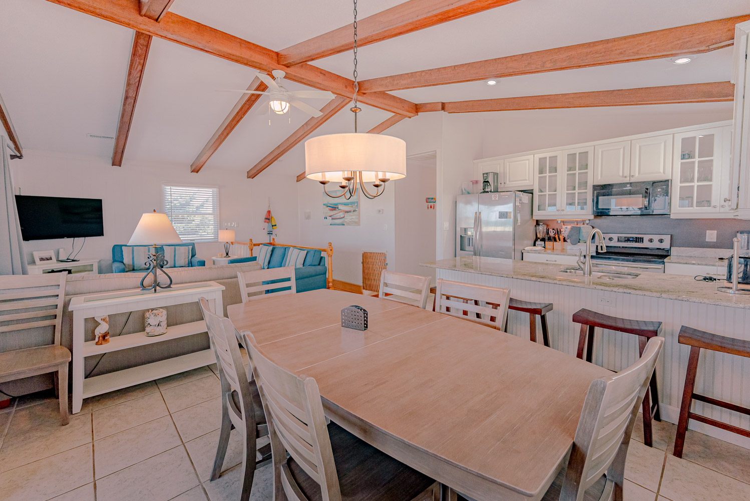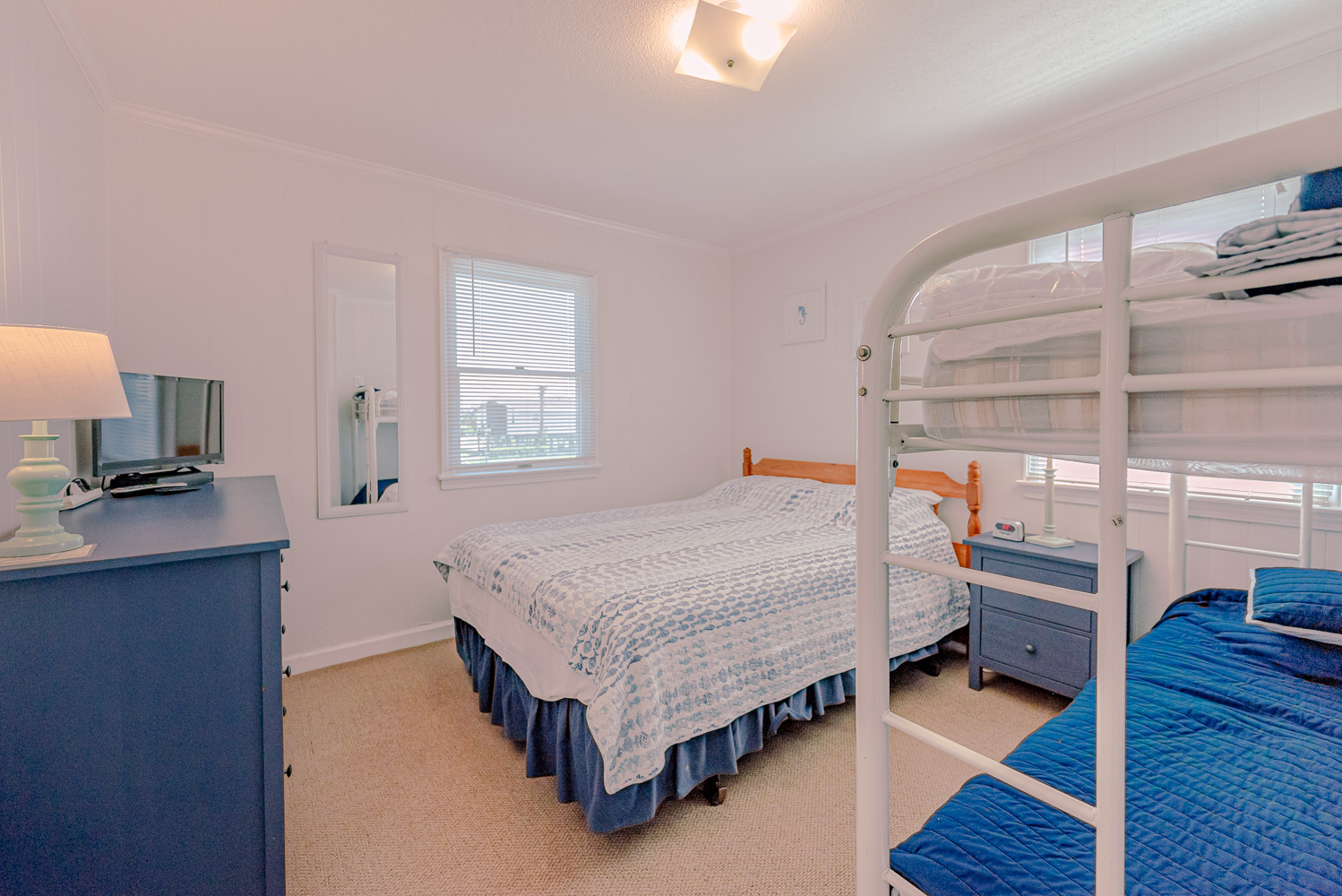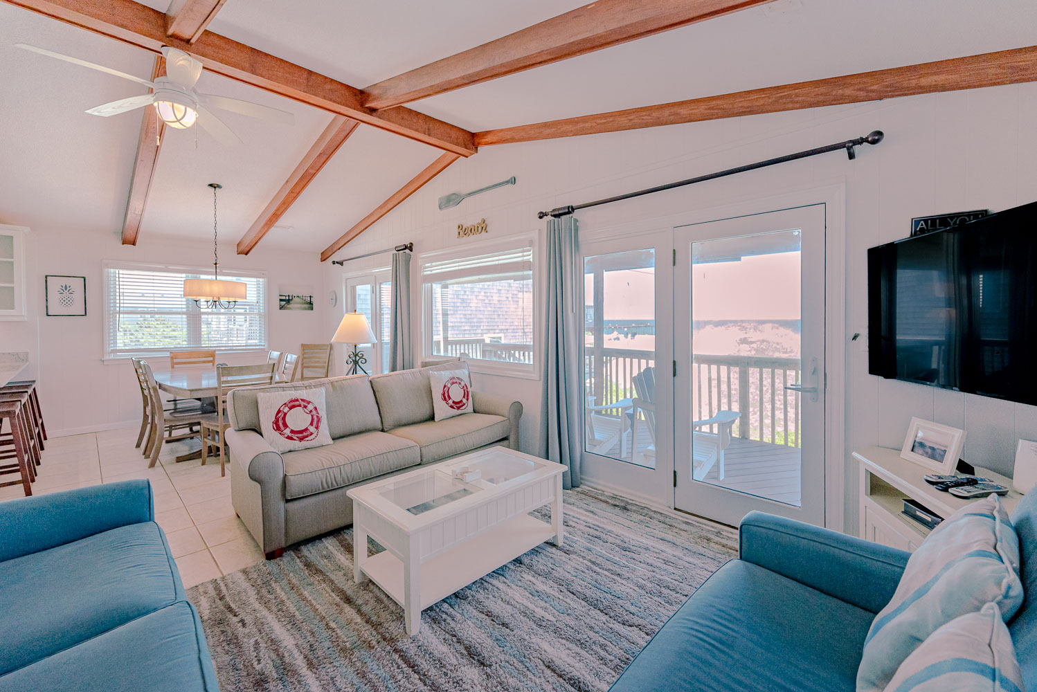 Top Level: Expanded Living Area, 50 Inch Roku TV, Netflix, Amazon Video, MLB Full Season Package; New, Well Equipped Kitchen, New Appliances; Dining Area; 3 Bedrooms (Private Suite w/Queen, Full Bath w/Shower, Roku TV; 1 w/Queen, Roku TV; 1 w/Queen, Roku TV), Shared Full Bath w/Tub/Shower, Covered Deck w/Deck Furniture and Ocean Views, and Steps to Tower/Crow’s Nest.