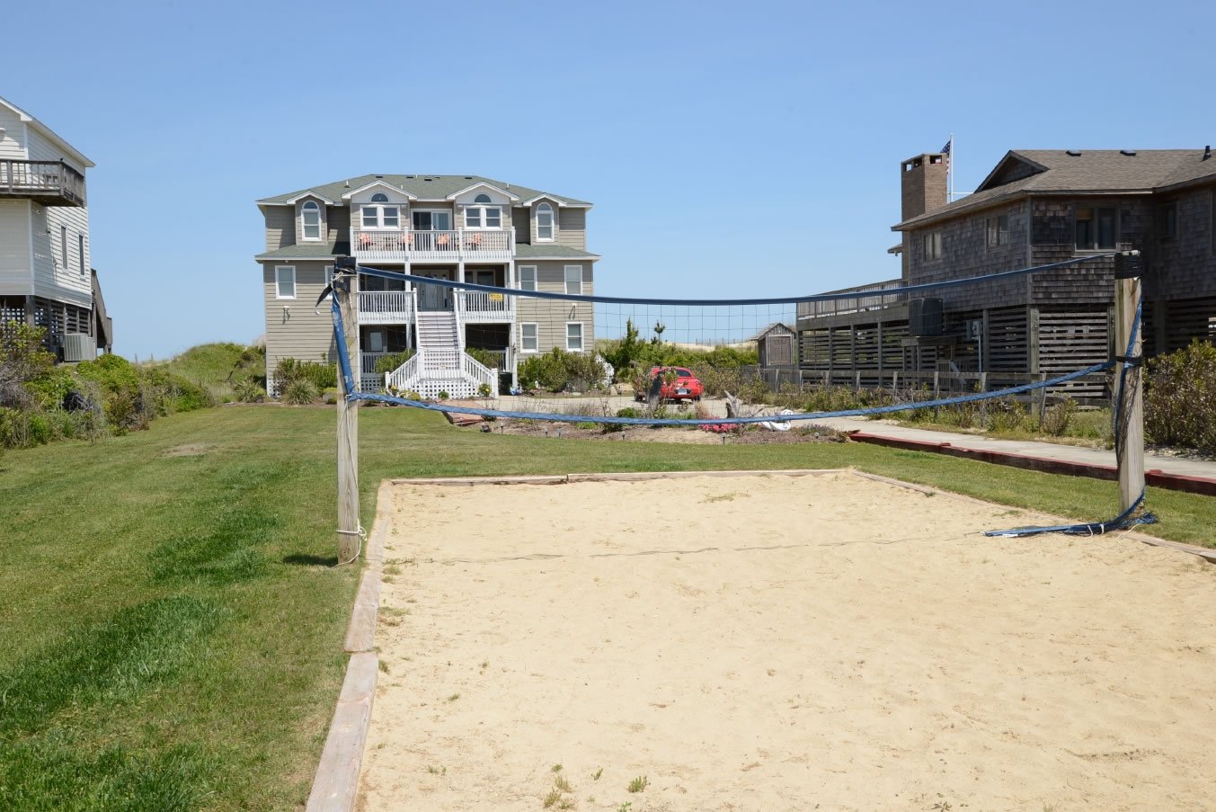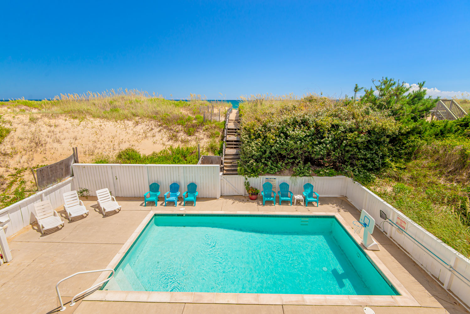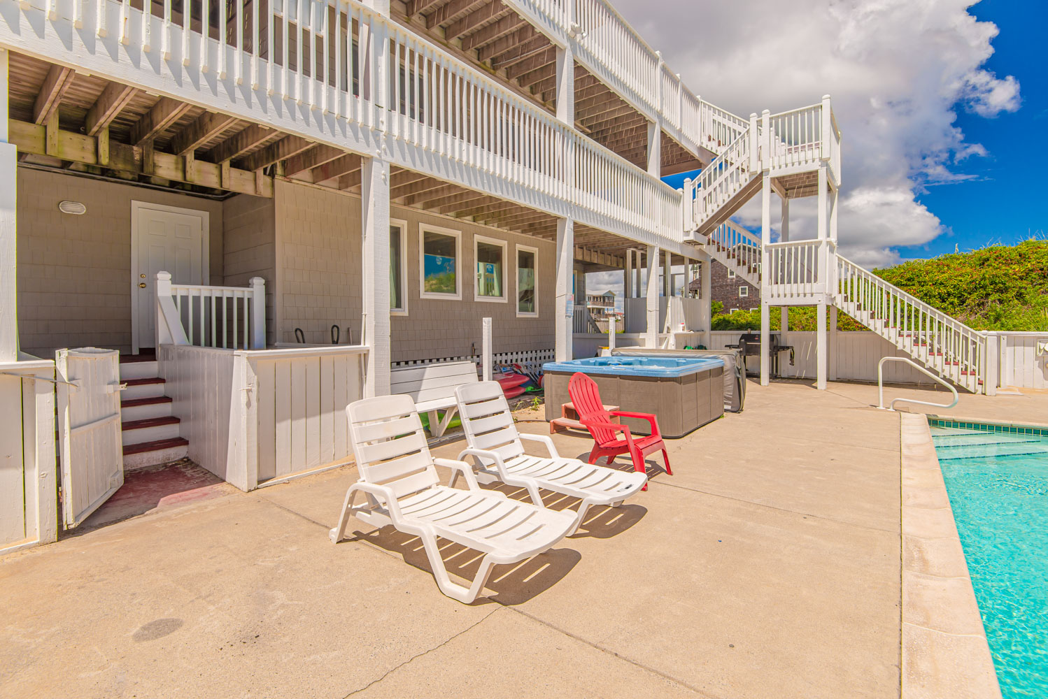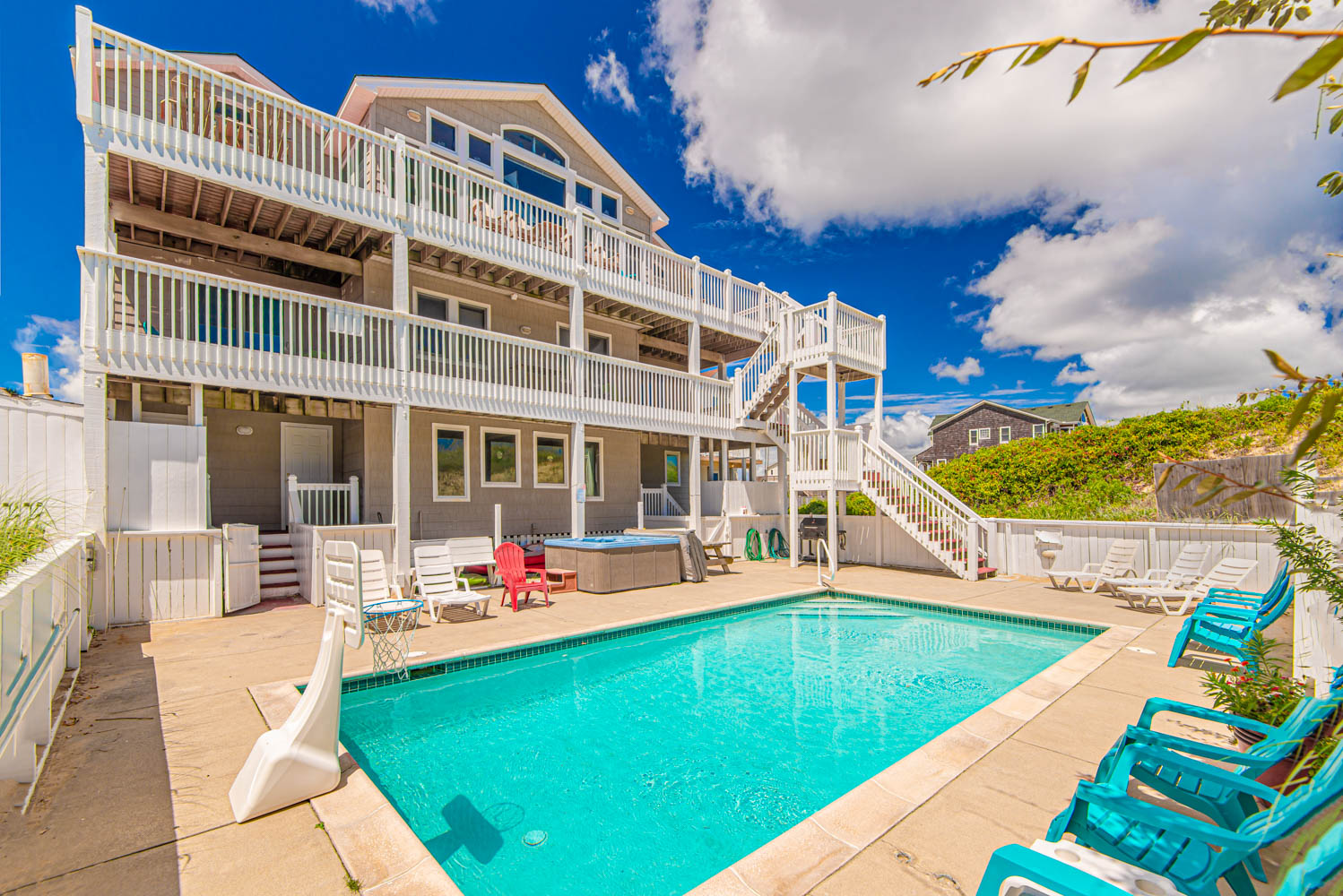 Ground Level: Parking for 9+ Cars, Six Steps to First Level Covered Entry, Foyer, Large Rec. Room w/Pool Table, Wet Bar w/Refrigerator, Microwave, Dishwasher, TV, Stereo, Half Bath (Accessible from Rec. Room & Pool Area), Laundry w/2 Washer/Dryer Sets, & Another Refrigerator, 4 Bedrooms (1 w/Queen & TV, 1 w/Duo Bunk w/Trundle & TV, 1 w/Queen & TV, 1 w/2 Bunk Sets & TV), 2 Shared Baths, Access to Landscaped Yard w/Volleyball Court, Private 16x32 Heated Swimming Pool - Open Seasonally (Can Be Heated for $475.00 Per Week, Plus Tax. Pool Temperature is Subject to Outside Temperatures and Conditions), 6 Person Hot Tub, Enclosed Outside Shower, Fish Cleaning Station, Charcoal Grill, & Walkway to Beach w/Dune Top Deck.