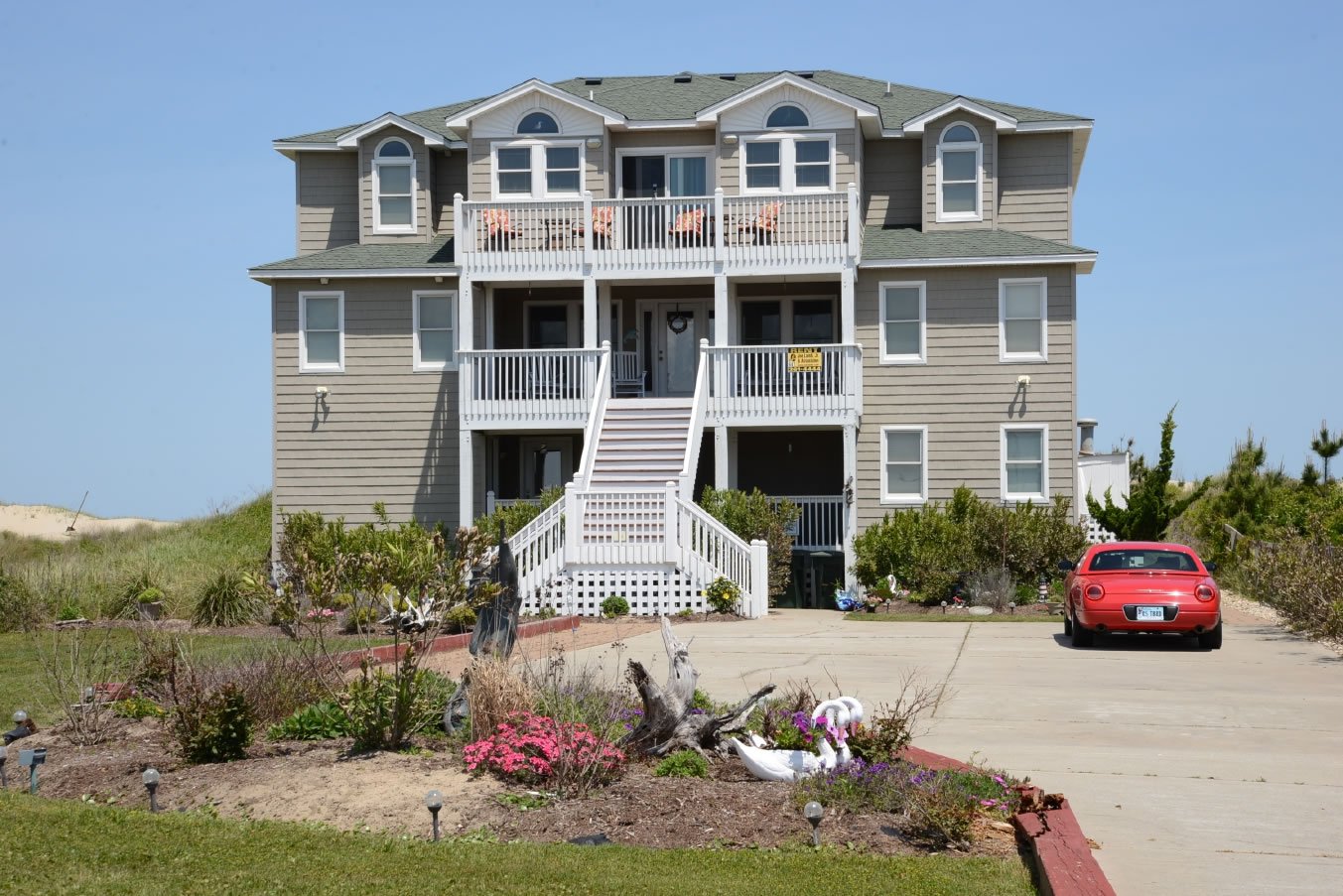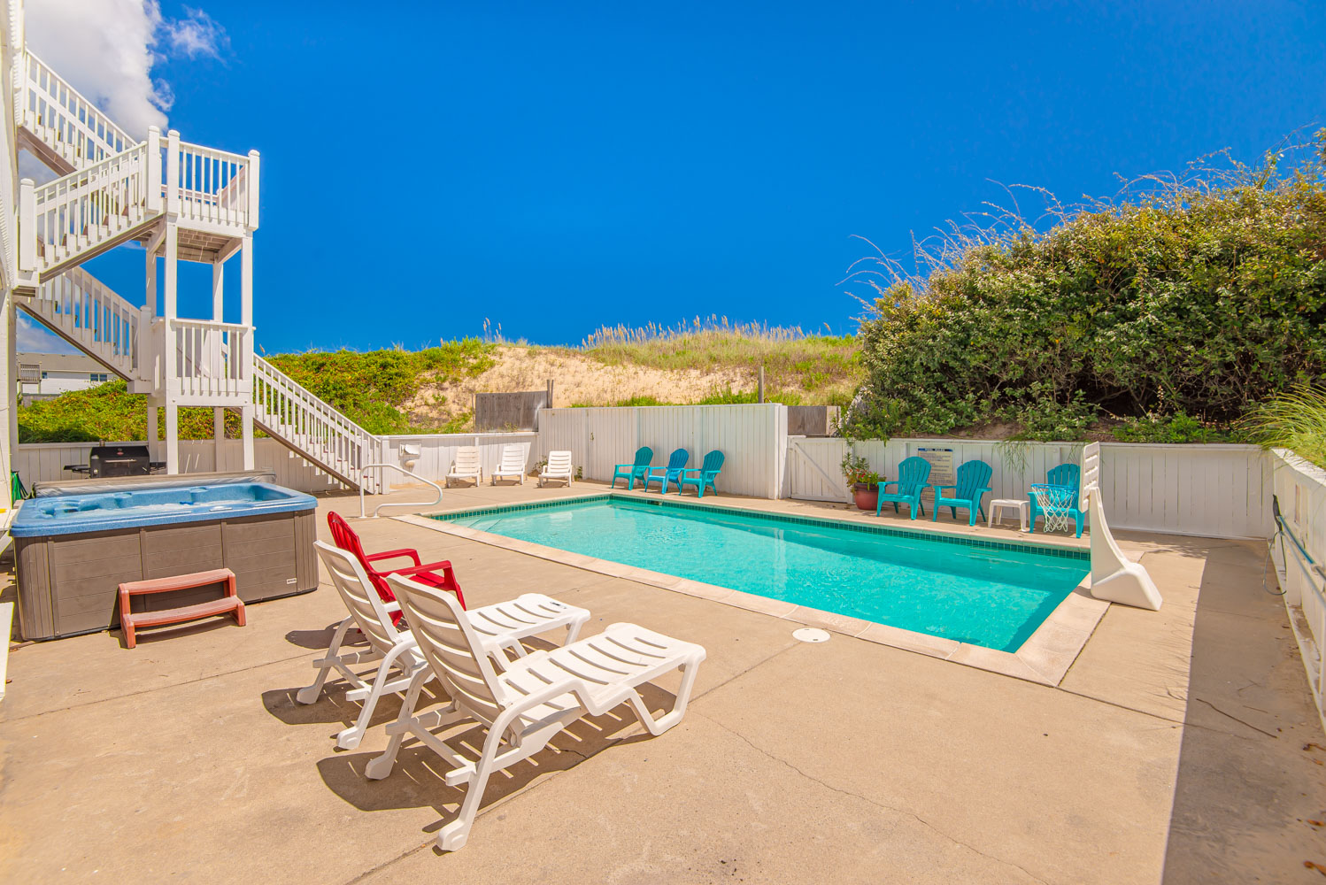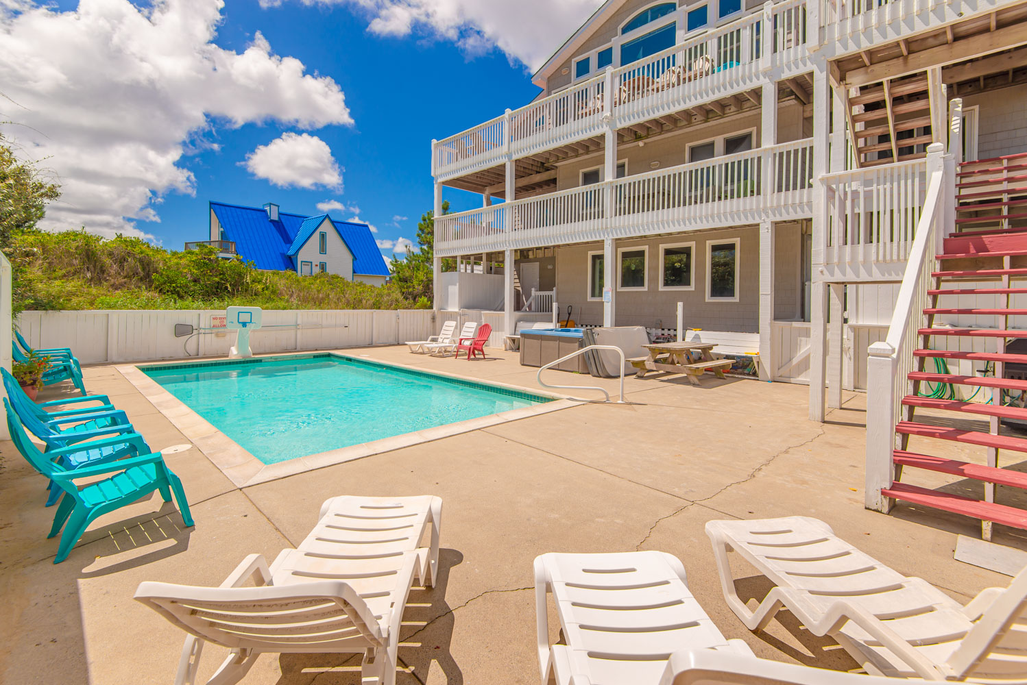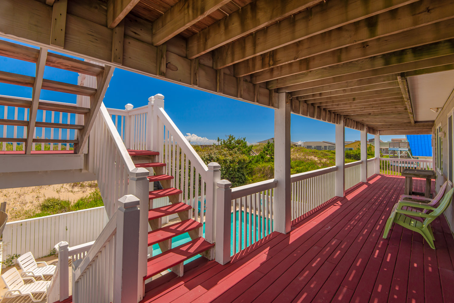 Ground Level: Parking for 9+ Cars, Six Steps to First Level Covered Entry, Foyer, Large Rec. Room w/Pool Table, Wet Bar w/Refrigerator, Microwave, Dishwasher, TV, Stereo, Half Bath (Accessible from Rec. Room & Pool Area), Laundry w/2 Washer/Dryer Sets, & Another Refrigerator, 4 Bedrooms (1 w/Queen & TV, 1 w/Duo Bunk w/Trundle & TV, 1 w/Queen & TV, 1 w/2 Bunk Sets & TV), 2 Shared Baths, Access to Landscaped Yard w/Volleyball Court, Private 16x32 Heated Swimming Pool - Open Seasonally (Can Be Heated for $475.00 Per Week, Plus Tax. Pool Temperature is Subject to Outside Temperatures and Conditions), 6 Person Hot Tub, Enclosed Outside Shower, Fish Cleaning Station, Charcoal Grill, & Walkway to Beach w/Dune Top Deck.