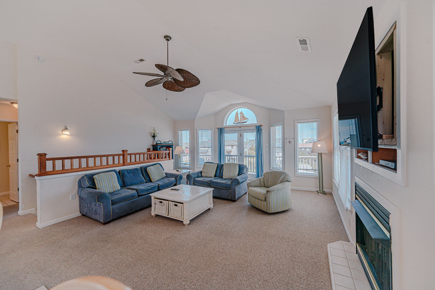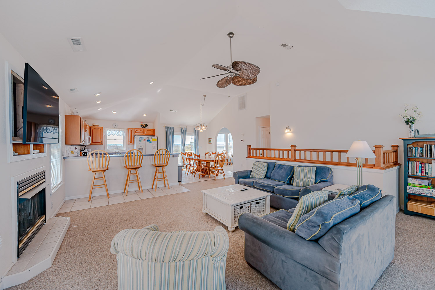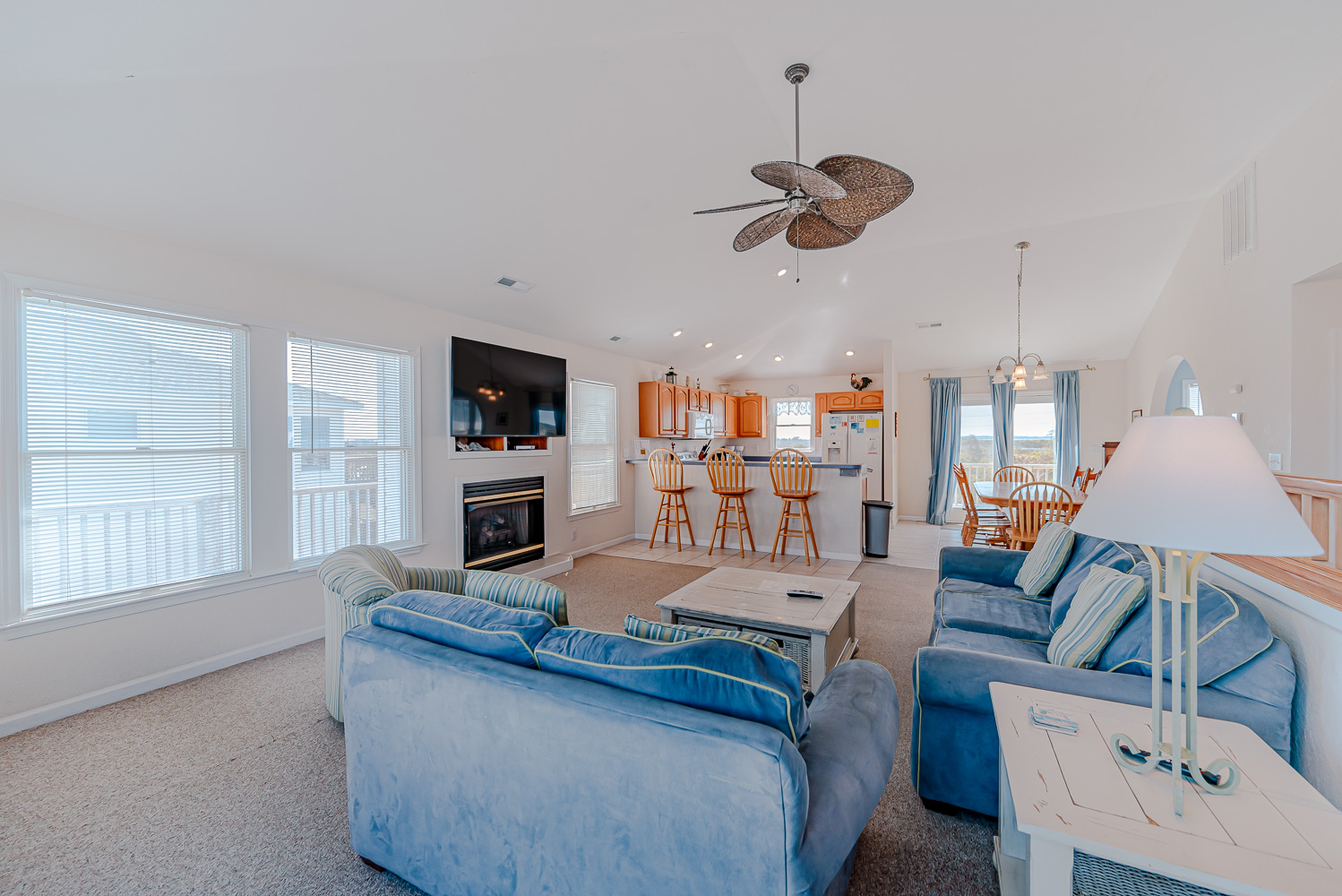 Top Level: Living/Dining/Kitchen Area, Large Smart TV, Gas Fireplace, Sunset Room, Half Bath, Private Suite w/Queen, Flat Screen TV, DVD, Full Bath, and Wrap Around Deck.