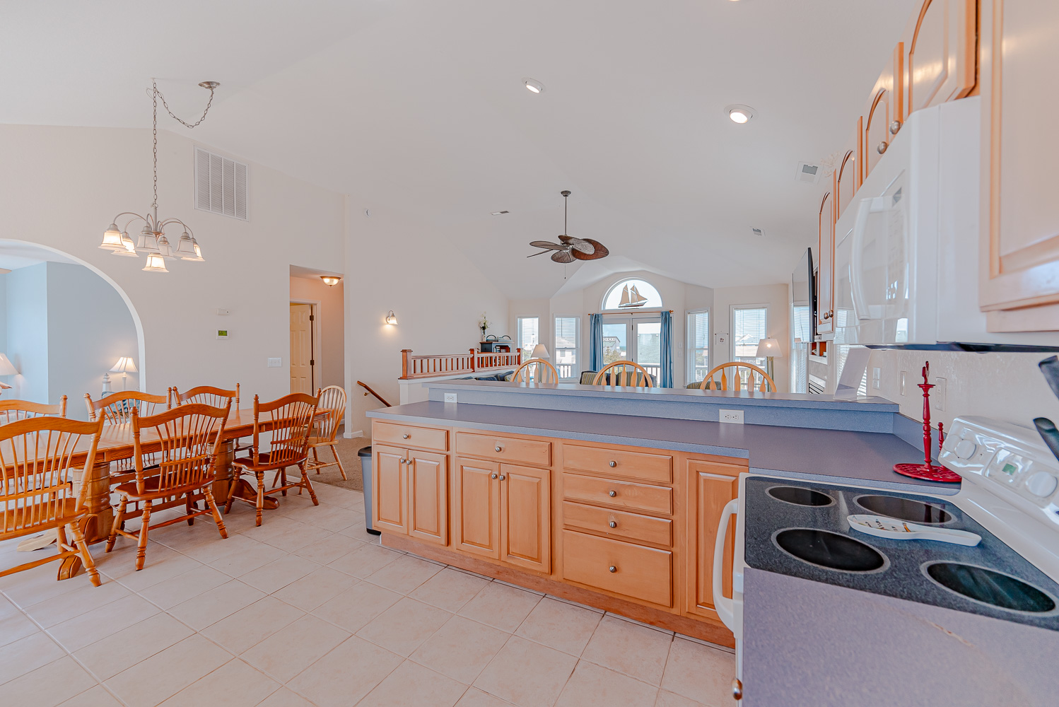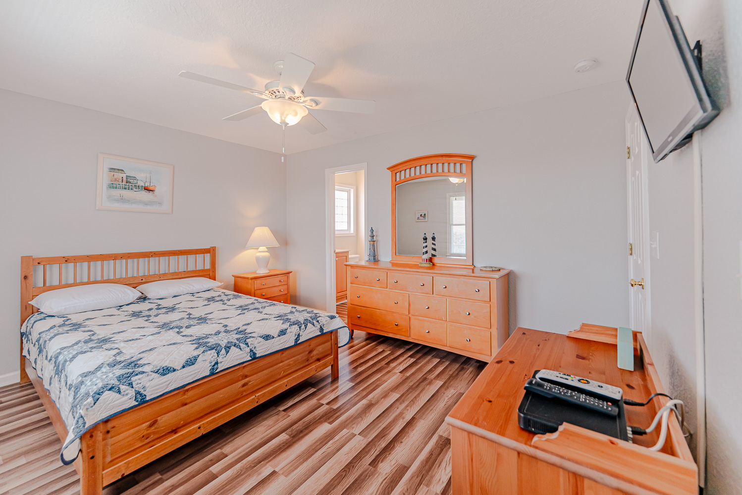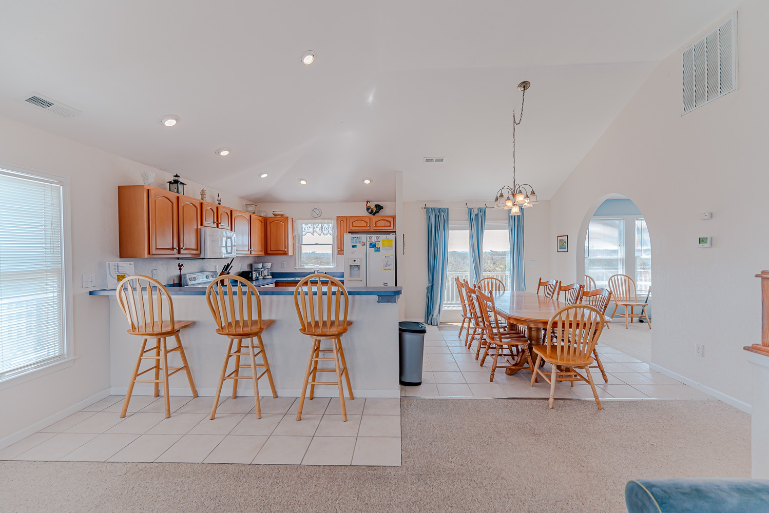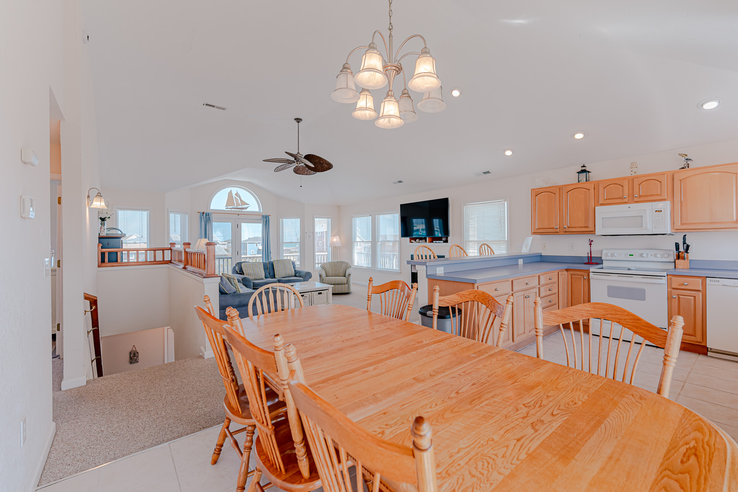 Top Level: Living/Dining/Kitchen Area, Large Smart TV, Gas Fireplace, Sunset Room, Half Bath, Private Suite w/Queen, Flat Screen TV, DVD, Full Bath, and Wrap Around Deck.